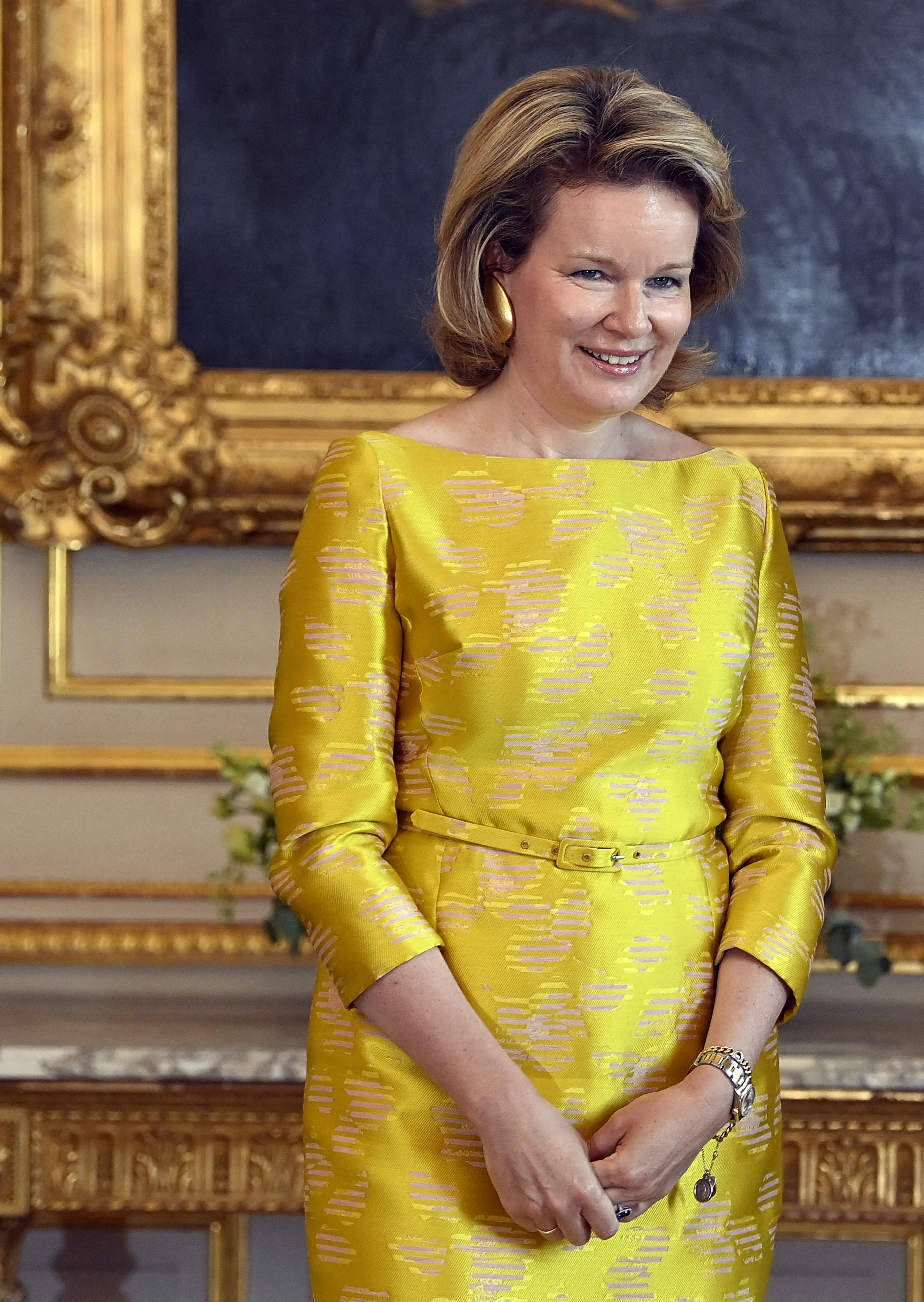 Koningin Mathilde zette de nieuwe hofleveranciers in het zonnetje en koos daarvoor een toepasselijke outfit in zonnig geel. Deze jurk van het Belgische modehuis Natan hing al in haar kast.