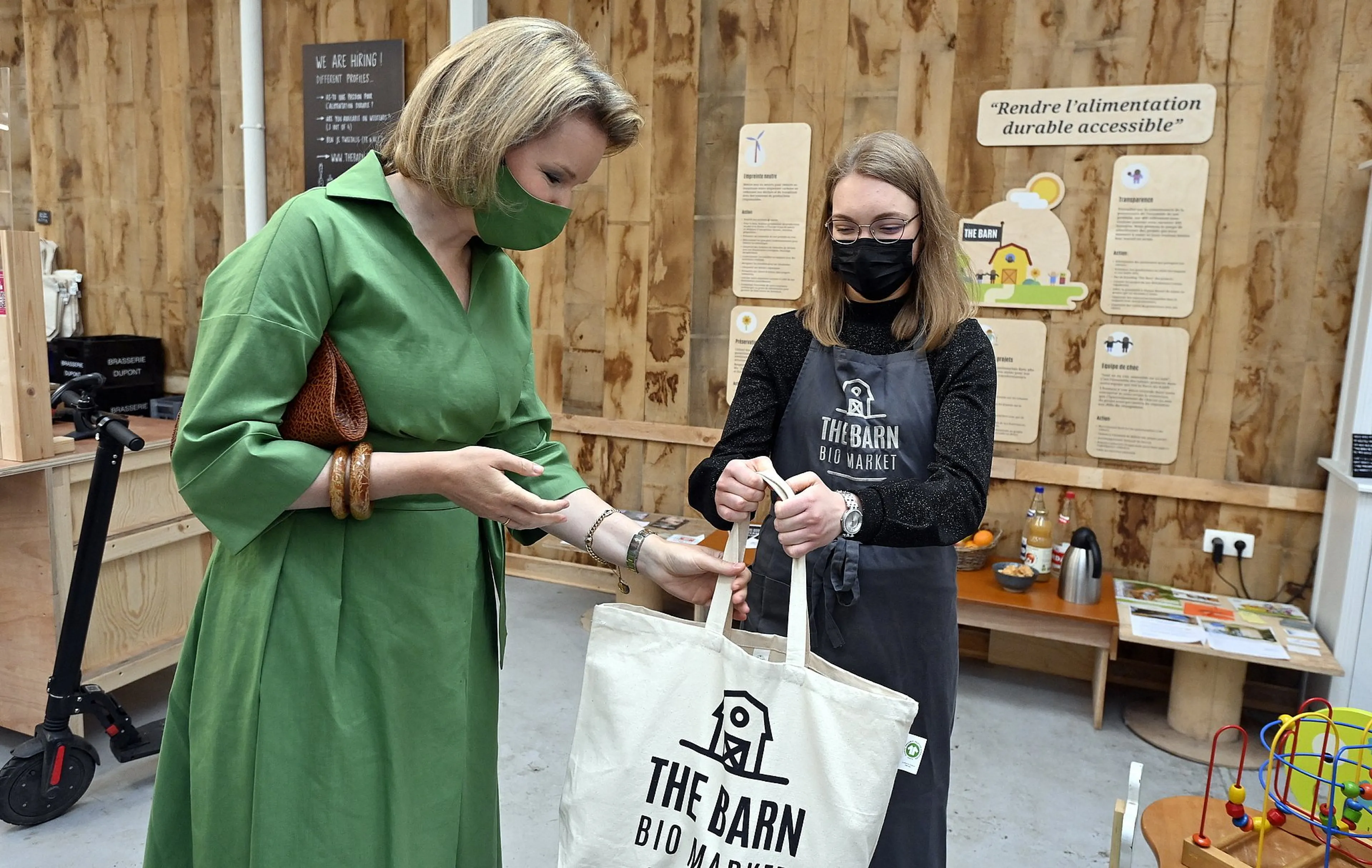 Koningin Mathilde heeft donderdag een bezoekje gebracht aan de biologische winkel The Barn in het Belgische Jette. Dat deed ze in haar rol als pleitbezorger van de duurzame ontwikkelingsdoelstellingen van de Verenigde Naties.