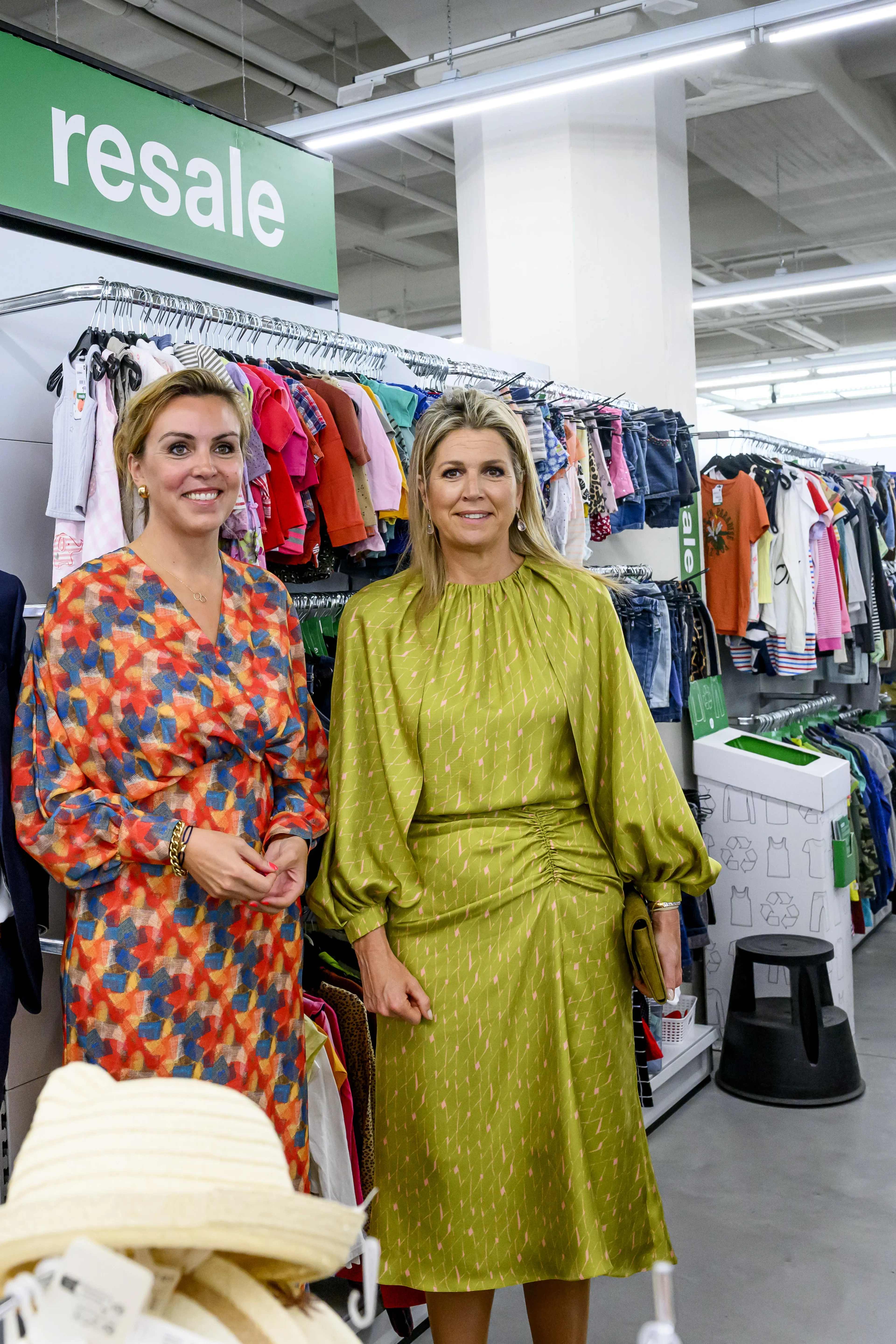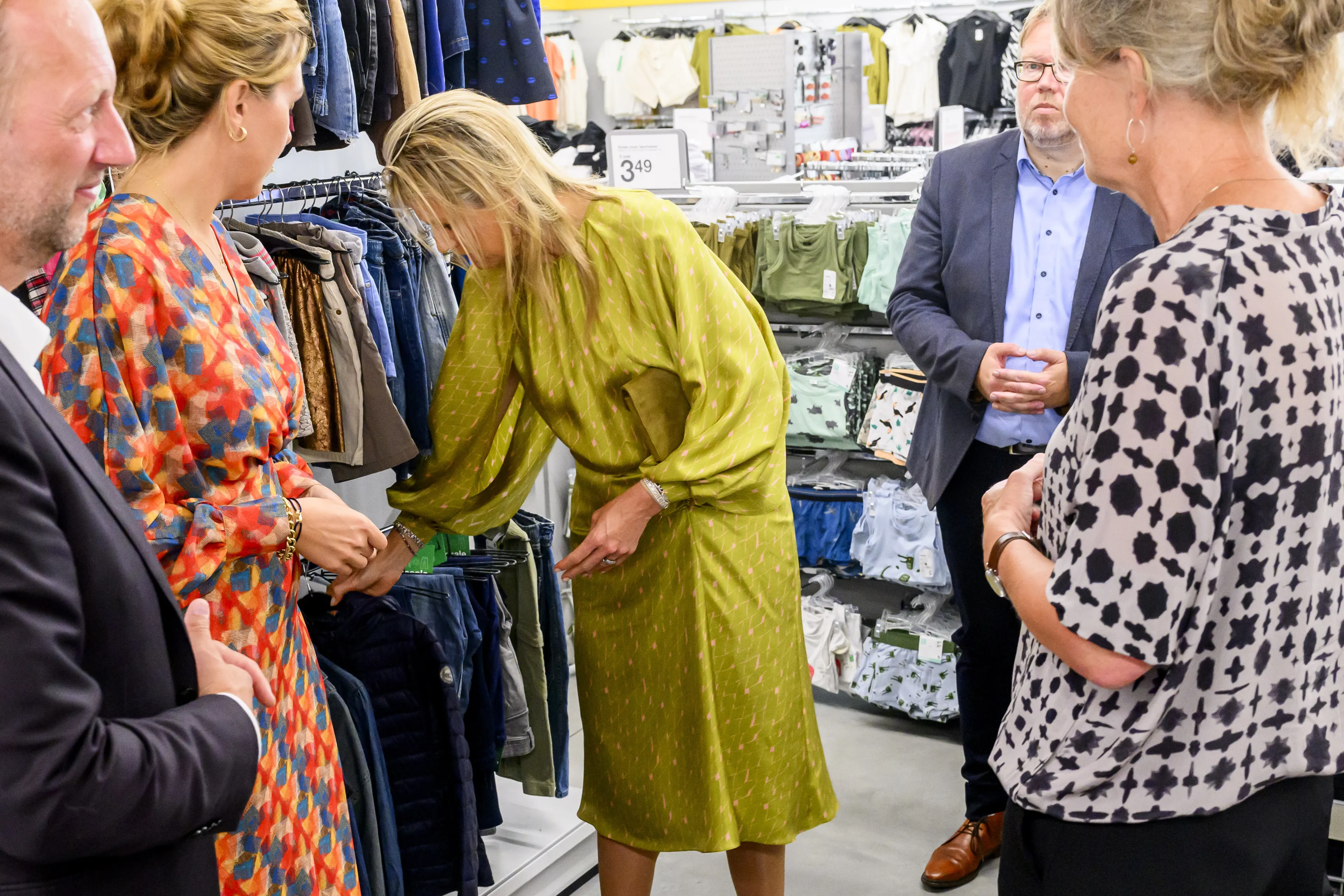 Zelf nam de koningin ook een kijkje in het rek met tweedehandskleding en ze trok meteen een donsjack voor kinderen uit het schap. "Hartstikke mooi jasje, voor maar 5,99 euro!"