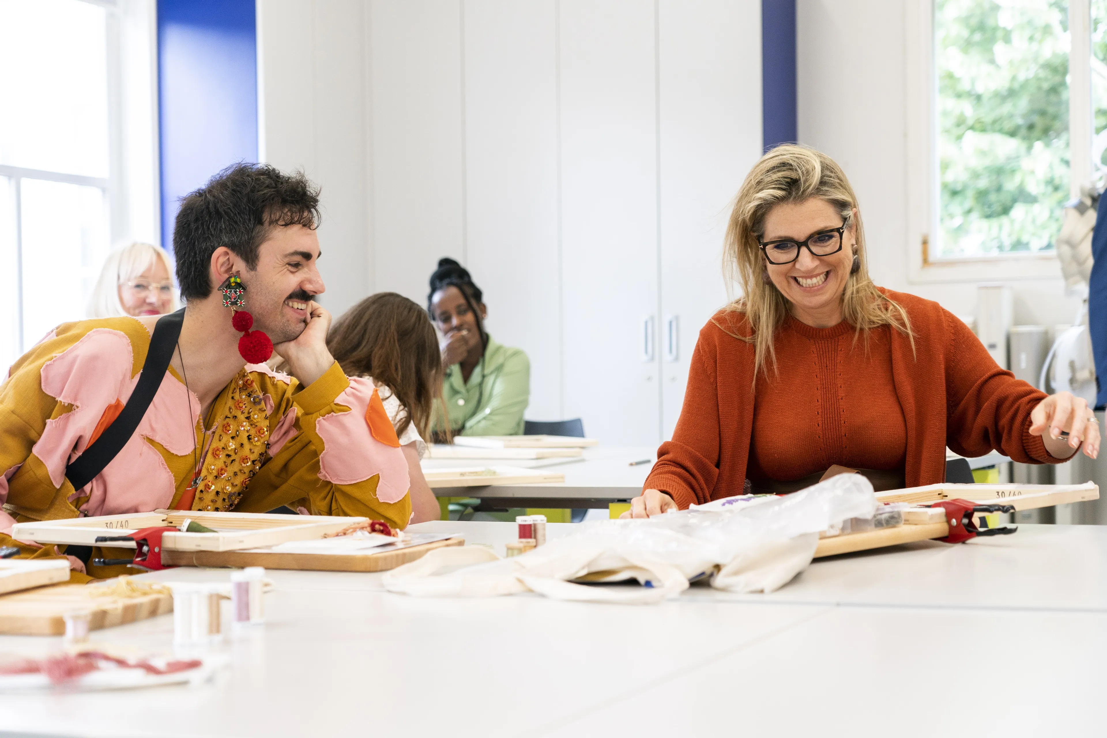 Koningin Máxima heeft donderdagochtend geholpen bij het borduren van de nieuwe gordijnen voor de Chinese Zaal van Paleis Huis ten Bosch. Dat deed ze bij het TextielMuseum in Tilburg, waar de gordijnen momenteel in de professionele werkplaats TextielLab worden gemaakt.