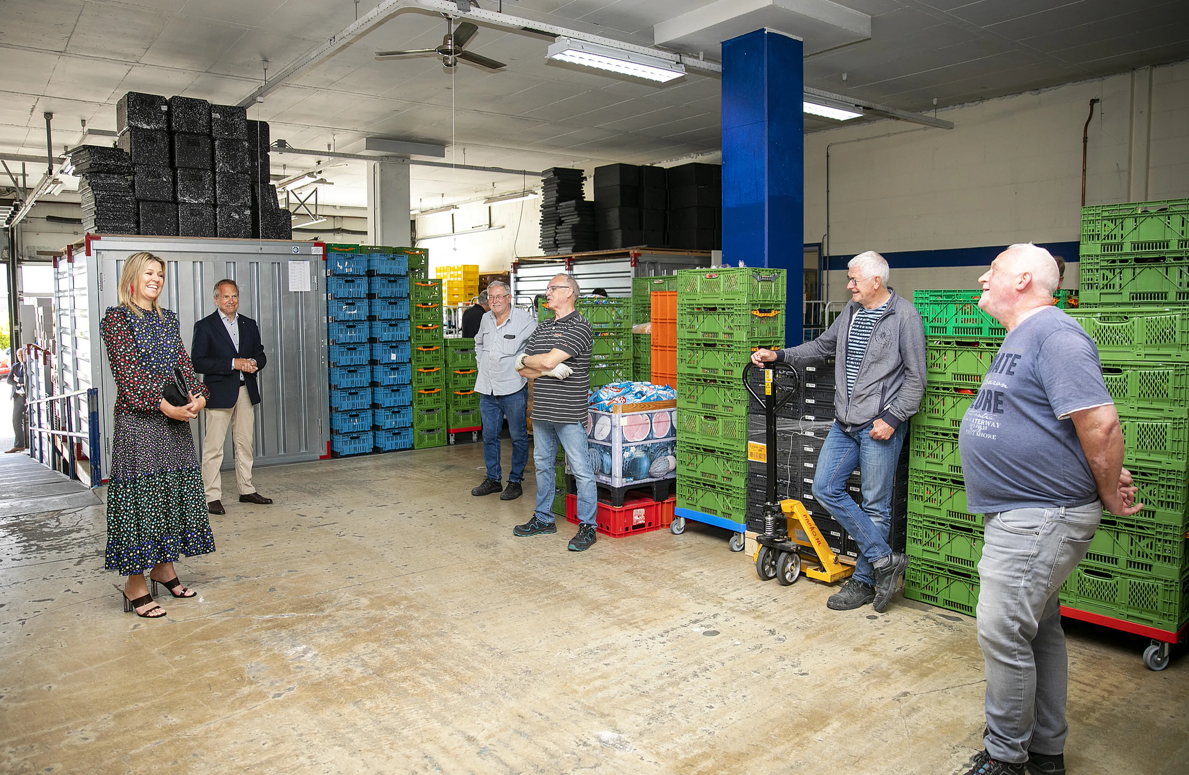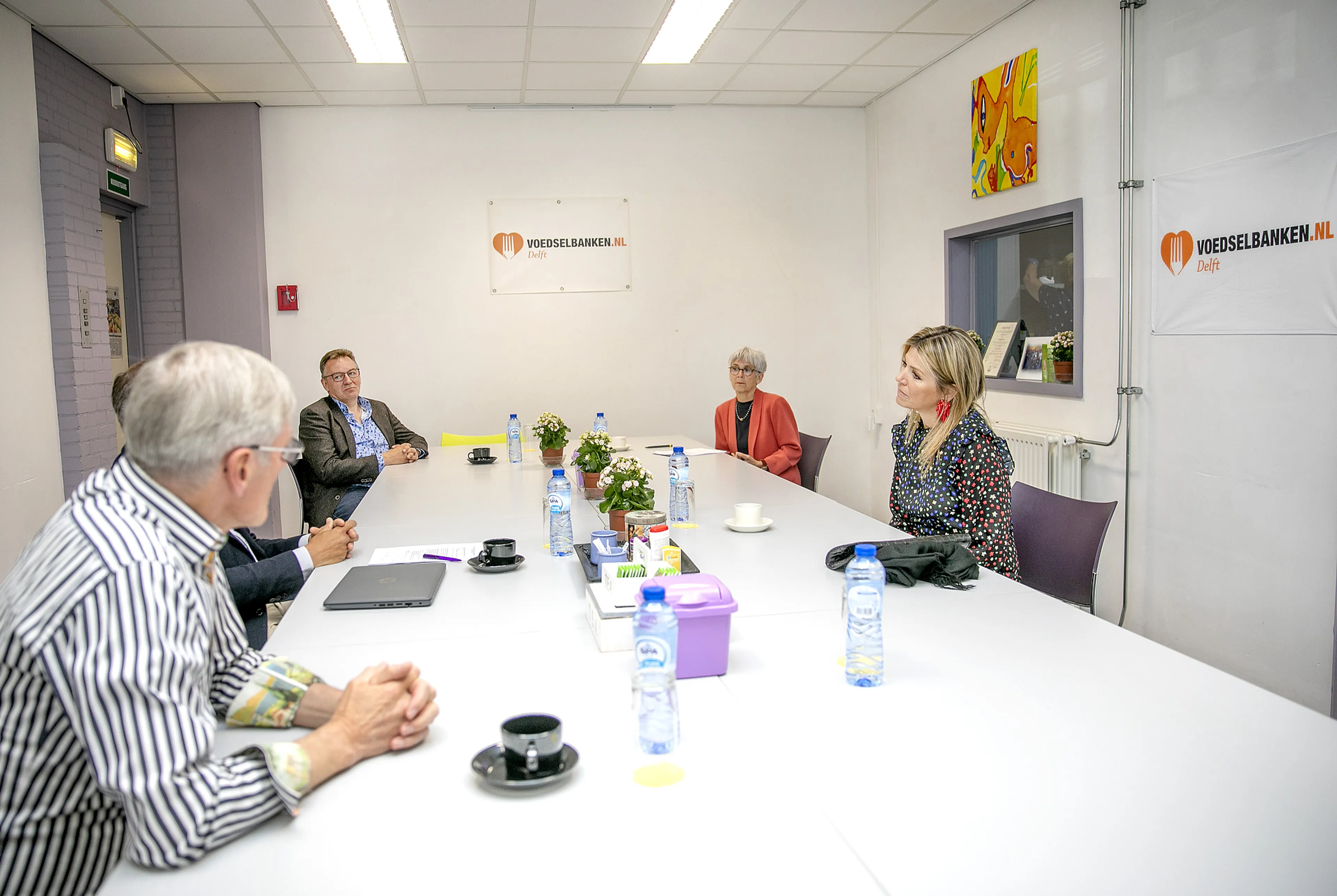 Koningin Máxima heeft dinsdag een bezoek gebracht aan het distributiecentrum van de Voedselbank Delft. Hier ging de koningin in gesprek met vrijwilligers over het uitzoeken, inpakken en verdelen van de voedselpakketten.