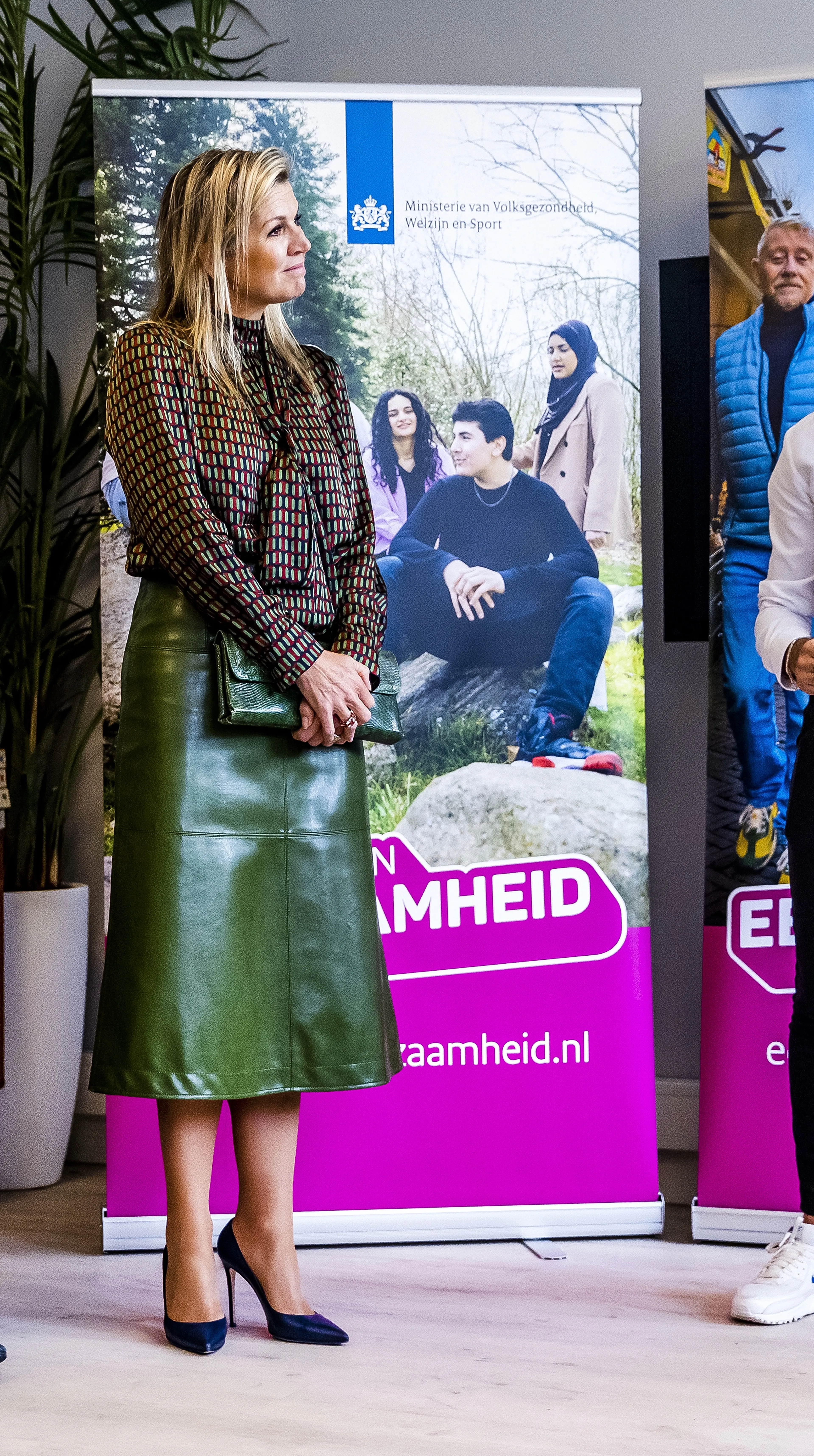 Koningin Máxima koos voor het bezoek aan het buurthuis voor herfstige tinten. Ze droeg een donkergroene rok die is gemaakt van cactusleer en een blouse met print die net als de rok van het Belgische modehuis Natan komt.