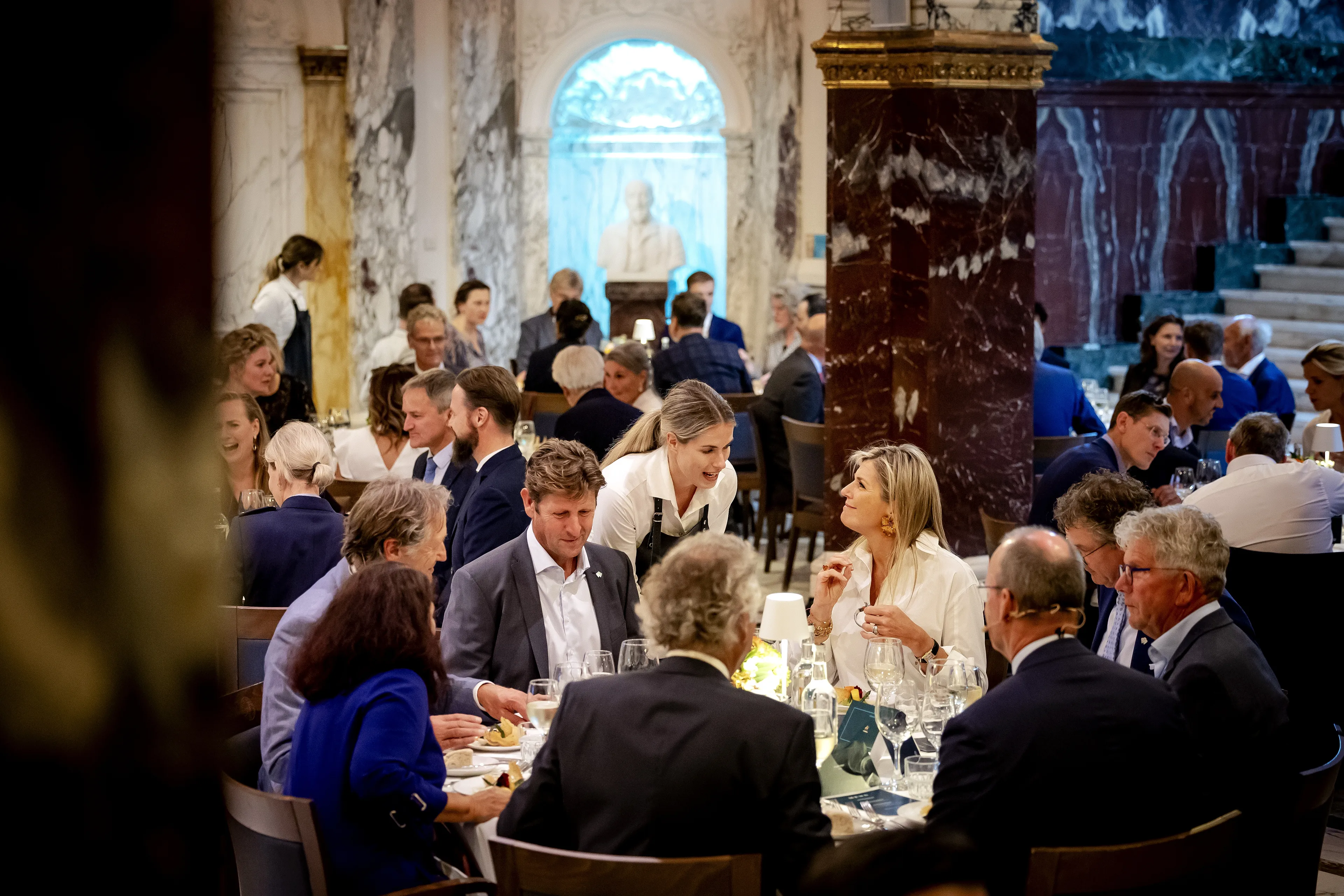 Op foto's is te zien hoe koningin Máxima aanschuift bij het diner. De winnaars van de Koning Willem I Prijzen 2022, NXP Semiconductors, Maan Group en MUD Jeans, deelden tussen de gangen door hun visie op het onderwerp. Het diner werd gehouden in het Koninklijk Instituut voor de Tropen.