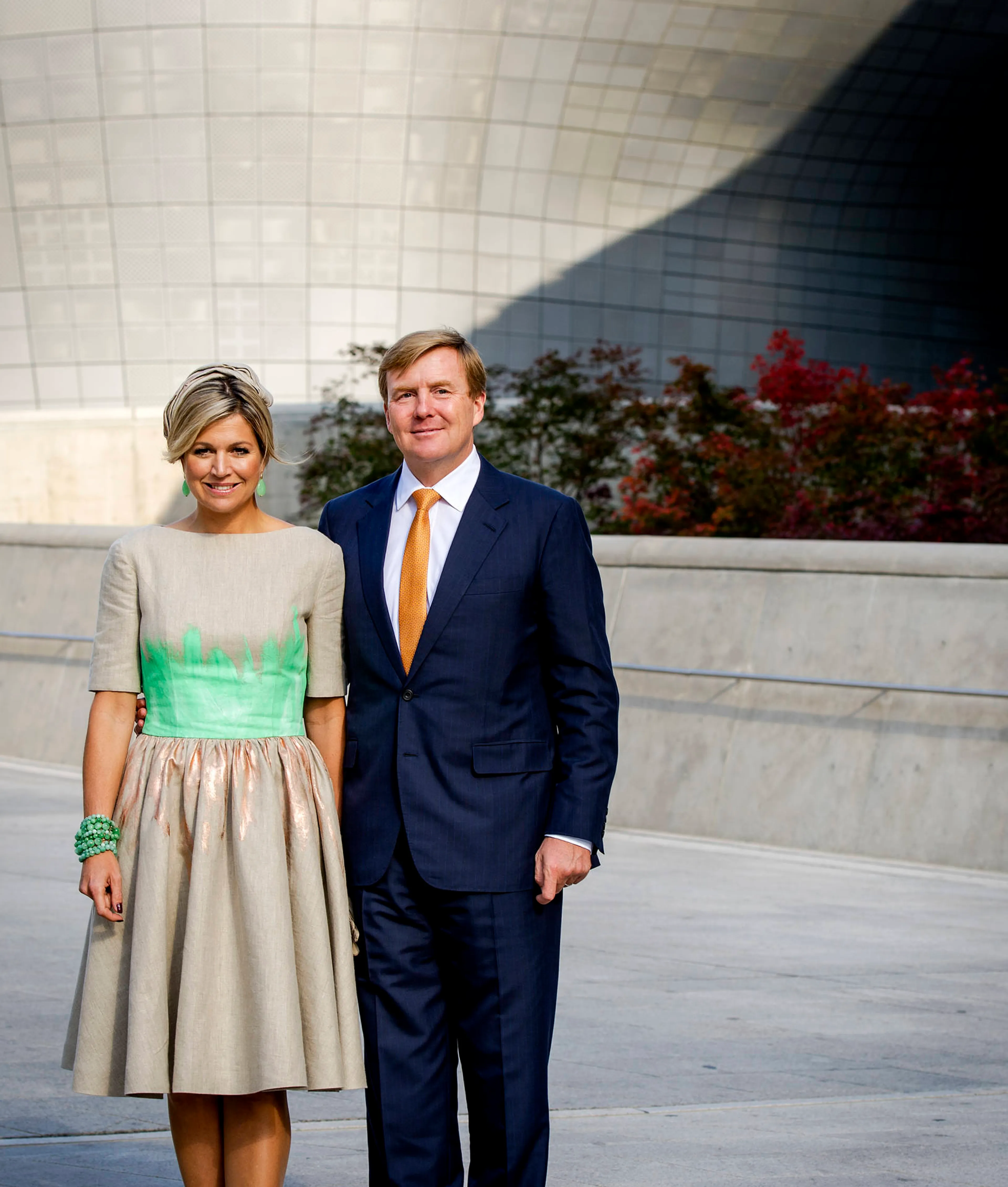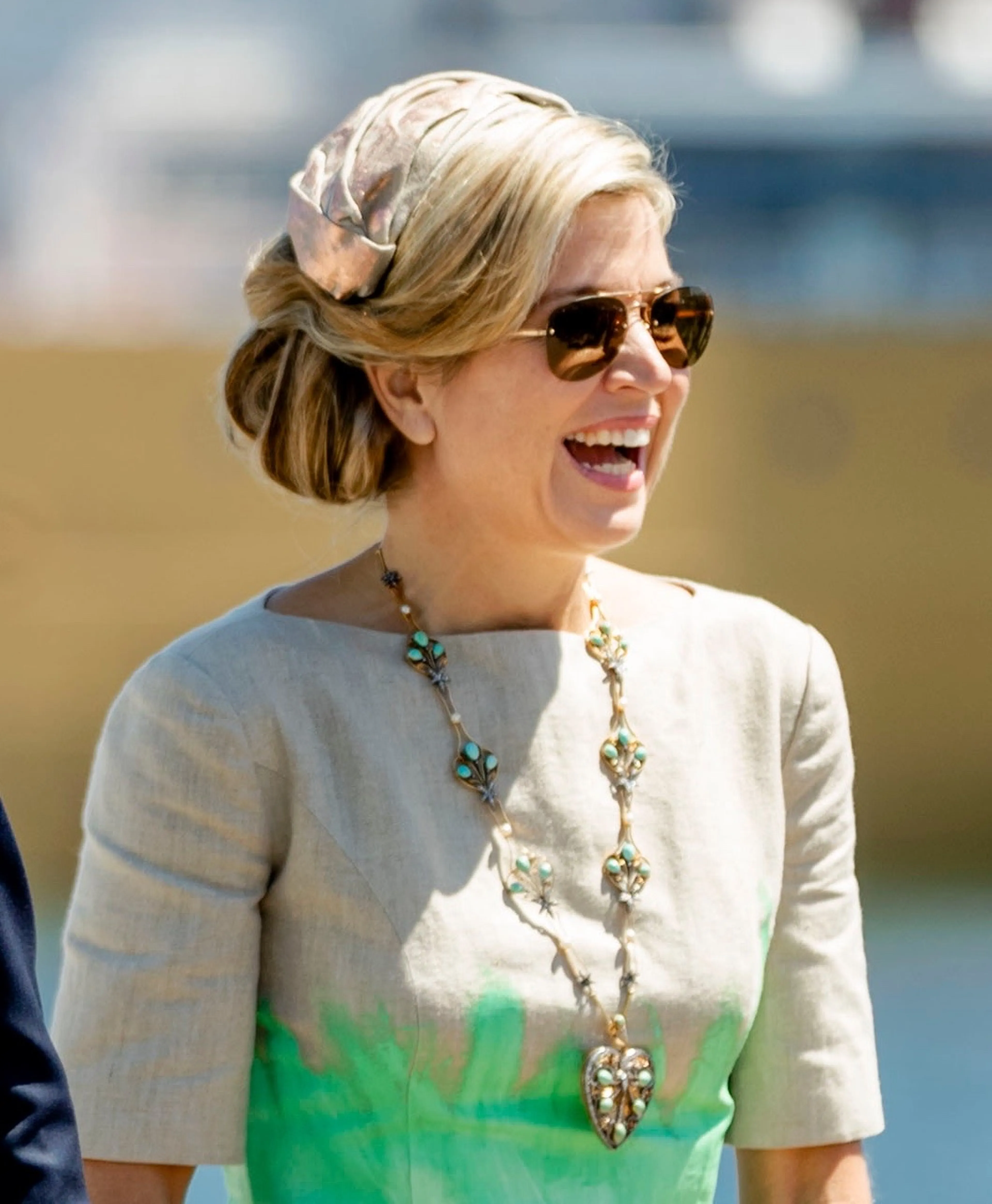 Op de eerste dag van het staatsbezoek aan Australië straalt koningin Máxima in een japon van de Nederlandse ontwerper Mattijs van Bergen. De handgemaakte jurk met groene patronen heeft de koningin eerder gedragen tijdens het staatsbezoek aan Zuid-Korea in 2014.
