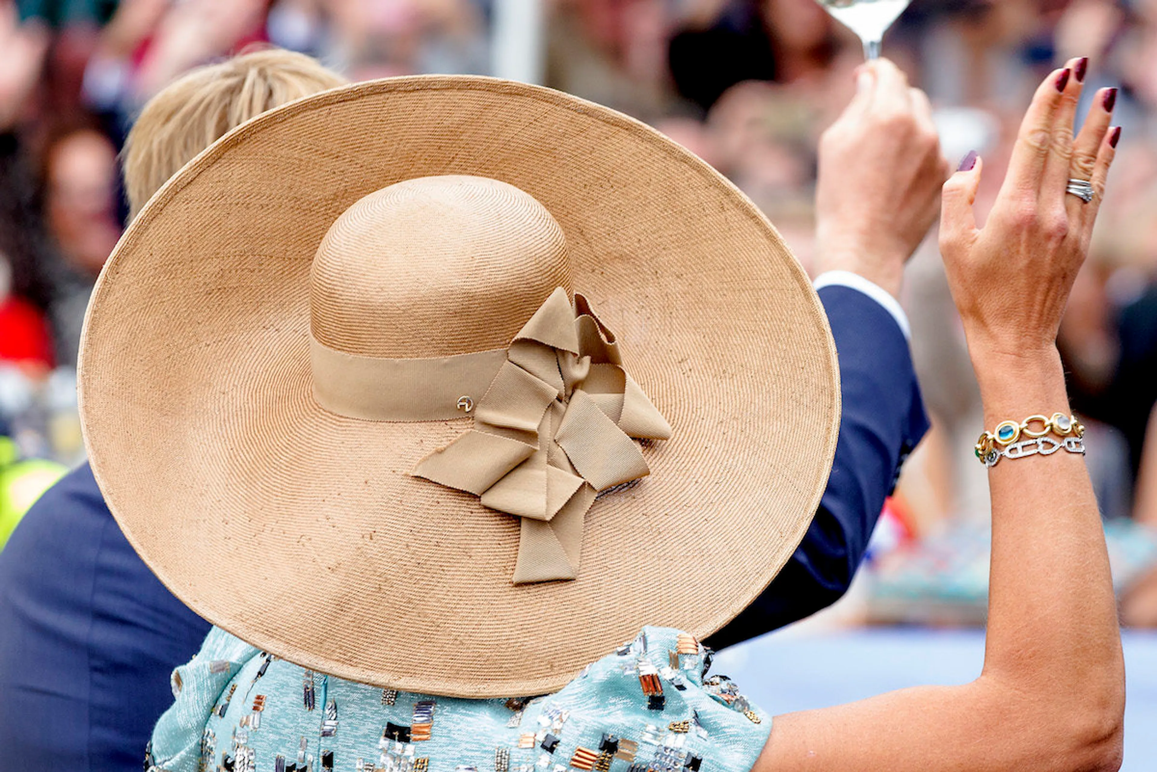 De capeline hoed is een ontwerp van Fabienne Delvigne, gemaakt van goudkleurige parasisal (fijn geweven stro). Dit 'stro' is uiteraard wel van hoog kwaliteit. Het hoofddeksel zit waarschijnlijk erg comfortabel, het is namelijk de favoriete hoed van de koningin. Ze heeft deze al meerdere malen gedragen.