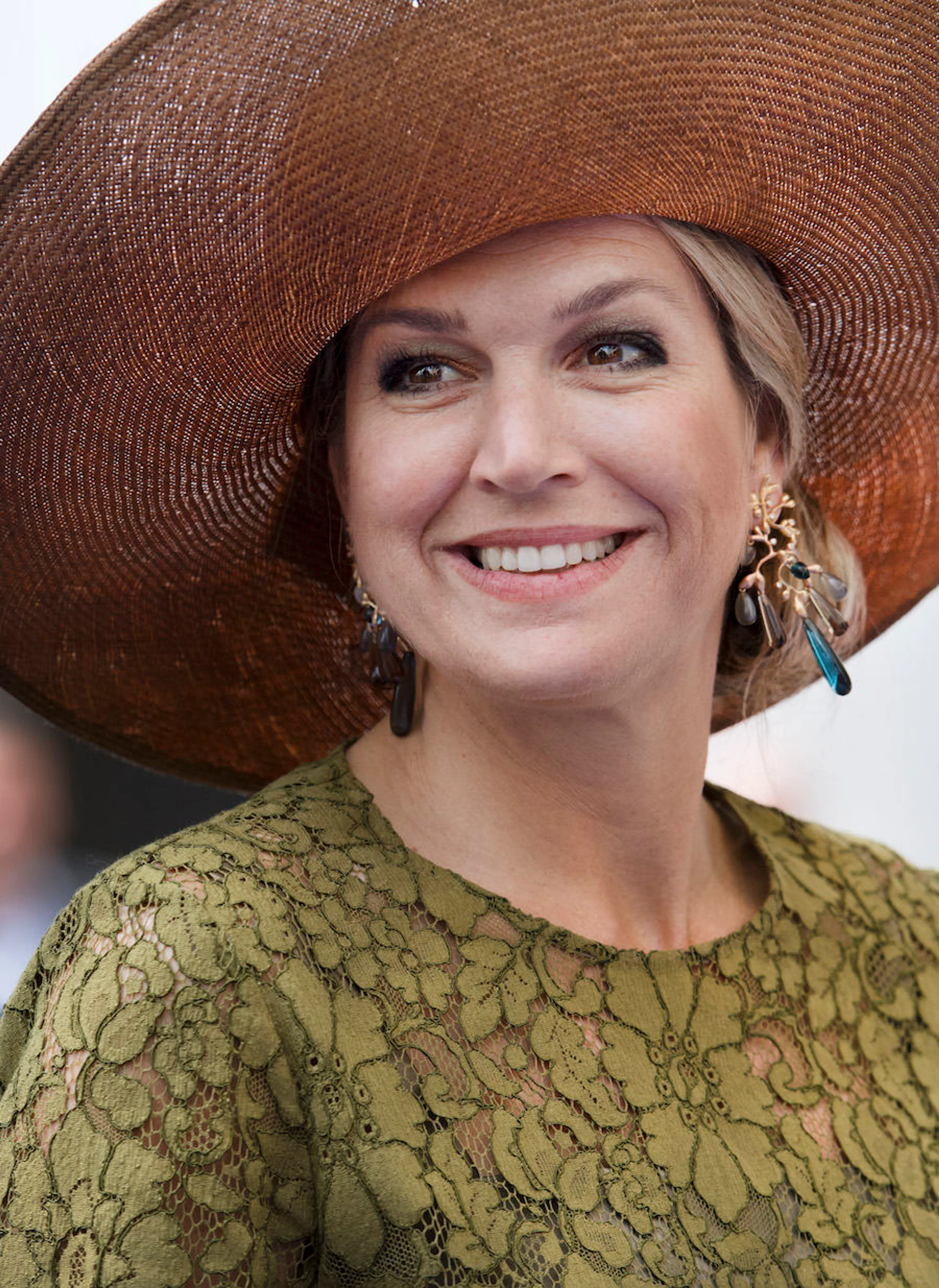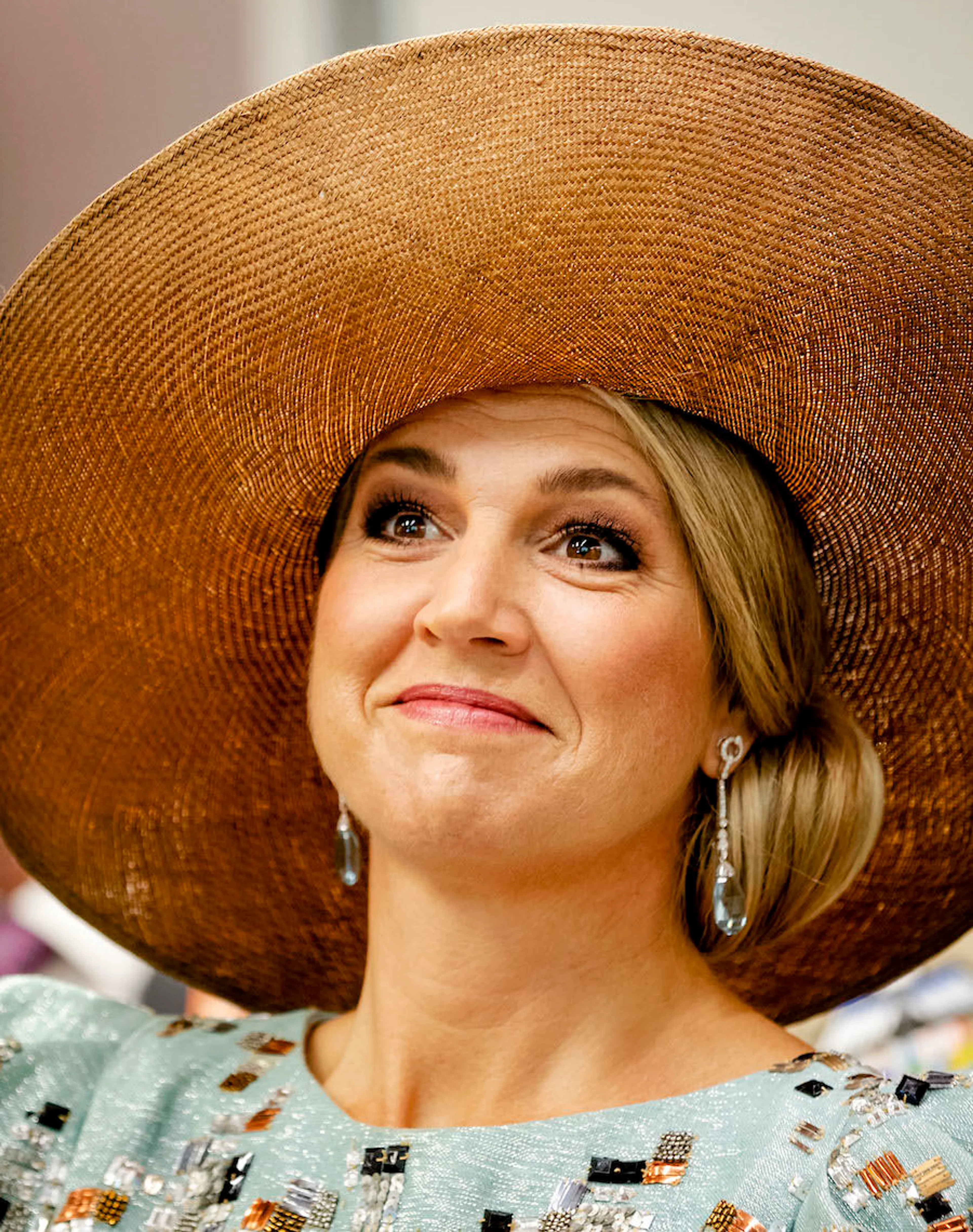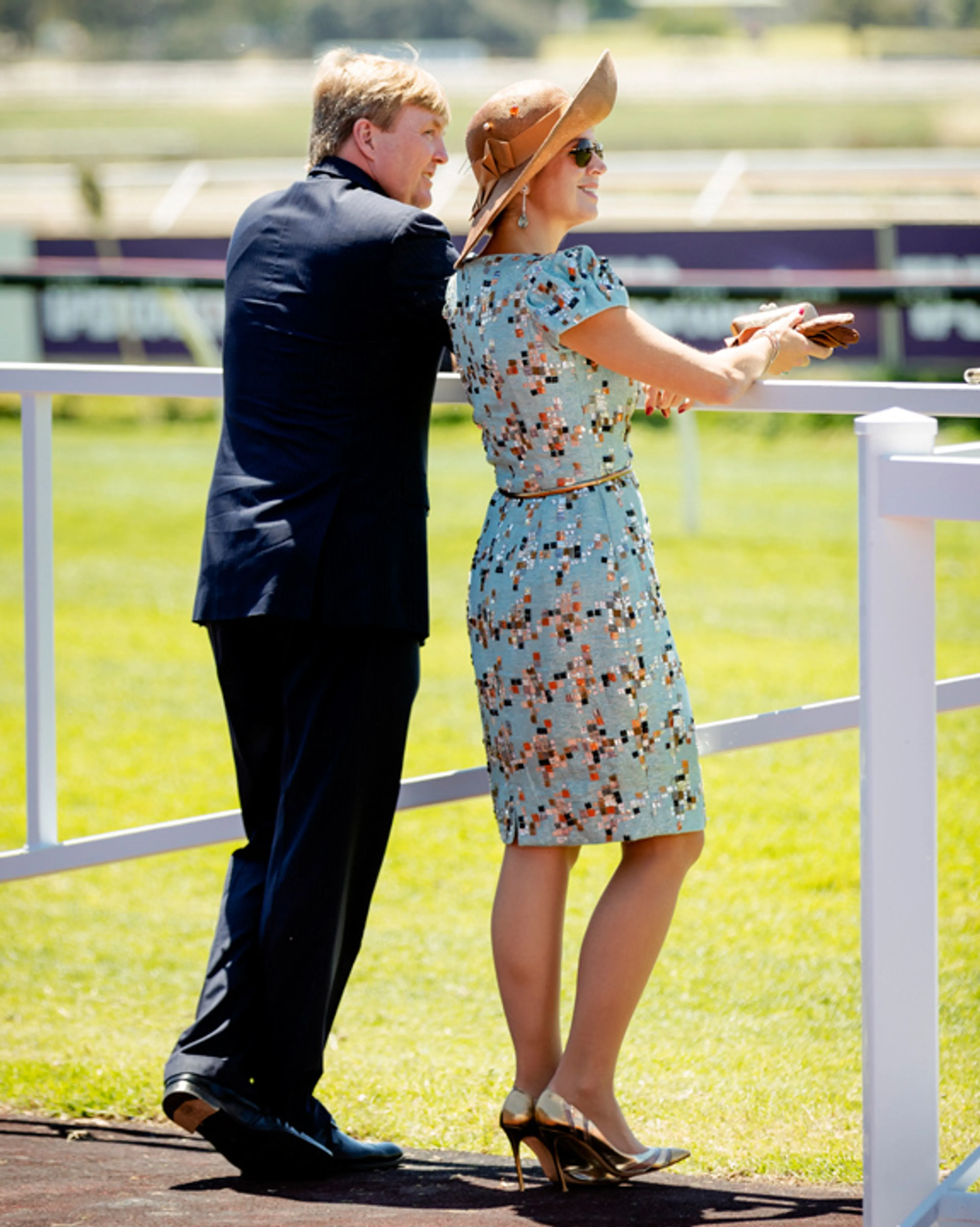 Koningin Máxima ziet er, op de tweede dag van het staatsbezoek aan Australië, prachtig uit in een lichtblauwe japon met print. Zij combineert dit met een goudkleurige hoed. Zowel de jurk als de hoed zijn al vaker gedragen door de koningin.