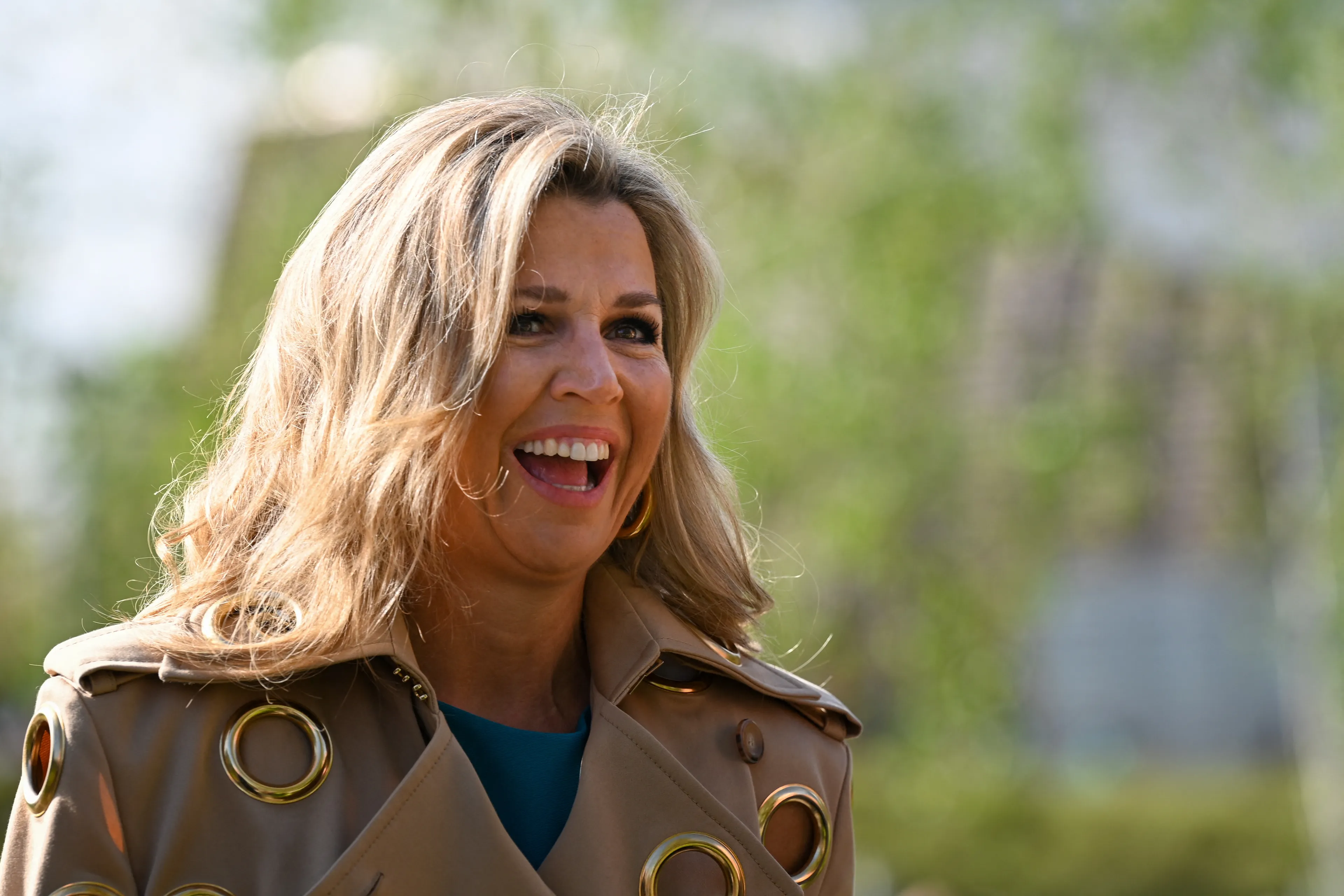 Máxima heeft voor het bezoek een opvallende jas uit de kast getrokken. De koningin droeg een trenchcoat vol gouden ringen waar dwars doorheen gekeken kon worden. De mantel is afkomstig van modeontwerper Claes Iversen.