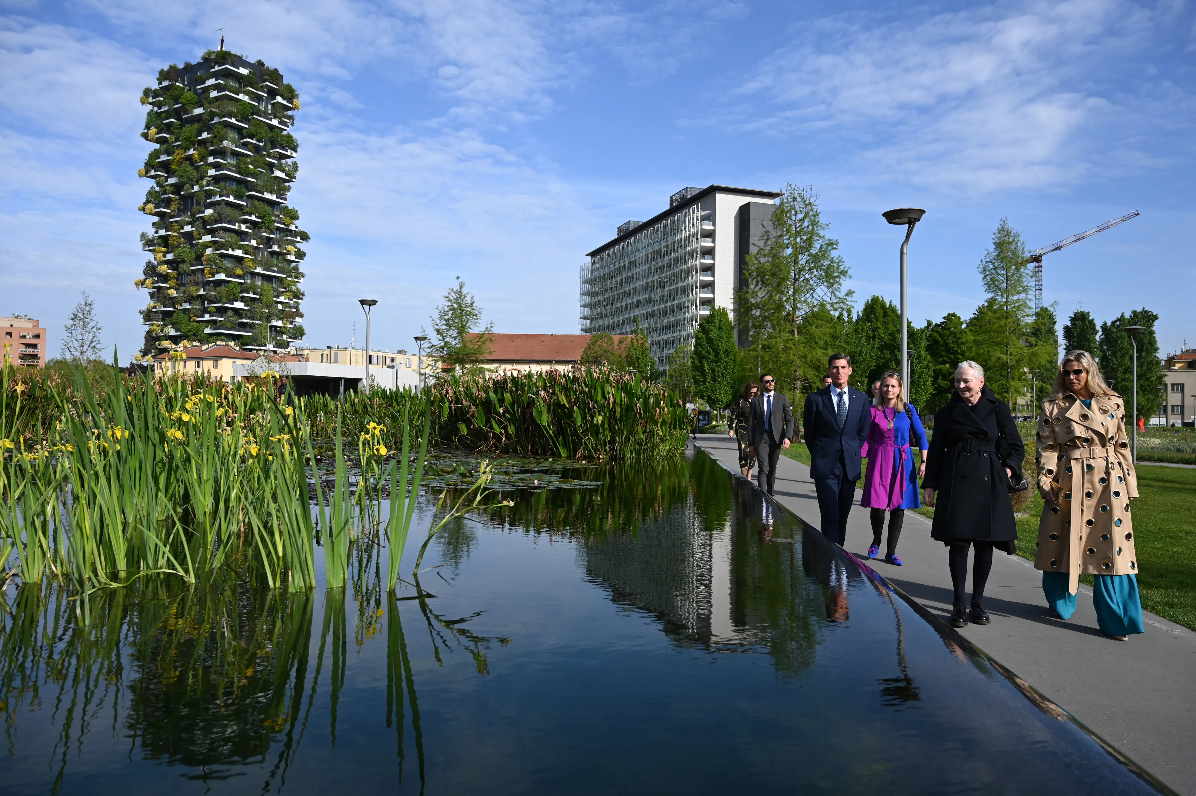 Aan de rand van het stadspark nam de koningin ook een kijkje bij de woontorens Bosco Verticale, wat 'verticaal bos' betekent. In de gebouwen zijn op de balkons veel struiken en bomen geplant.