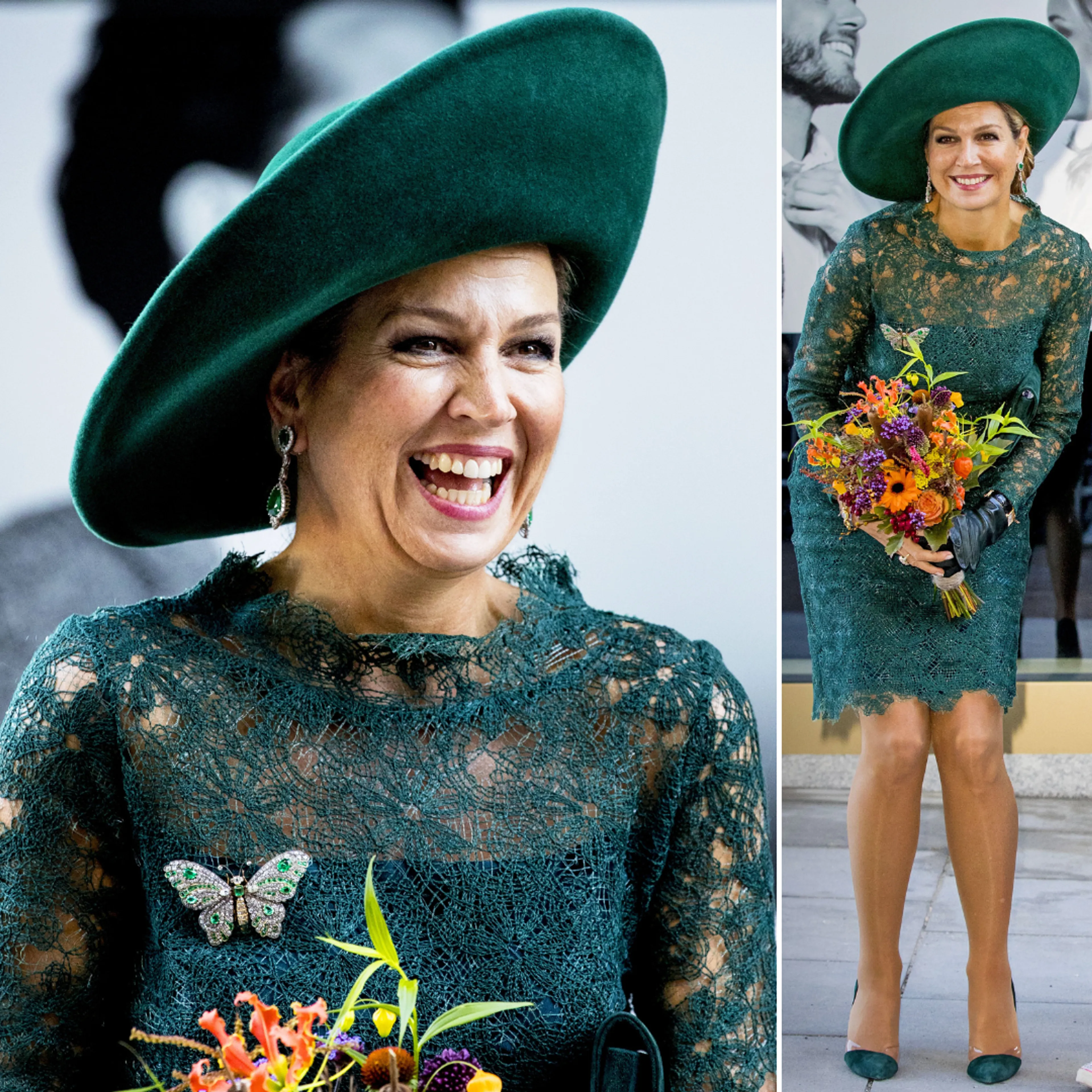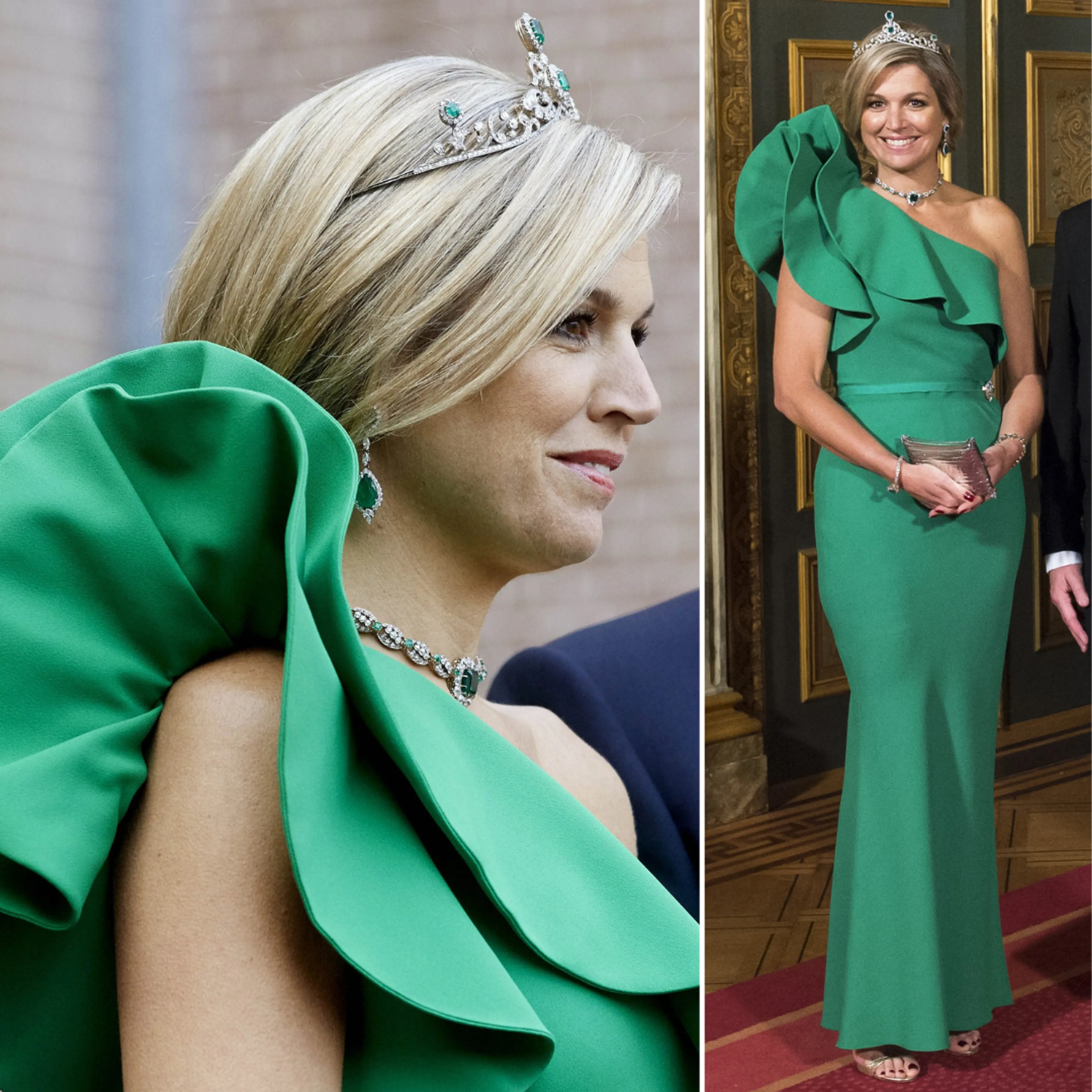 Smaragdgroen is een passende kleur voor de kerstdagen. In combinatie met kant wordt deze japon alleen maar feestelijker. Máxima heeft de jurk van Natan al sinds 2018 in haar kledingkast hangen.