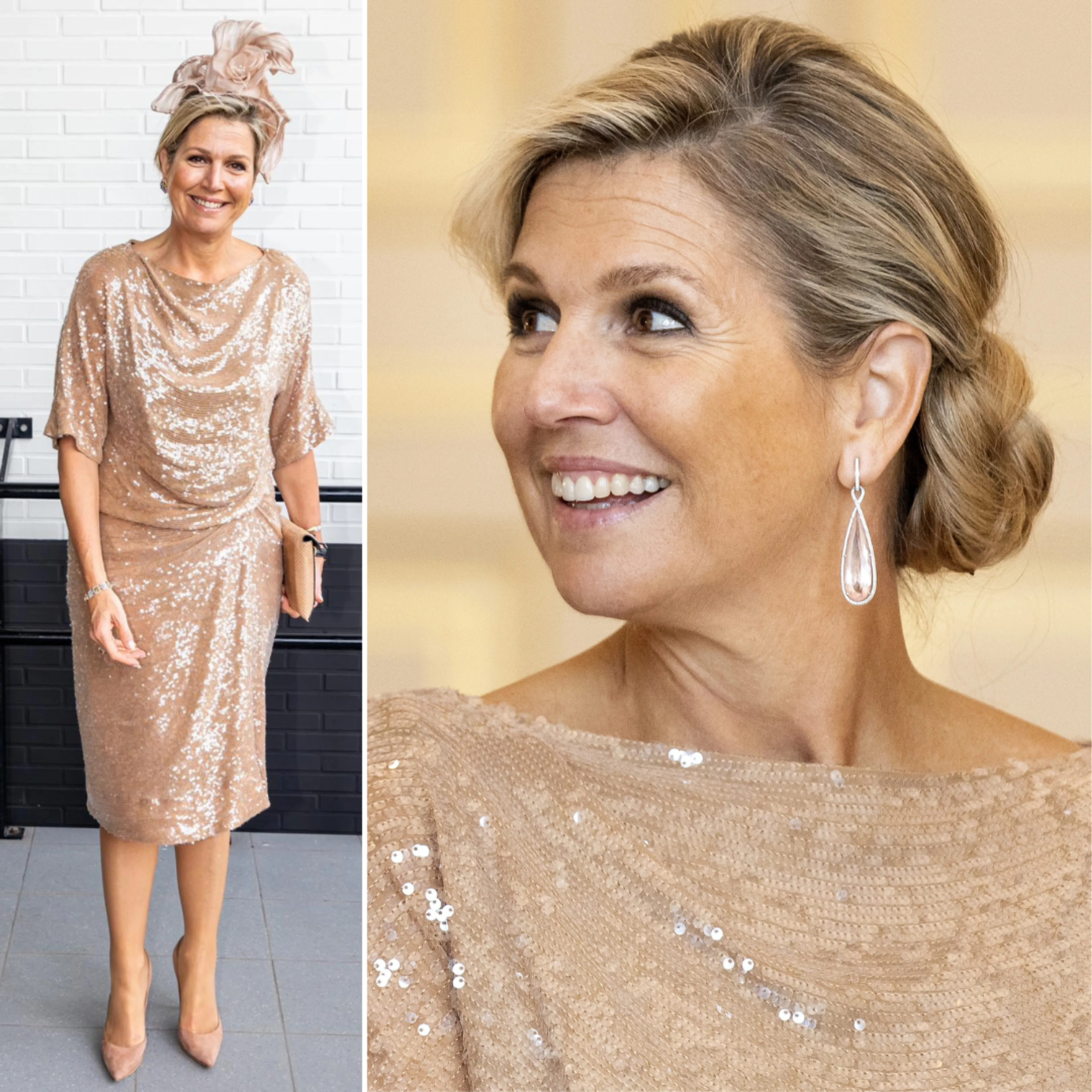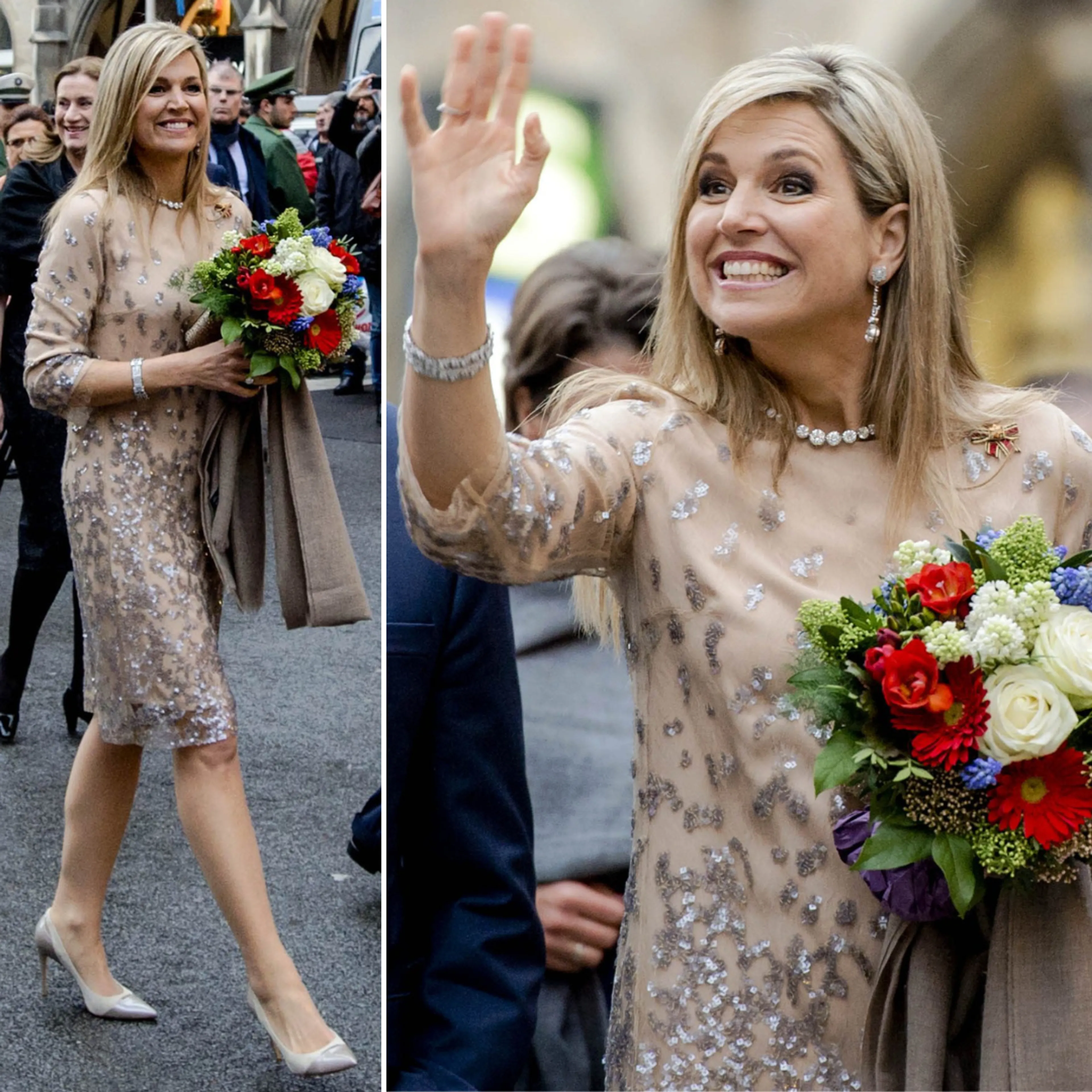 Deze jurk vol pailletten is wat ons betreft zeer geschikt voor de jaarwisseling. Het feestelijke beige ontwerp van Natan is meermaals gedragen door de koningin.