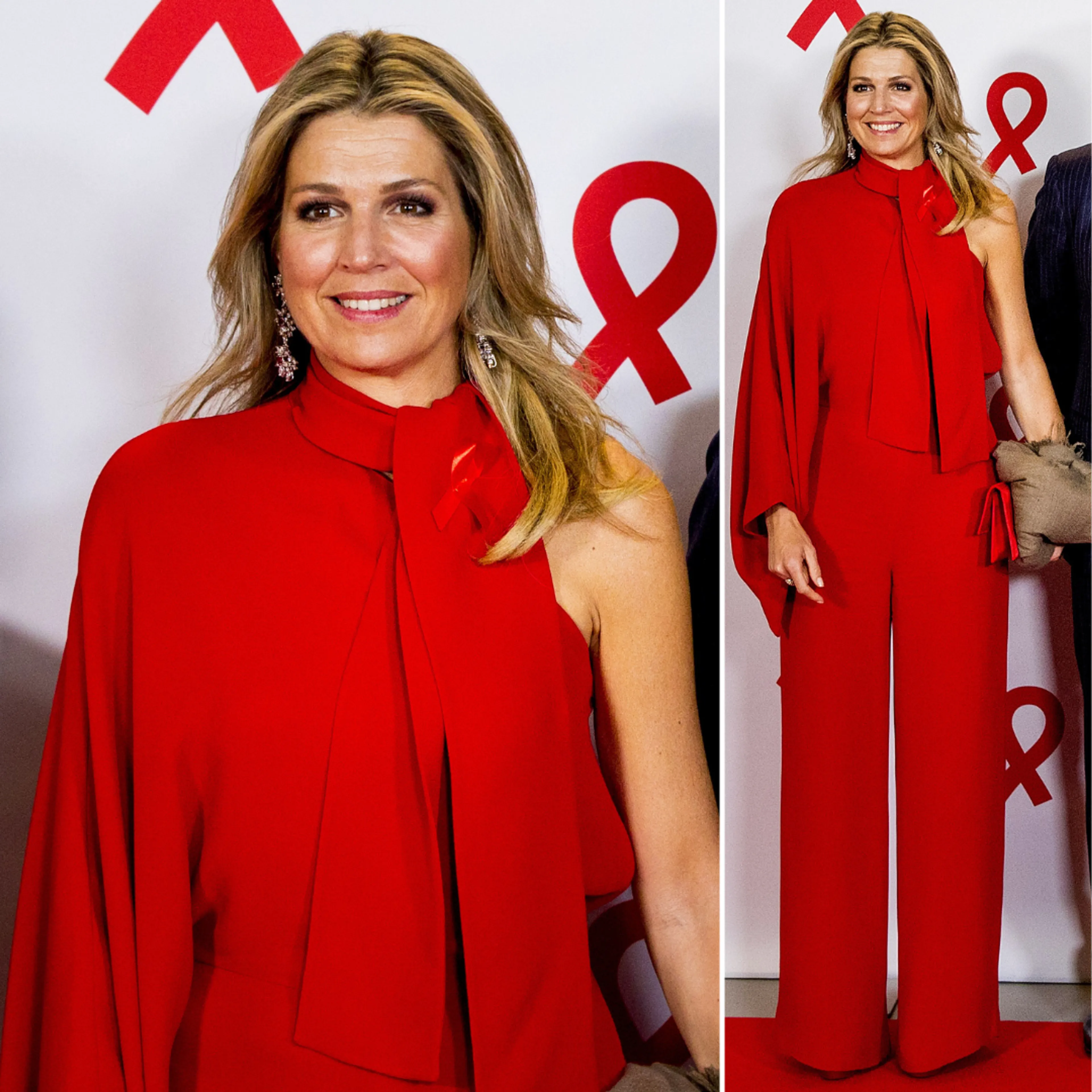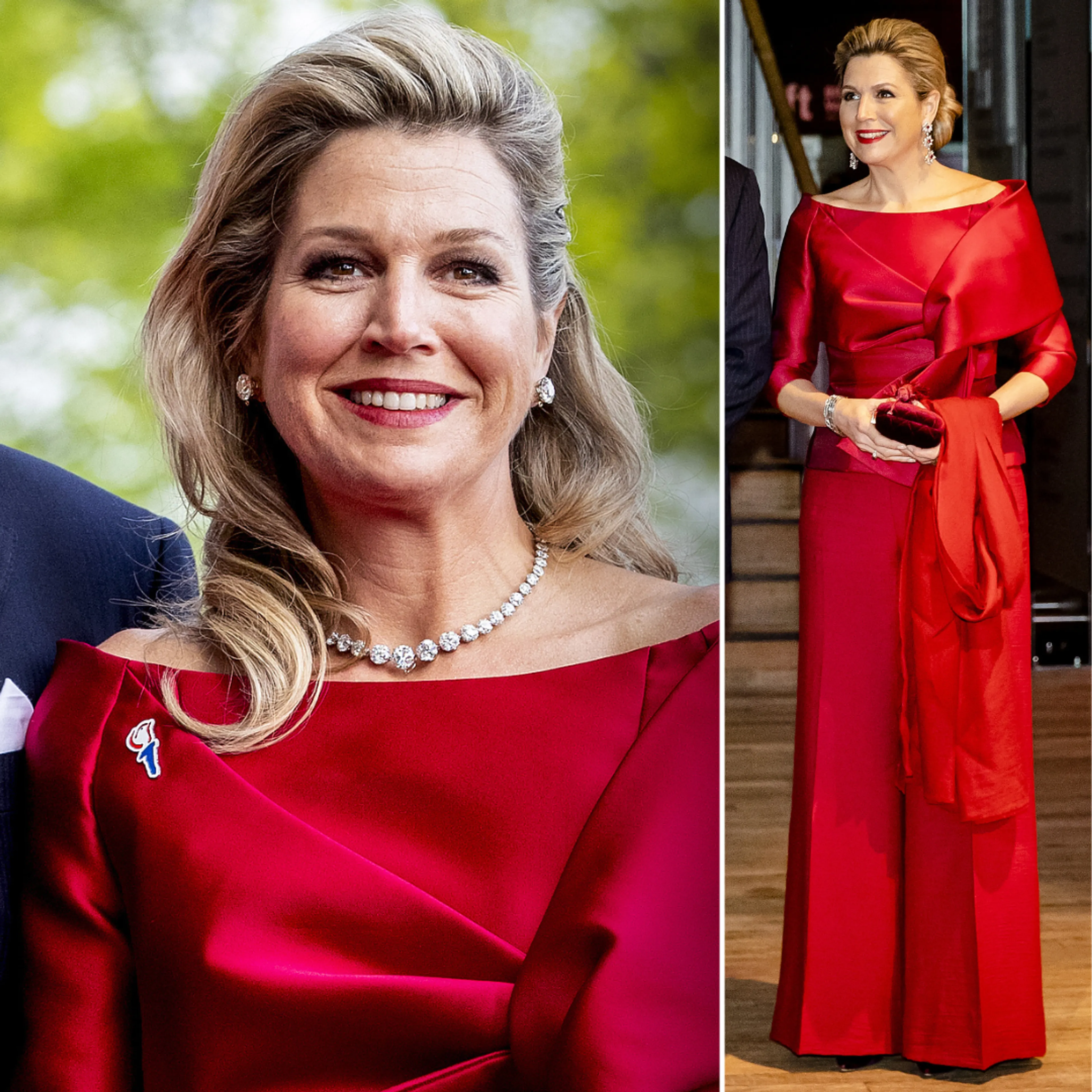Koningin Máxima bewijst dat het dragen van een broek net zo feestelijk als een jurk kan zijn. Tijdens het 5 mei-concert in 2018 verschijnt ze in deze rode top met bijpassende broek van Natan (foto links). Vier jaar later komt de outfit opnieuw voorbij tijdens het inkomende staatsbezoek van de Indiase president (foto rechts).