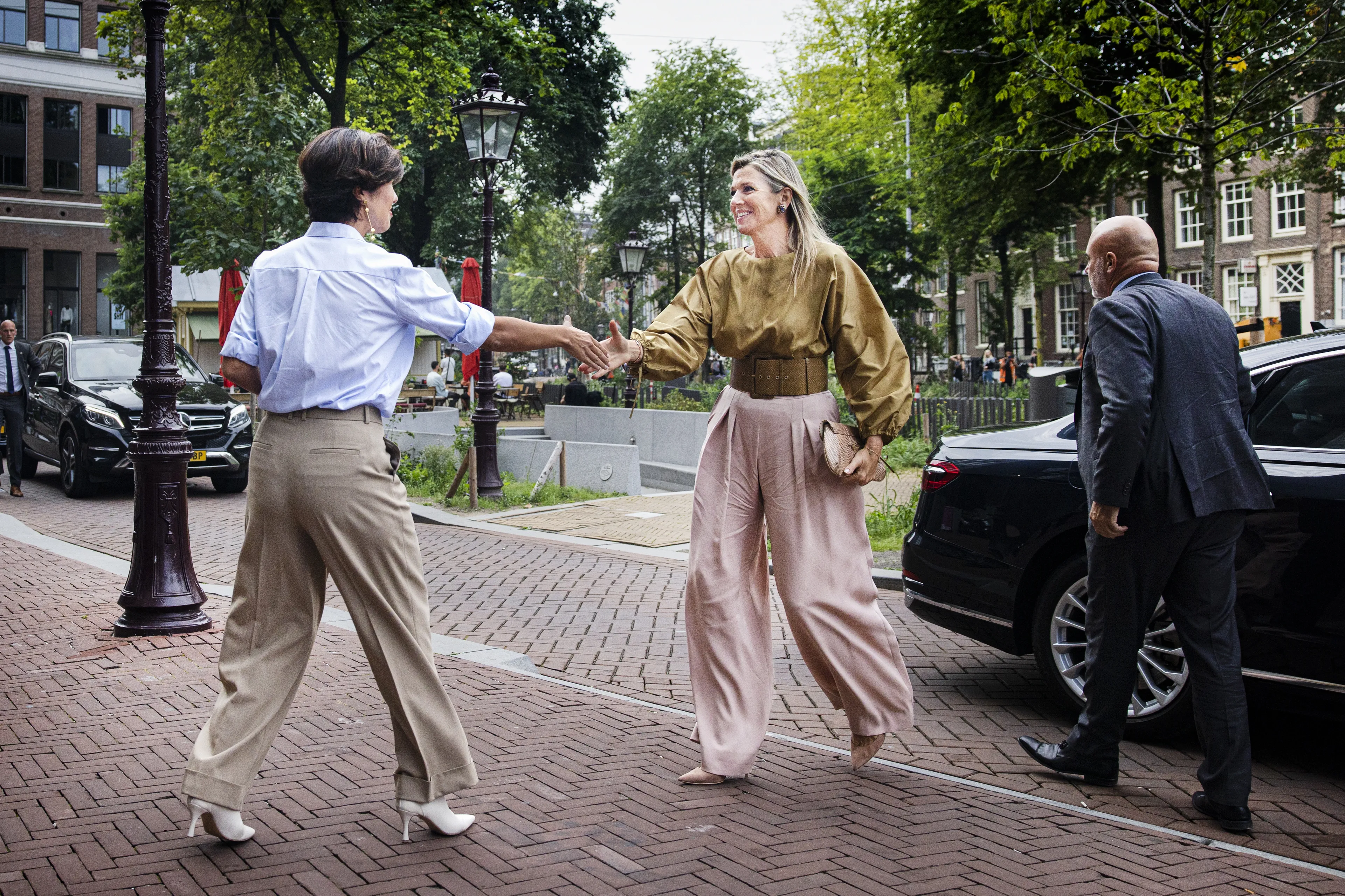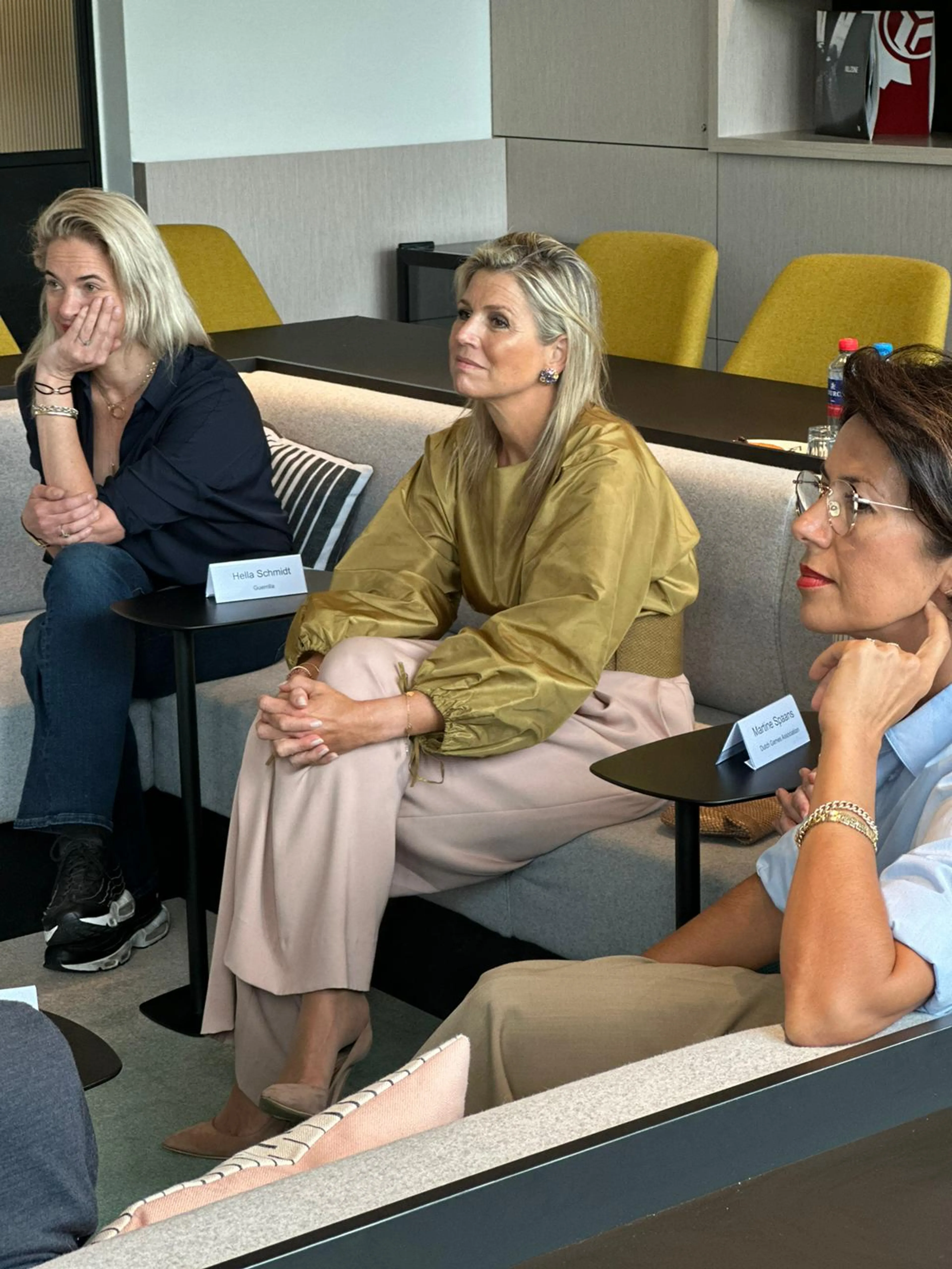 Máxima verschijnt bij het bezoek in een outfit van het Belgische modehuis Natan die we al eerder hebben gezien. Ze draagt een wijde goudkleurige blouse op een ruimvallende linnen broek. Lekker luchtig en daarmee uiterst geschikt voor dit klamme weer. Opvallend is dat Máxima steeds vaker outfits hergebruikt. Zo trok ze voor het streekbezoek aan de Gelderse Vallei haar Koningsdag-outfit van april dit jaar uit de kast, ook een ontwerp van Natan. En vorige week droeg Máxima een vrolijke oranje japon die we herkennen van eerdere werkbezoeken. Wederom een ontwerp van Natan. Een duurzame keuze van de koningin, waar ontwerpen van Natan zich prima voor lenen zo blijkt.