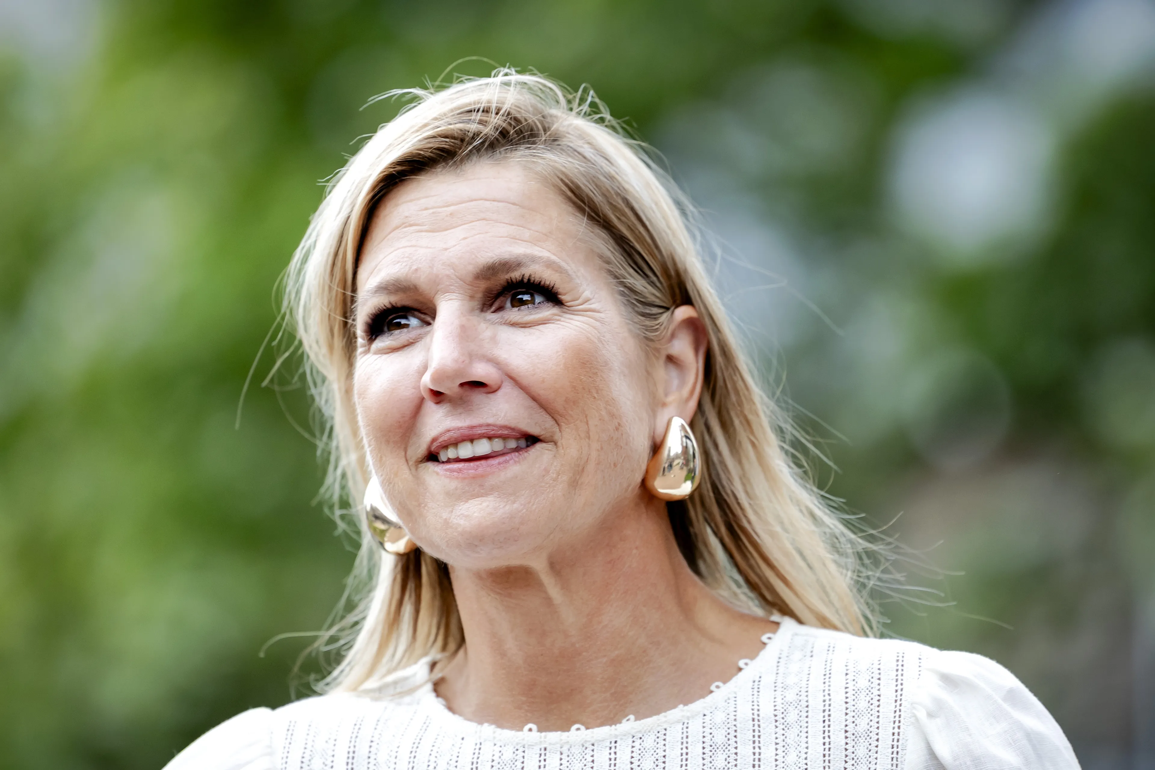 Voor het bezoek aan het Kloosterkwartier kiest koningin Máxima voor een bekende look. We zagen de outfit al eerder tijdens de zomerse fotosessie in 2023 op het Zuiderstrand in Den Haag. Het witte geheel bestaat uit een losse cropped top met een maxi rok van het Amerikaanse modemerk Tory Burch.
