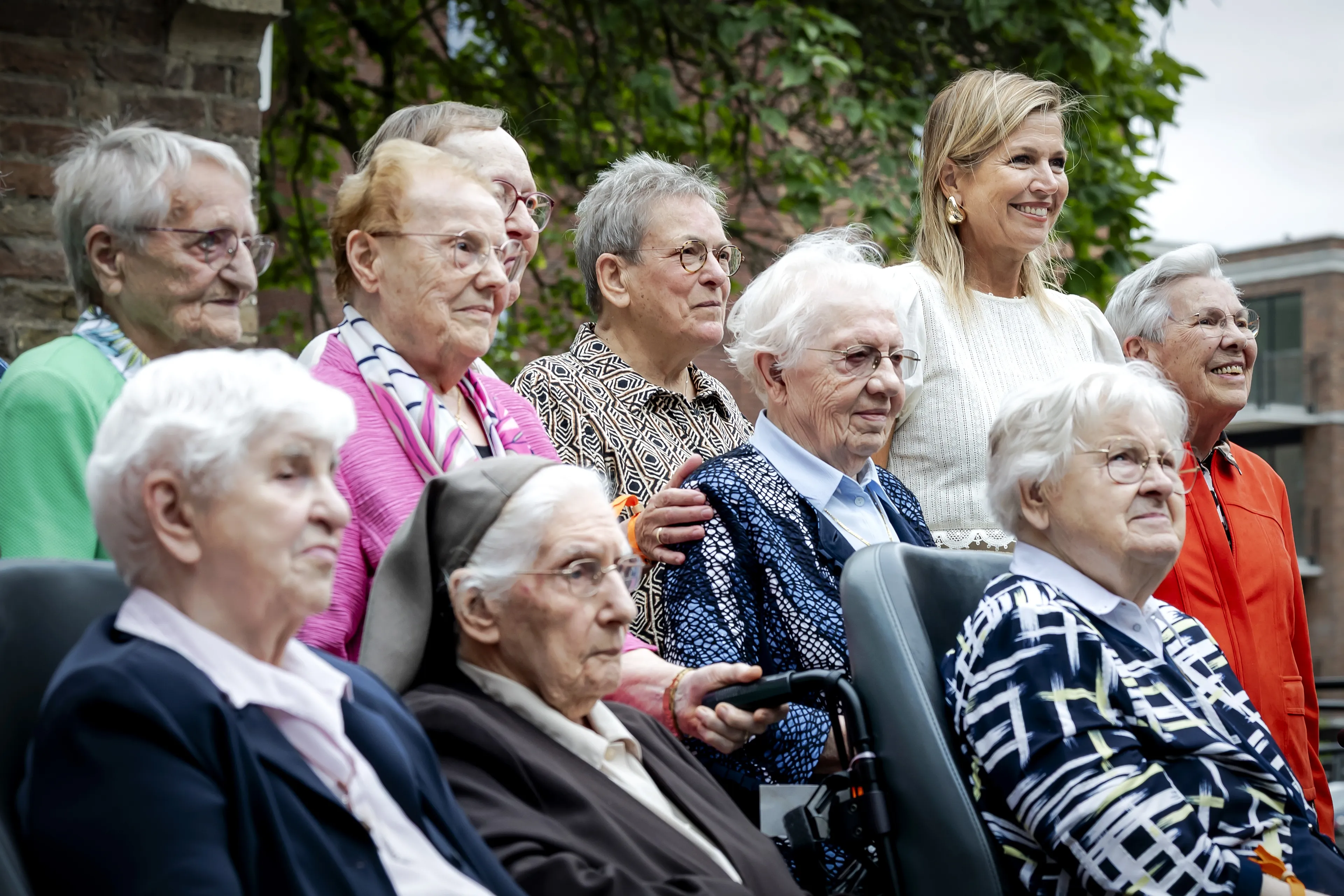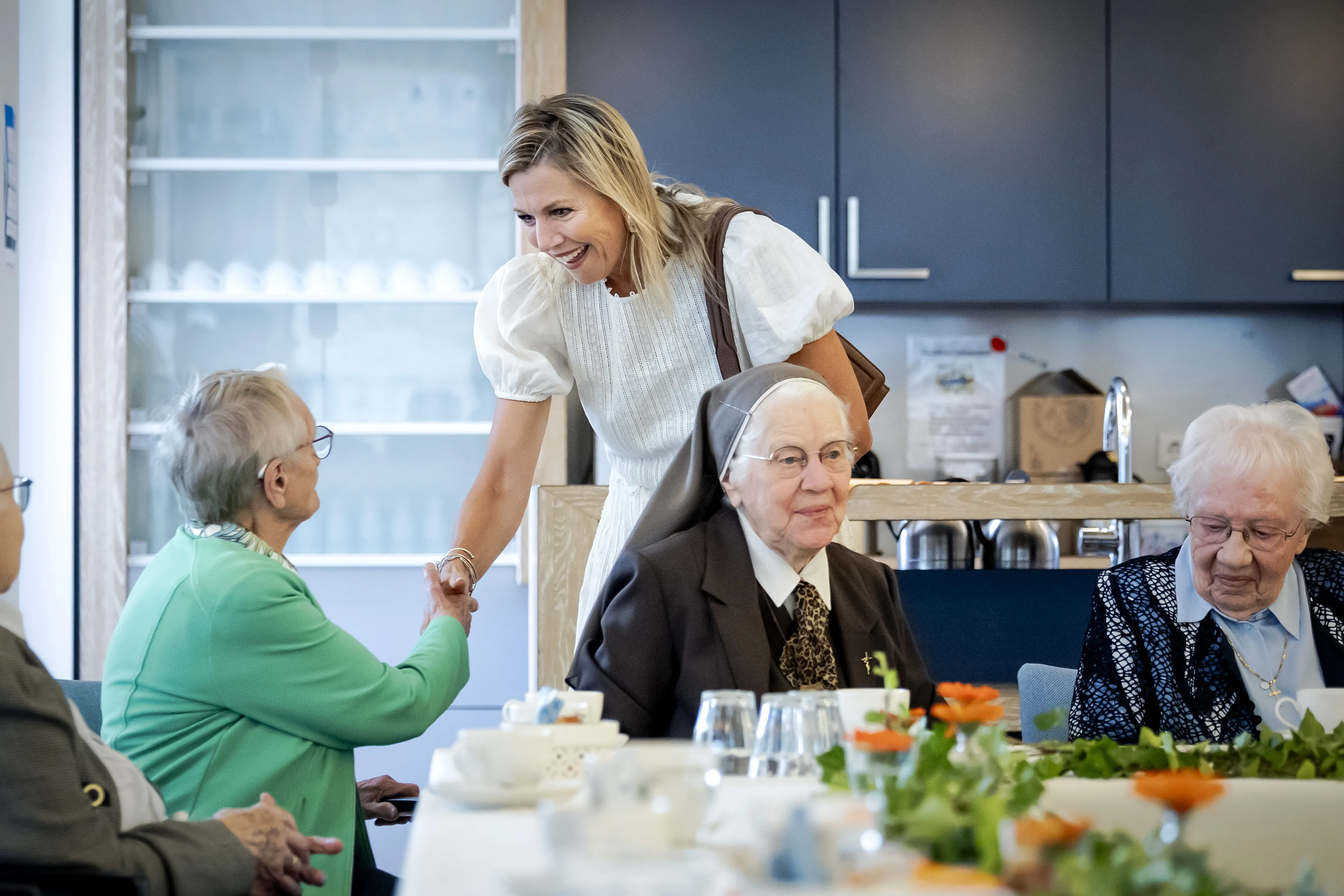 Bij binnenkomst schudt koningin Máxima één voor één de handen van de 18 zusters van het Franciscanessen Kloostergemeenschap in Veghel. In de Brabantse plaats is het Kloosterkwartier ontwikkeld op de plek waar de zusters op hun hoogtepunt in de jaren vijftig met 500 zusters woonden. De gemeenschap wordt kleiner en kwetsbaarder, daarom hebben ze ervoor gekozen om hun idealen op deze plek in een nieuwe vorm te laten voortleven.