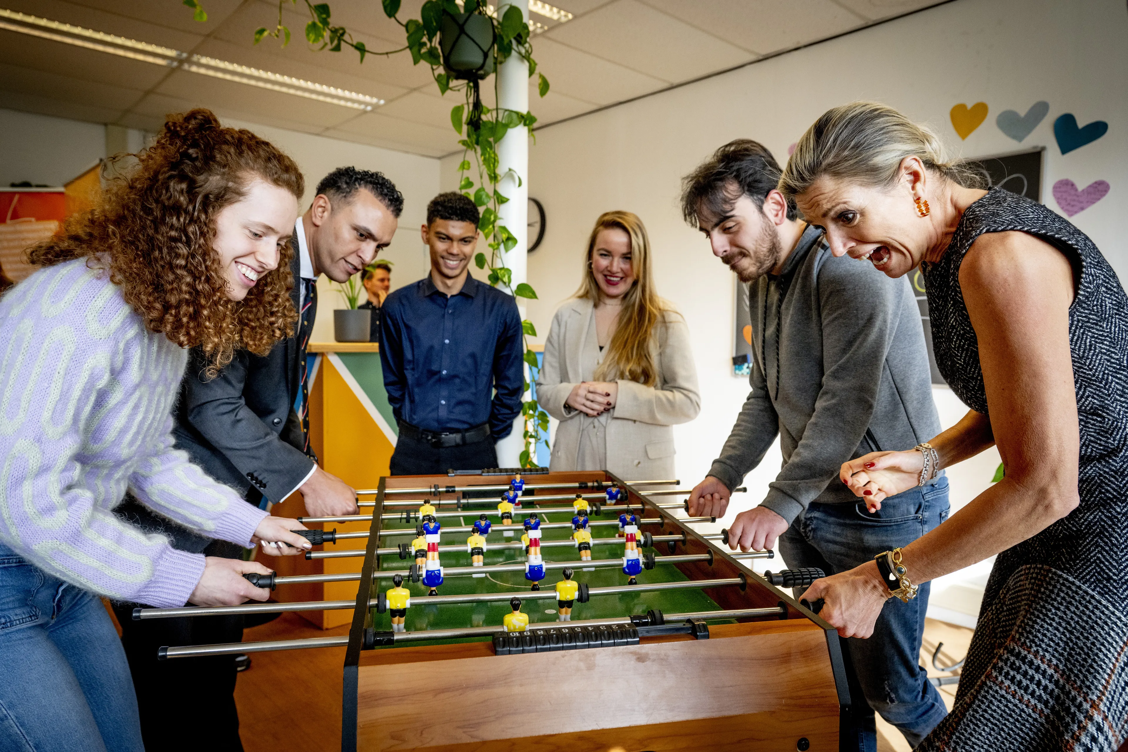 In de woonkamer is er ruimte voor ontspanning en daar doet ook de koningin aan mee. Een potje tafelvoetbal met de jongeren kan niet ontbreken tijdens het bezoek, al moet ze daar wel een goal tegen incasseren.