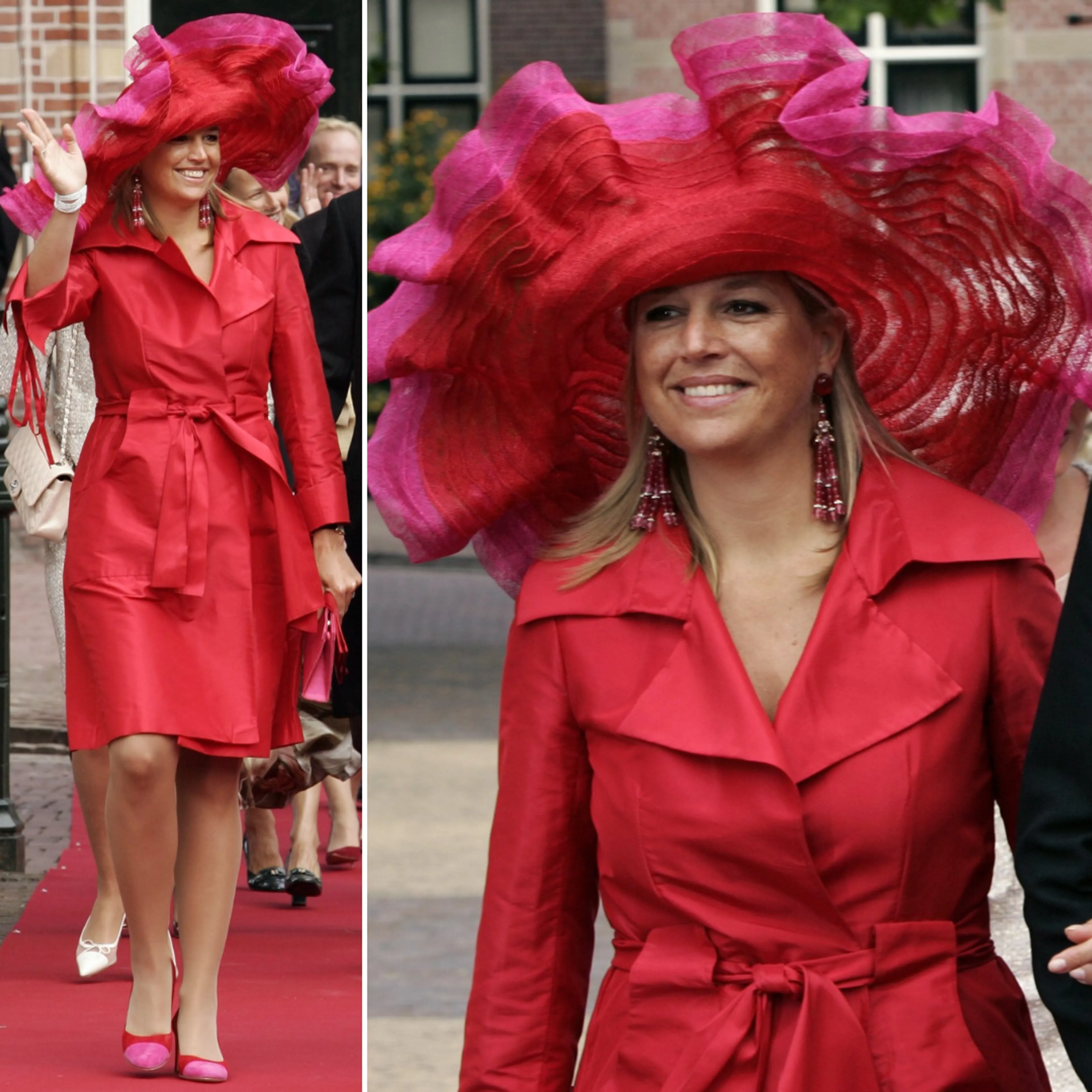 Voor het huwelijk van prins Pieter-Christiaan en prinses Anita draagt (dan nog) prinses M谩xima een heel opvallende outfit. De eenvoudige rode mantel wordt namelijk gecombineerd met een gigantische hoed.