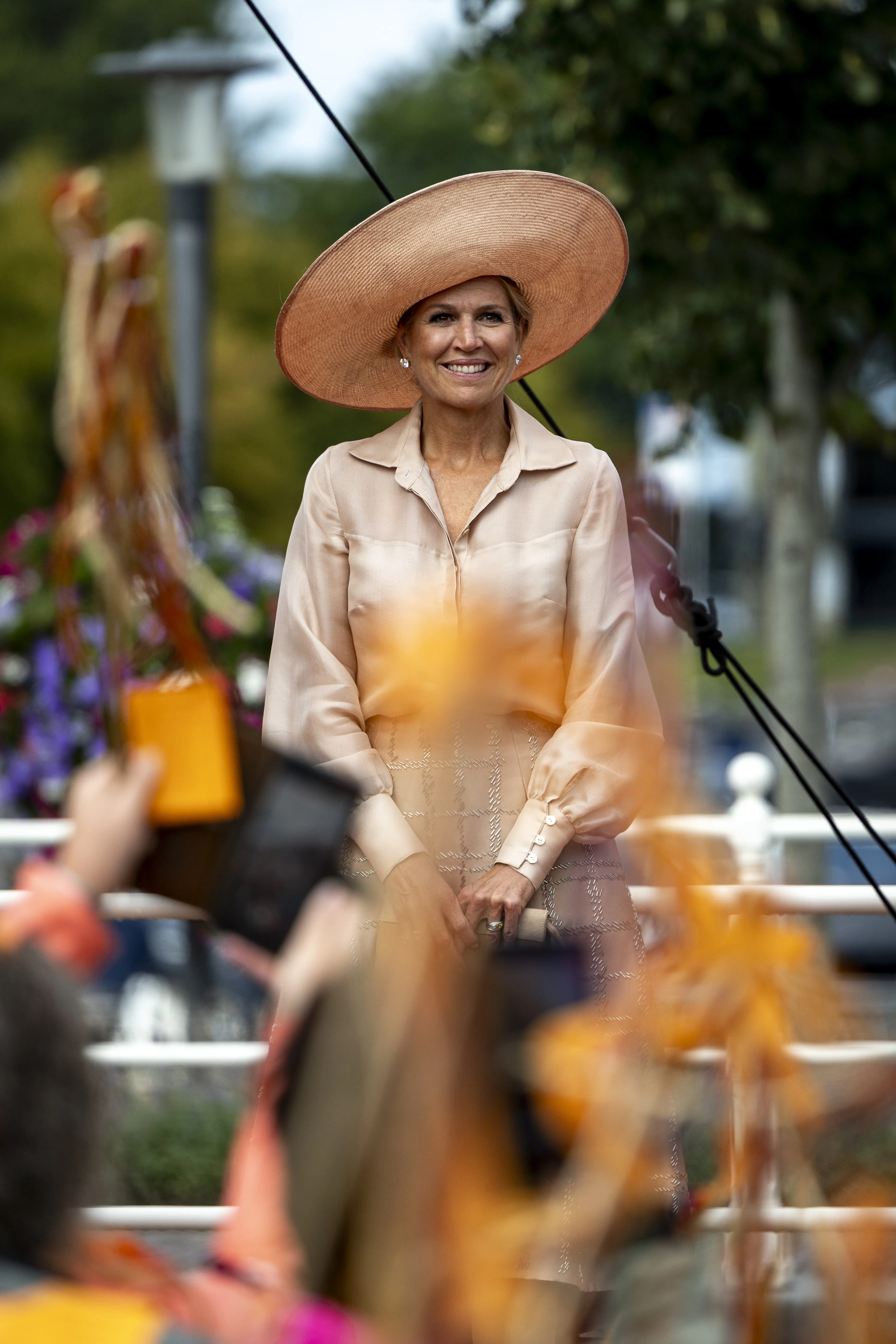 In tegenstelling tot het streekbezoek aan Flevoland, ging koningin Máxima donderdagmiddag gekleed in neutrale kleuren. Ze droeg een bekende rok van modehuis Natan met bijpassende top. Haar opgestoken kapsel zat onder een grote hoed.