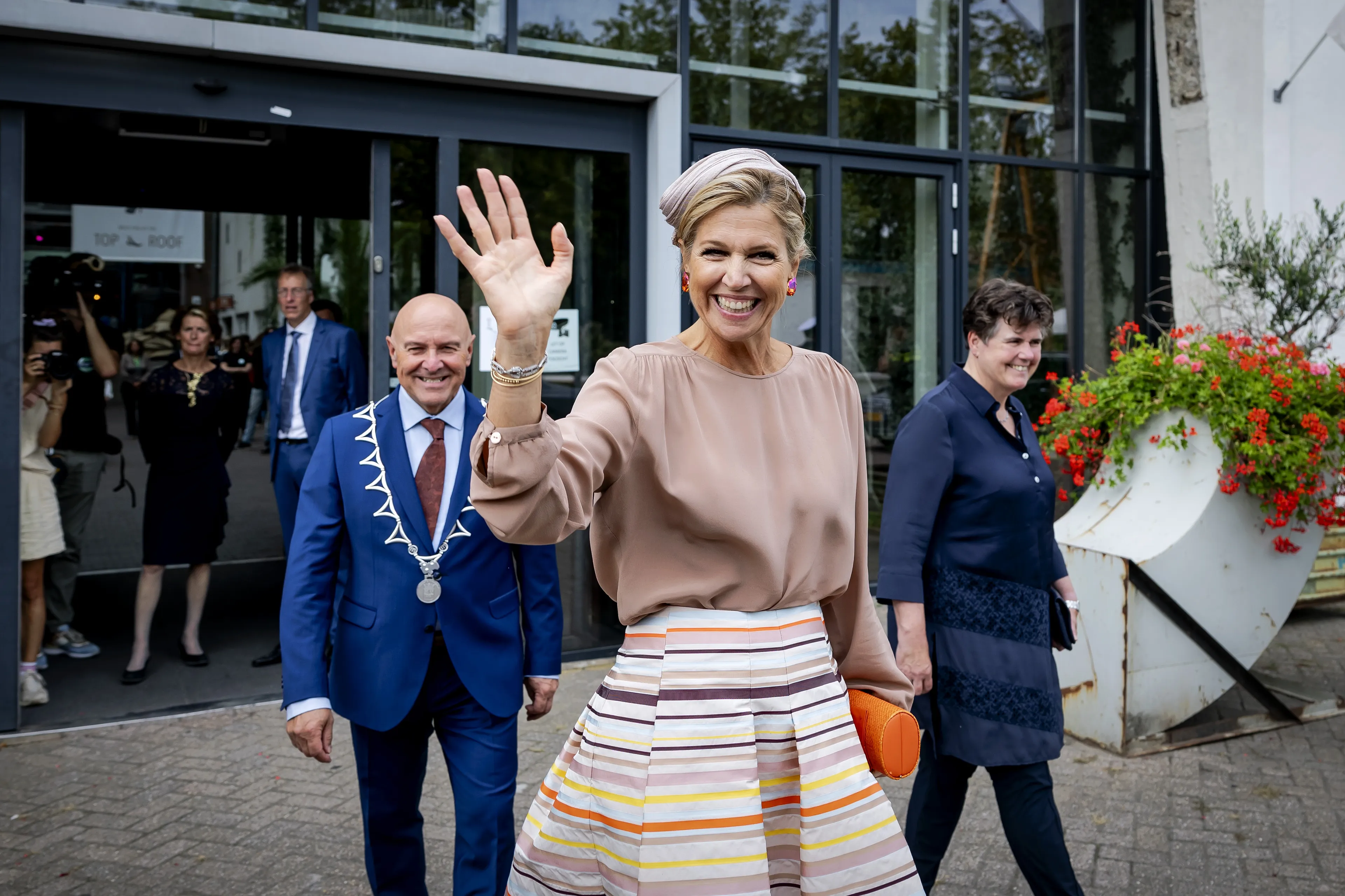 Voor deze middag ging koningin Máxima voor een kleurrijke look. De gestreepte rok met kleuren kocht de koningin al enige tijd geleden bij modehuis Natan. Ze combineerde het onderstuk met een oudroze blouse en een bijpassende calotte. Máxima koos een opvallende clutch in een oranje kleur, die weer goed matchte met haar diamanten oorbellen.