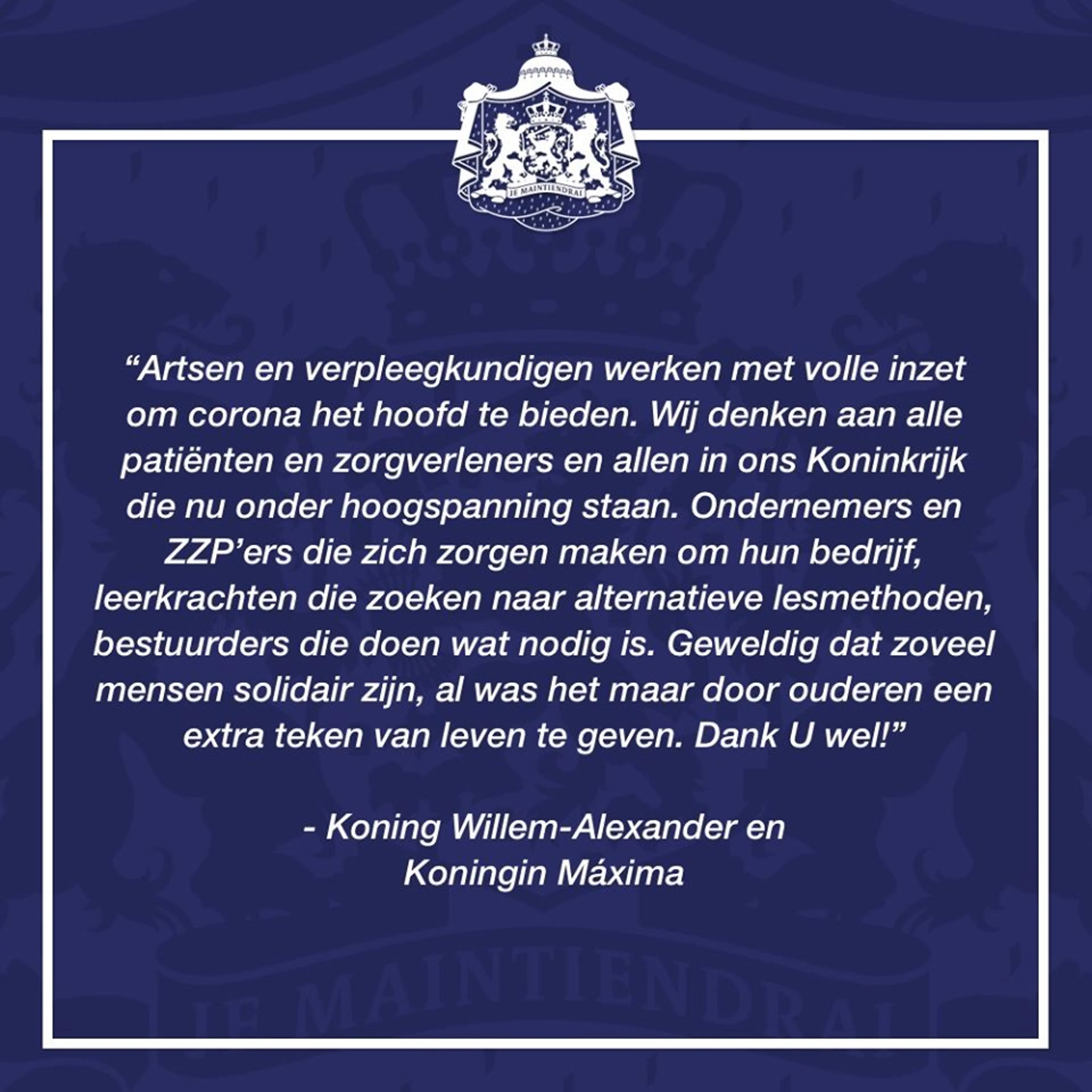 Het koningspaar reageerde eerder vandaag op de coronacrisis in ons land. "Wij denken aan alle patiënten en zorgverleners en allen in ons Koninkrijk die nu onder hoogspanning staan", schrijft het paar onder meer op de site en social mediakanalen van het Koninklijk Huis.