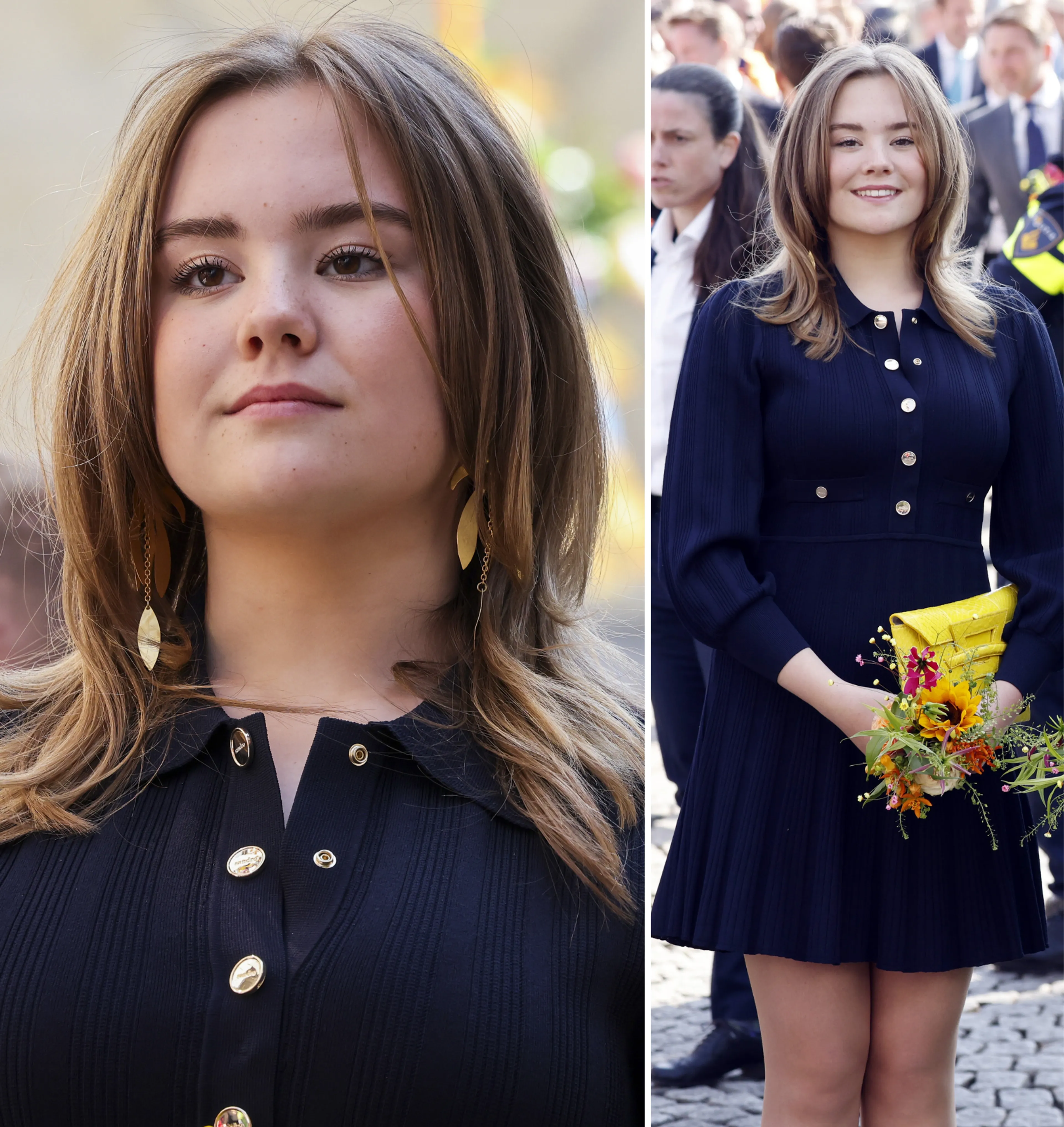 Prinses Ariane is gekleed in een donkerblauwe jurk van het merk Sandro. Daarbij draagt zij een gele clutch van Sophie Habsburg.