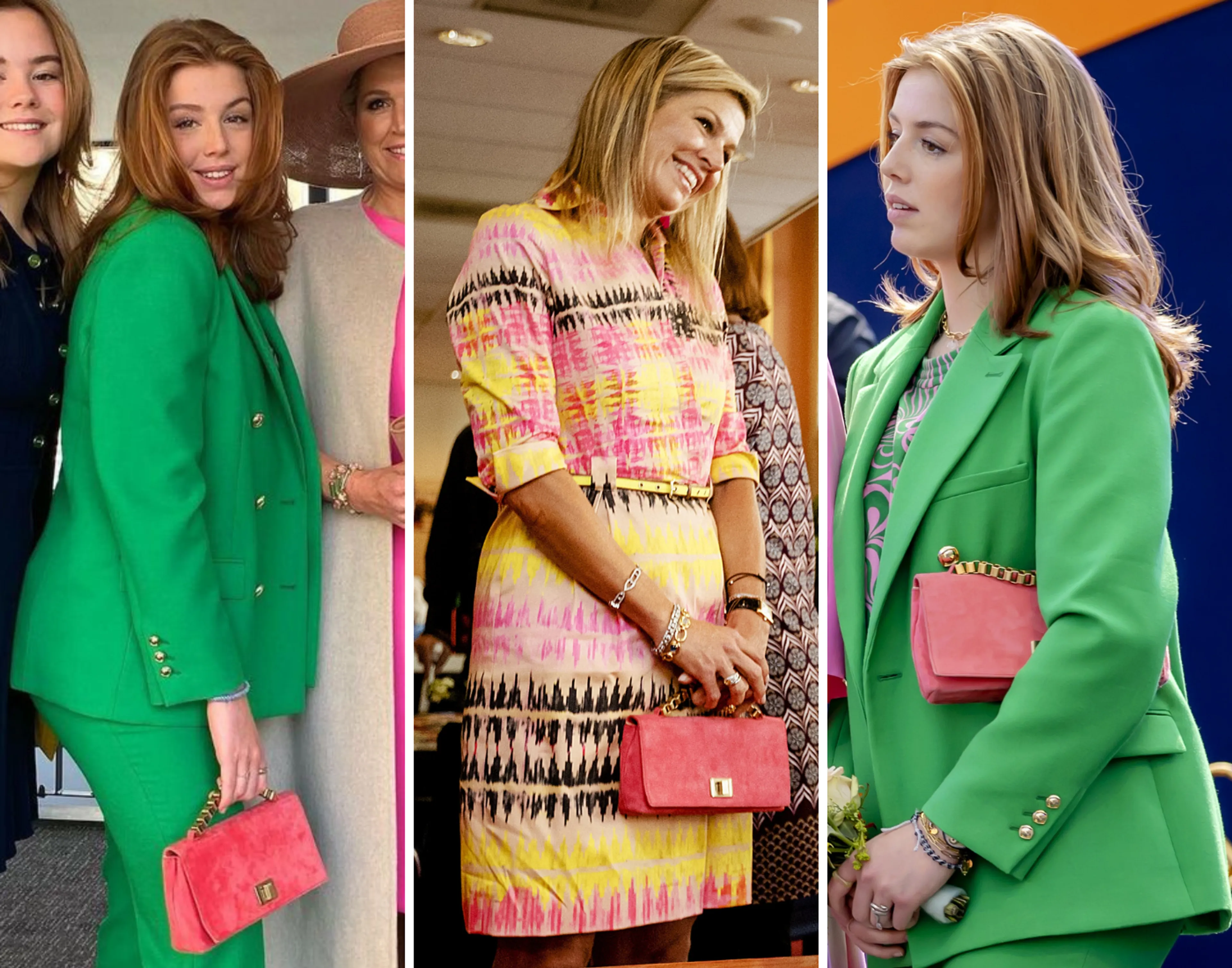 Het groene broekpak dat prinses Alexia draagt is van Tara Jarmon. Het roze tasje dat zij erbij combineert heeft ze van haar moeder geleend en is ook van Natan.