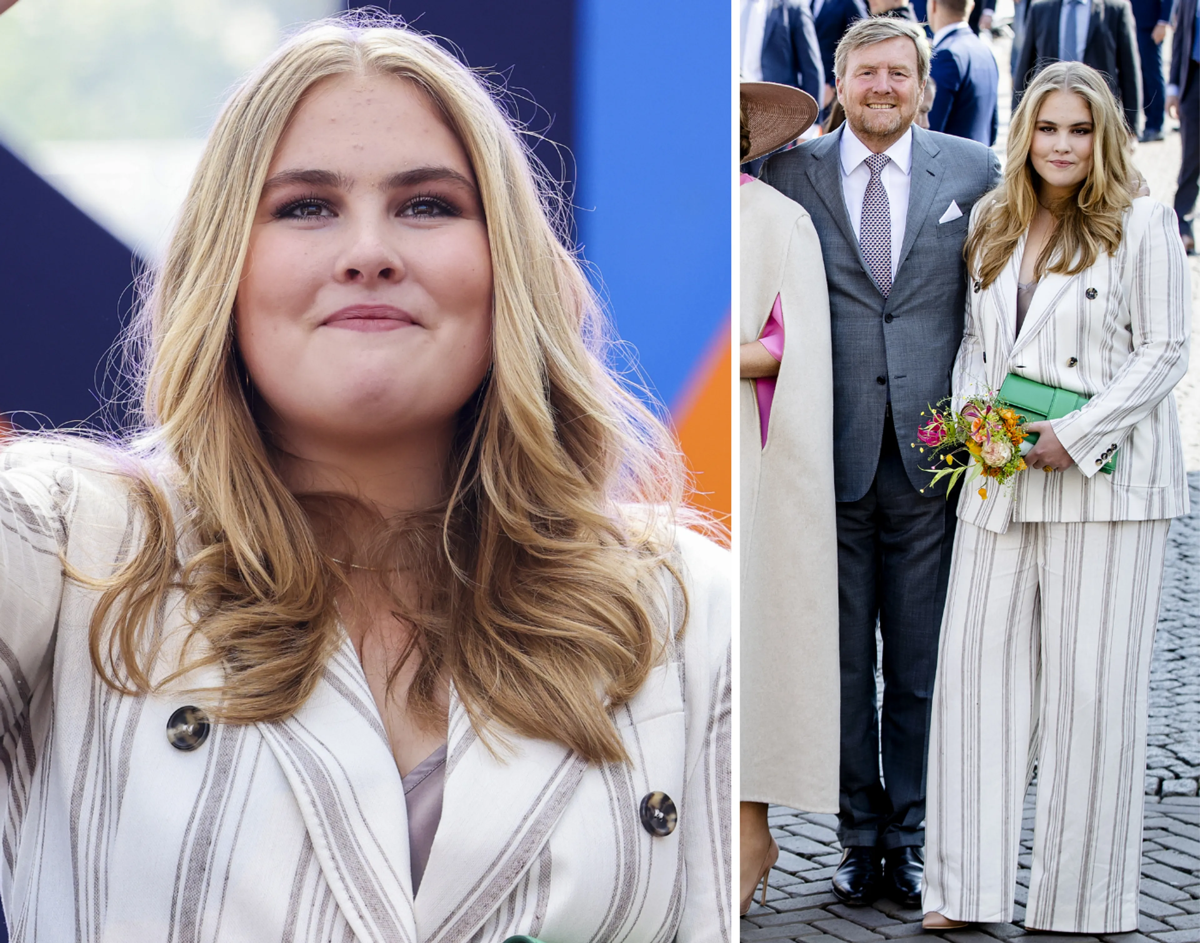 Kroonprinses Amalia heeft voor een linnen broekpak gekozen van het merk MaxMara.