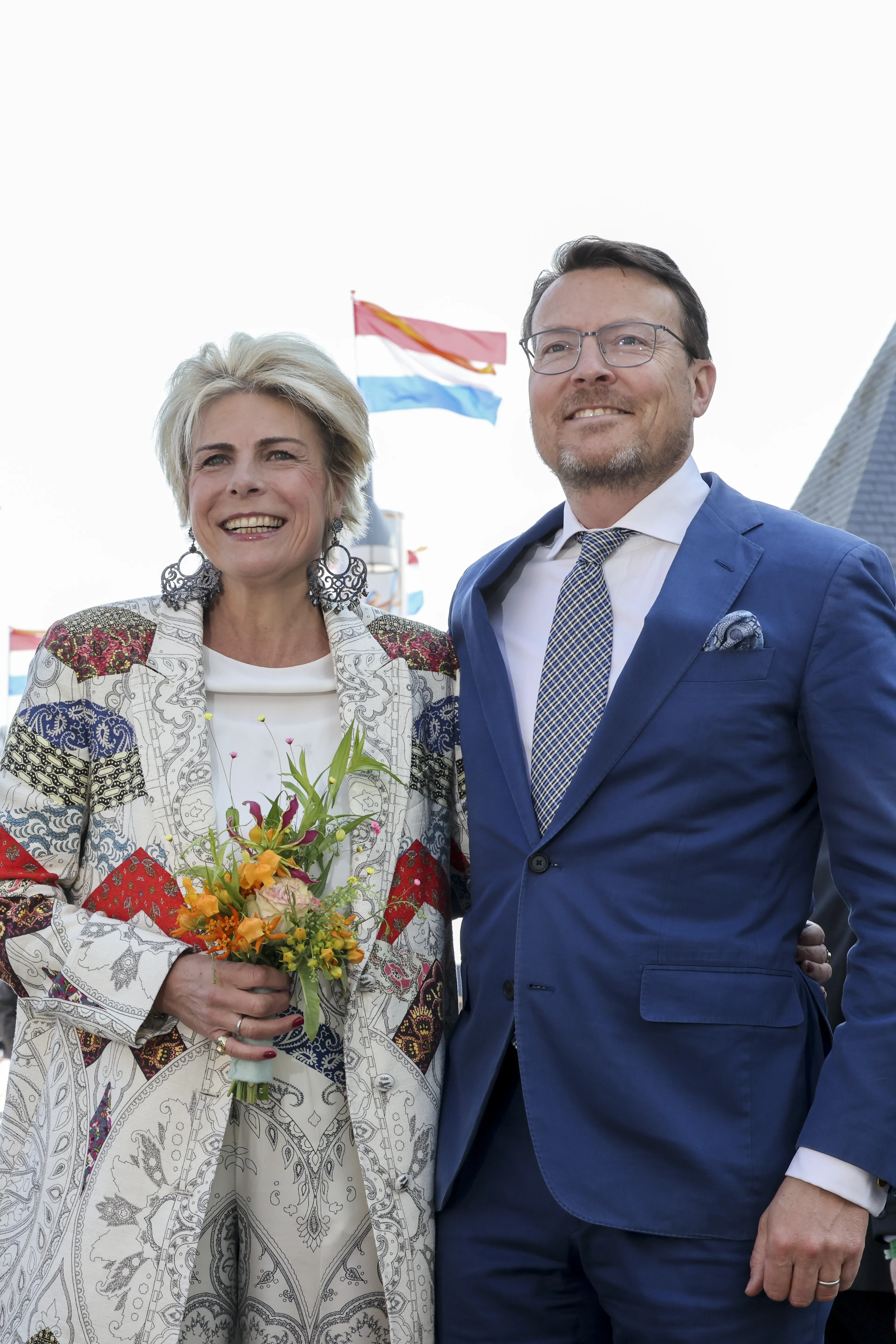 Ook prinses Laurentien draagt een frisse outfit. Zij heeft gekozen voor een mantel met bijpassende palazzo broek (broek met wijde pijpen) van het merk Etro.
