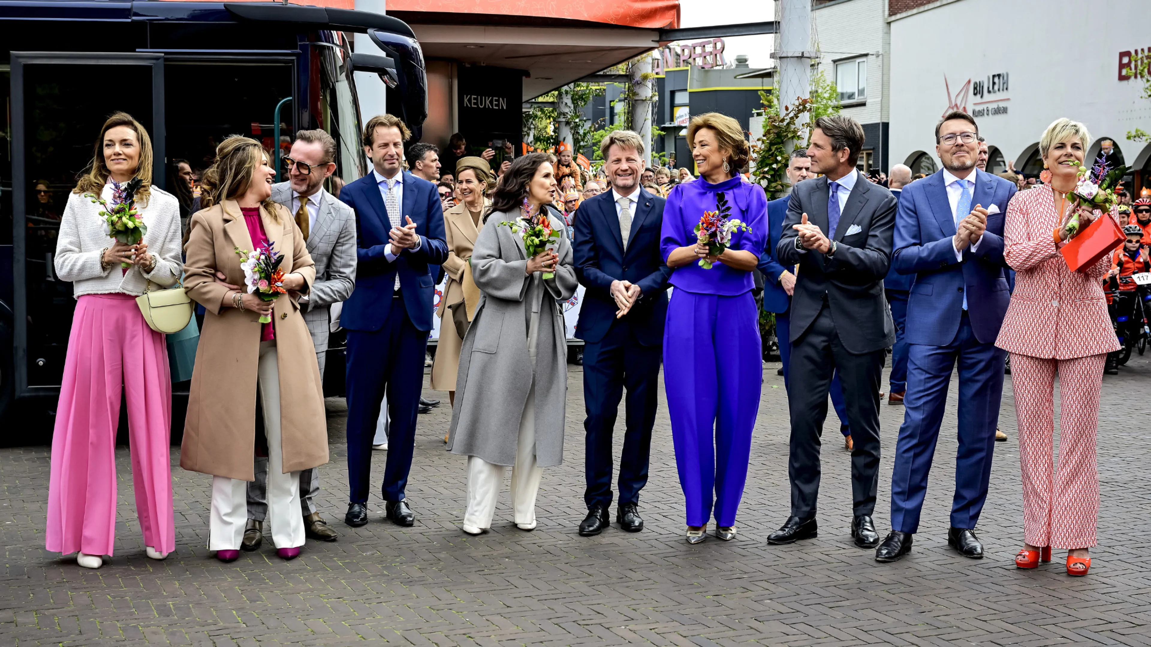 Prinses Laurentien draagt een bontgekleurd pak van Dea Kudibal. De kleuren rood, oranje en wit vallen helemaal in het thema van vandaag. Haar oranje oorhangers in de vorm van madeliefjes komen van Angelo Moretti, zo weet modejournalist Josine Droogendijk te vertellen op haar website.