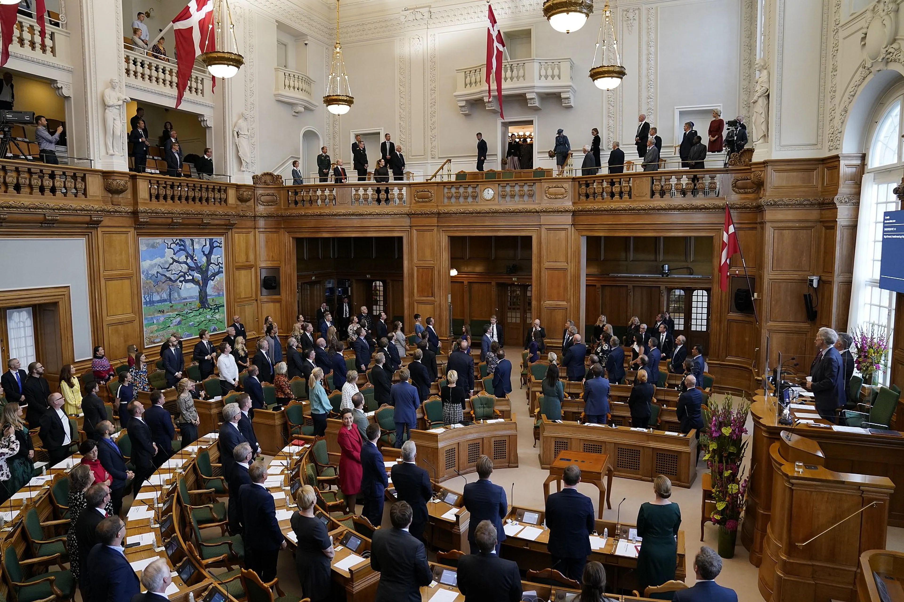 In de parlementszaal hoorden de royals premier Mette Frederiksen haar openingstoespraak geven. Frederiksen stond onder meer stil bij de coronacrisis en hoe het er in Denemarken voor staat. Ook kondigde zij aan dat de regering met een nieuw waarschuwingssysteem voor corona komt.
