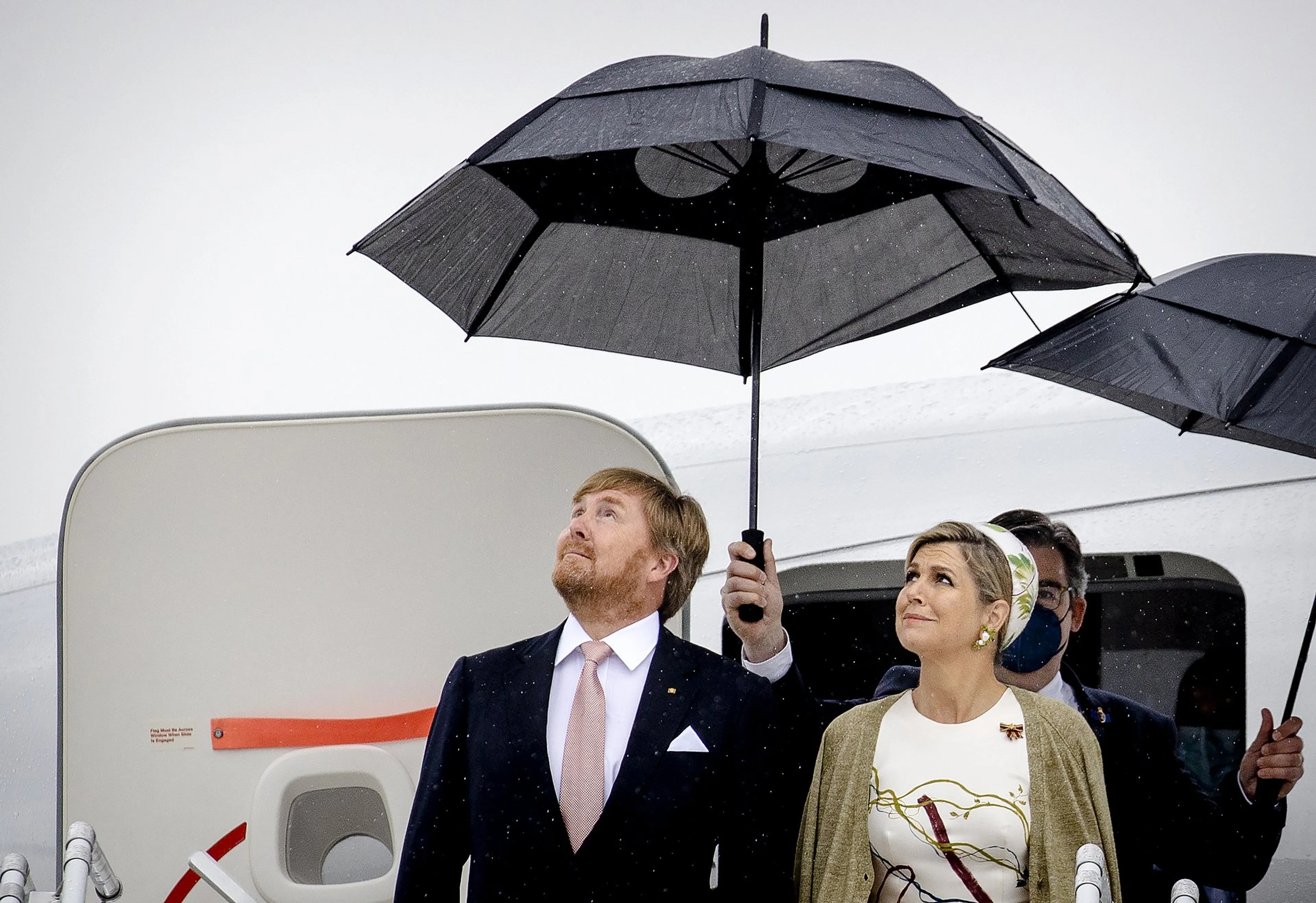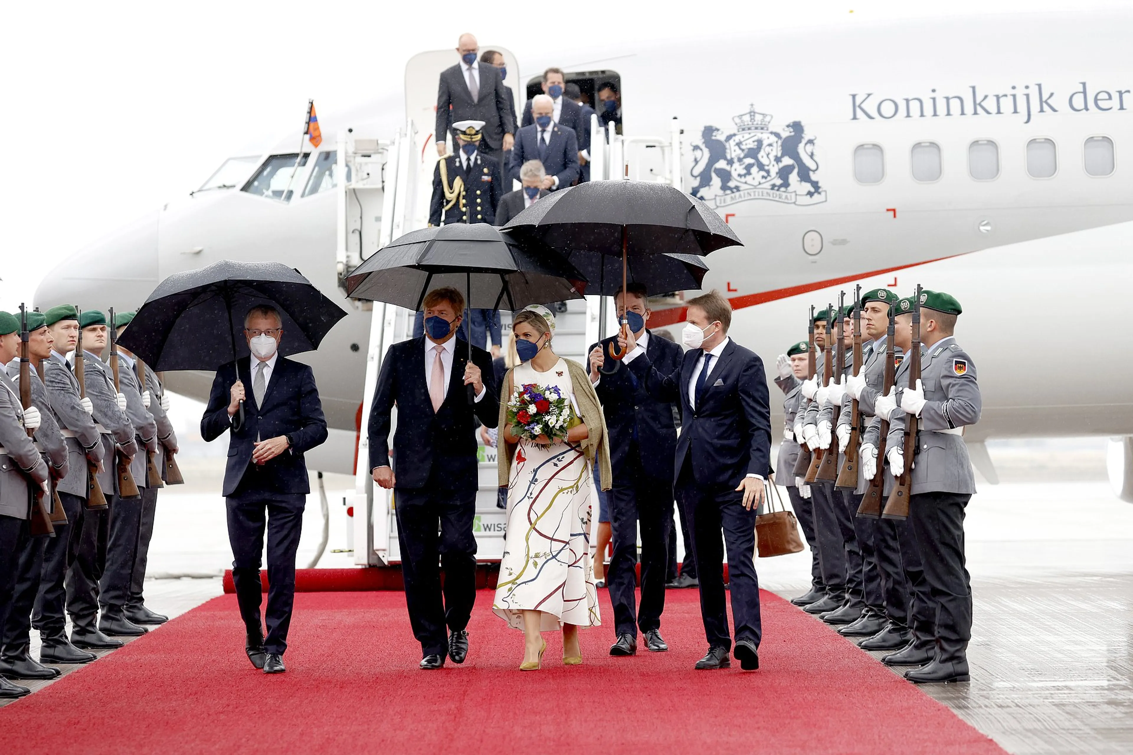 Koning Willem-Alexander heeft als copiloot het regeringsvliegtuig van Nederland naar Berlijn gevlogen. Twee Duitse Eurofighter-straaljagers begeleidden het toestel bij de landing. Het koningspaar werd vervolgens begroet met 21 saluutschoten en werd bij de vliegtuigtrap verwelkomd door een Duitse delegatie en de Nederlandse ambassadeur in Berlijn. Vervolgens inspecteerden ze de erewacht.