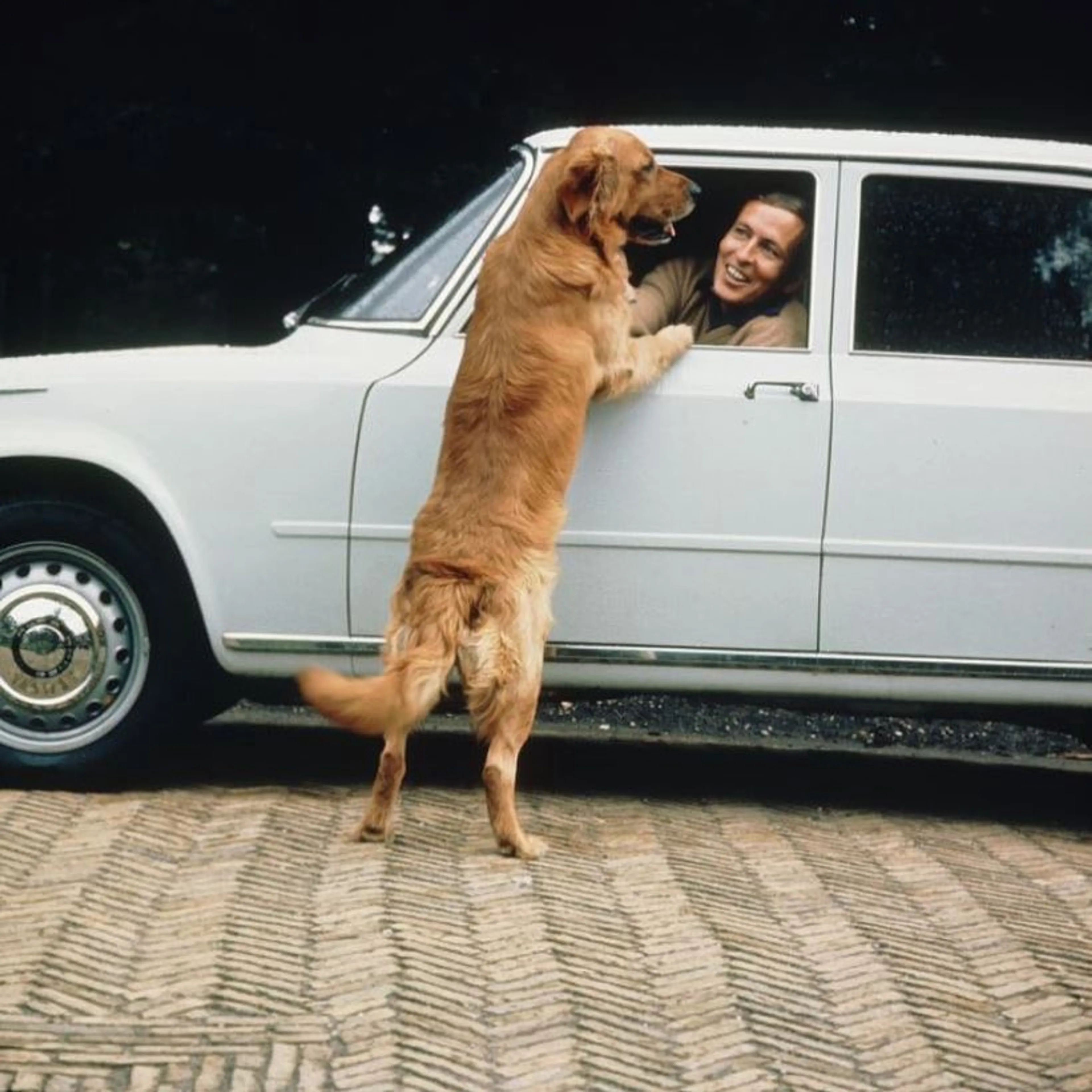 Het Koninklijk Huis grijpt donderdag dierendag aan voor het publiceren van een foto uit juni 1966, waarop prins Claus in zijn auto wordt begroet door golden retriever Joris op Kasteel Drakensteyn.