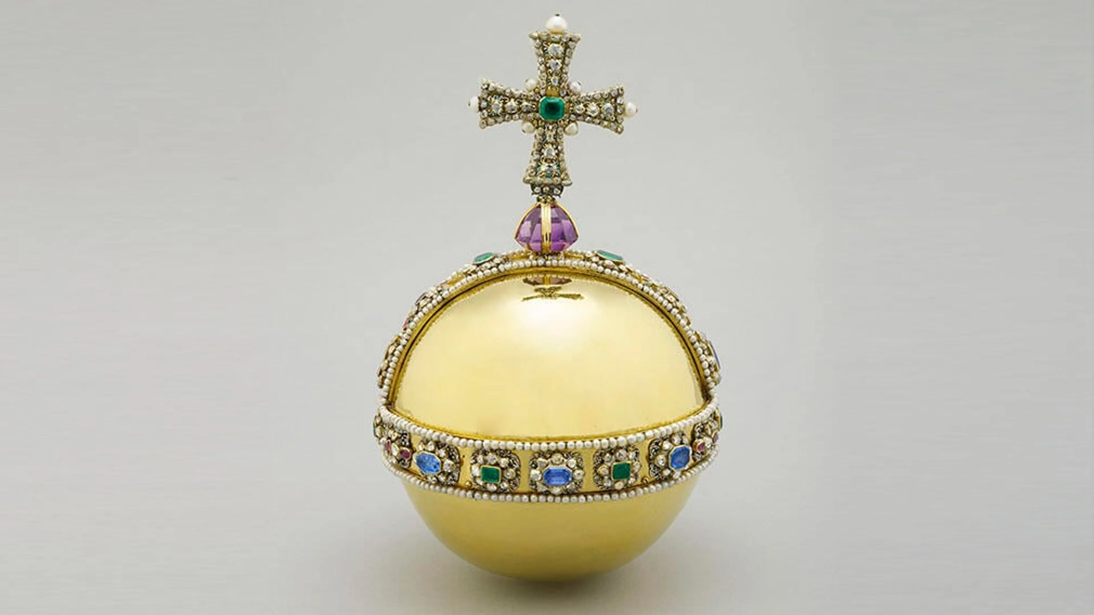 De Soevereins Orb (rijksappel) weegt 1,32 kg en is versierd met smaragden, robijnen, saffieren en omgeven door diamanten en parels.