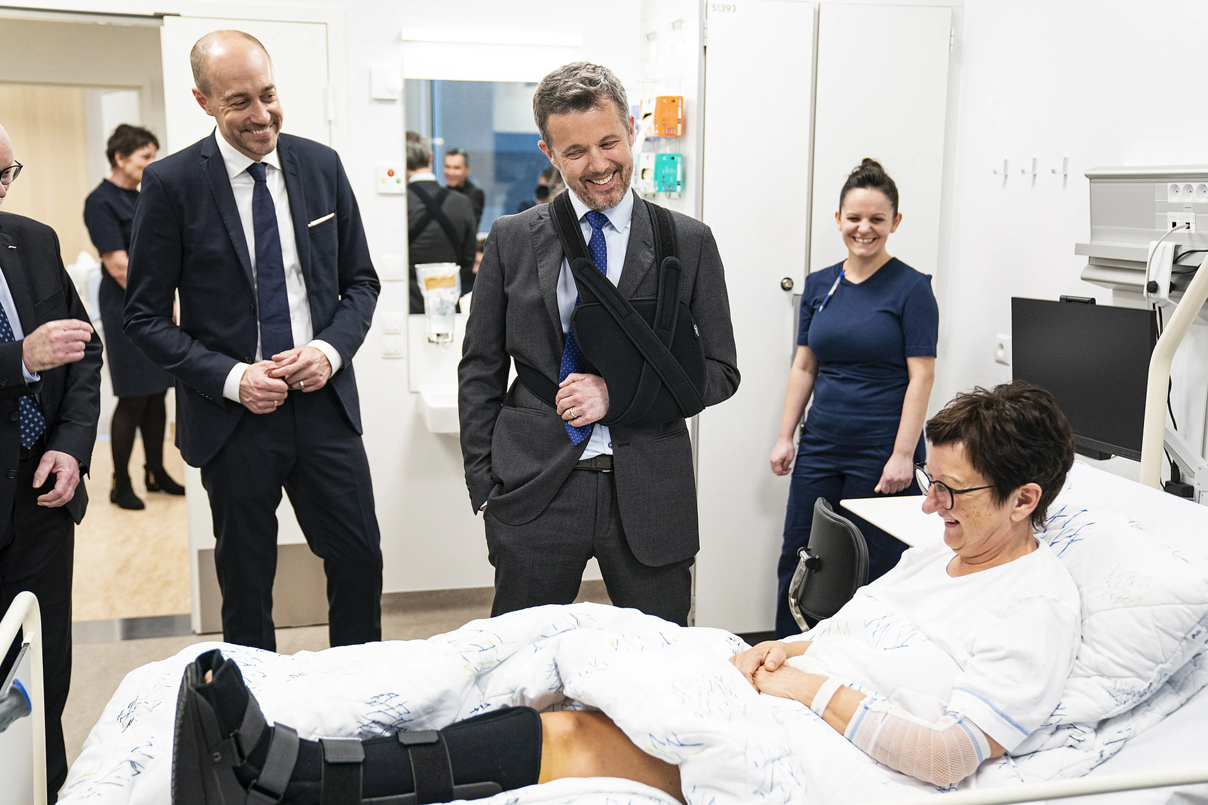 De Deense kroonprins Frederik heeft donderdag een nieuw ziekenhuis geopend in Aabenraa. Omdat Frederik door een ski-ongeluk zelf met zijn arm in het gips en een mitella zat, kon hij zich goed identificeren met sommige van de patiënten.