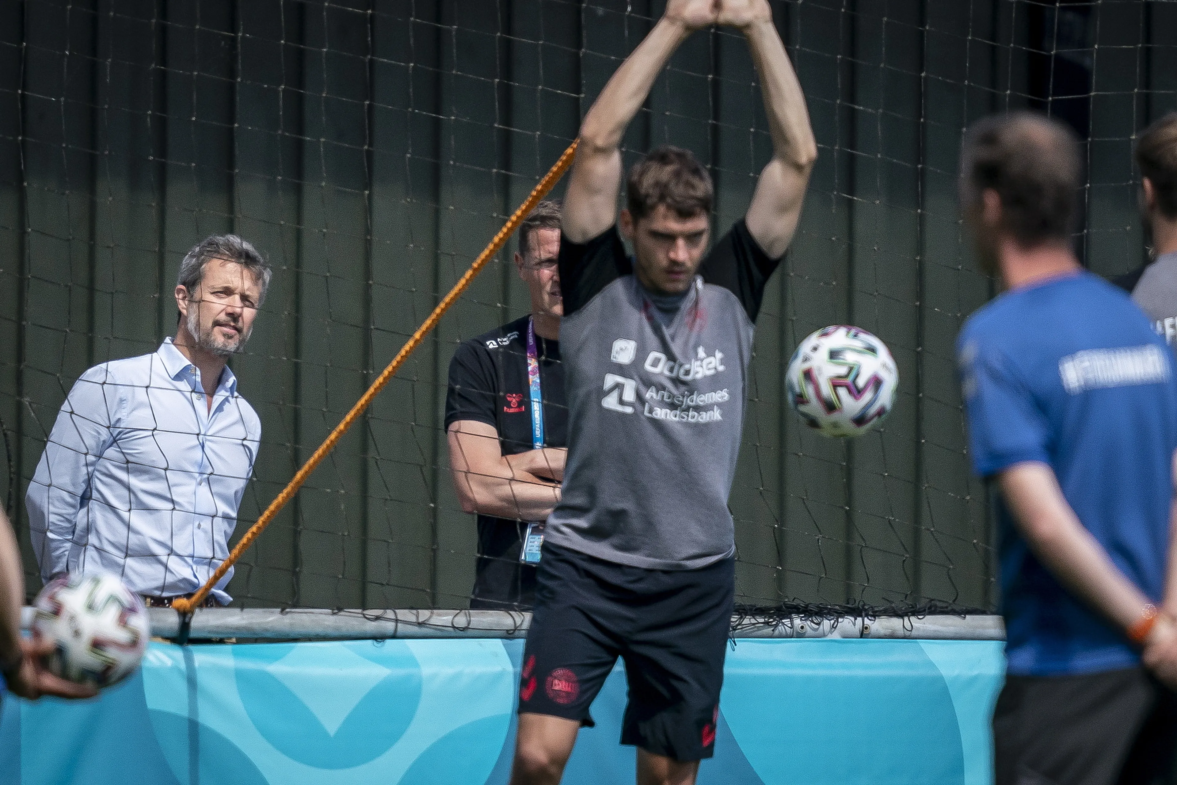De kroonprins hoorde het laatste nieuws dinsdag uit eerste hand. Frederik sprak onder anderen met bondscoach Kasper Hjulmand en zijn asisstent Morten Wieghorst. Ook ontmoette hij enkele spelers.
