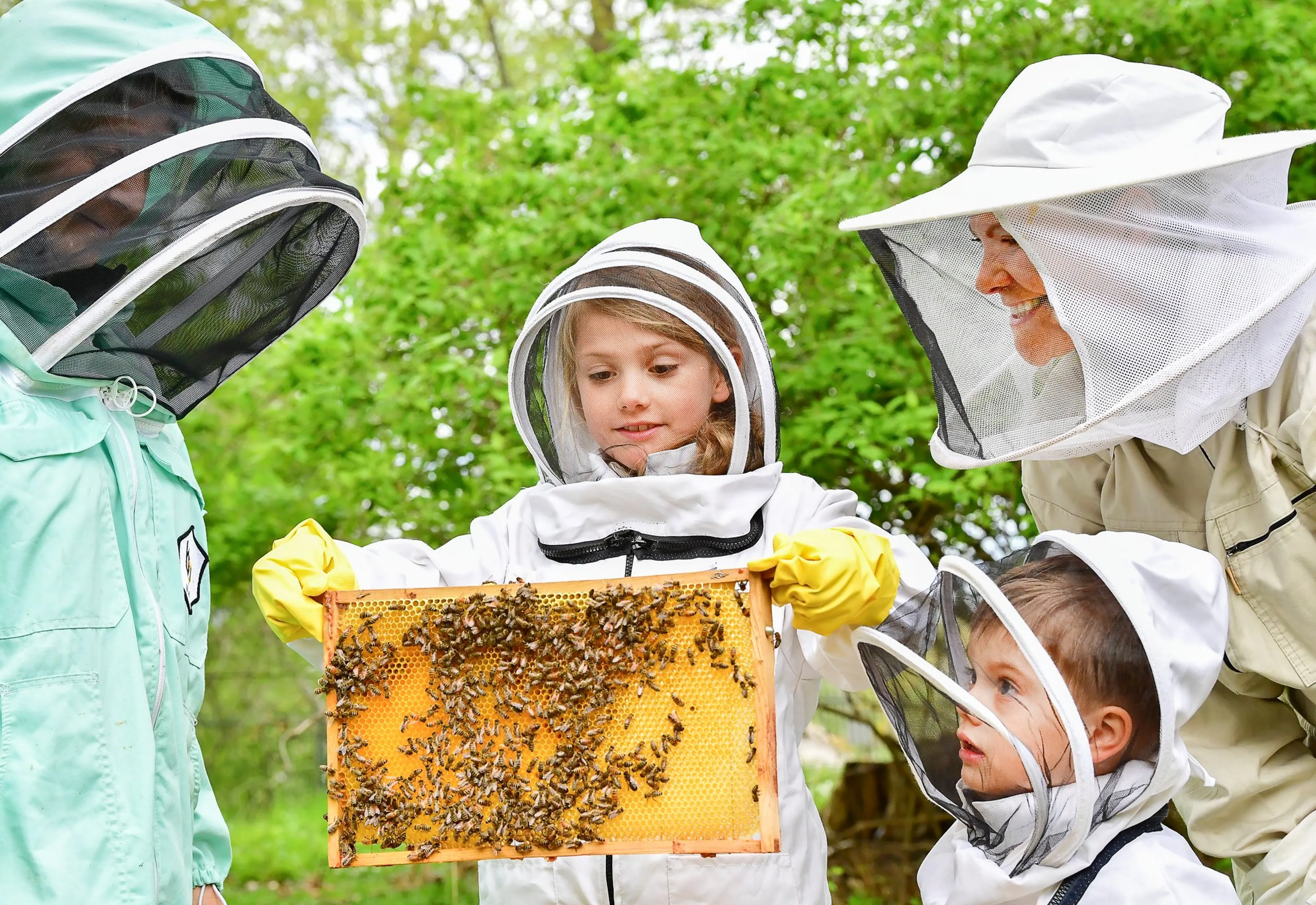 Kroonprinses Victoria en kinderen tussen de bijen