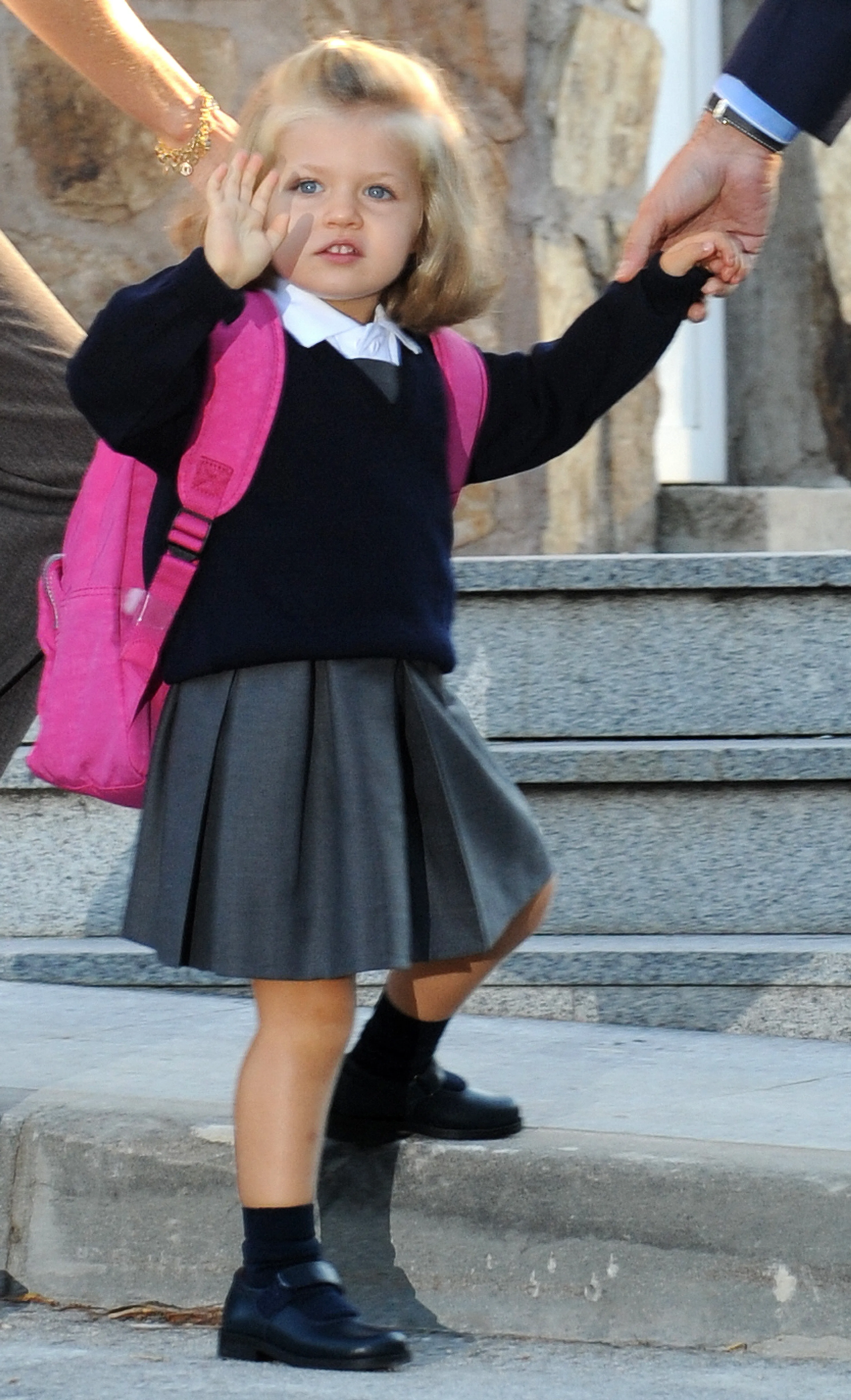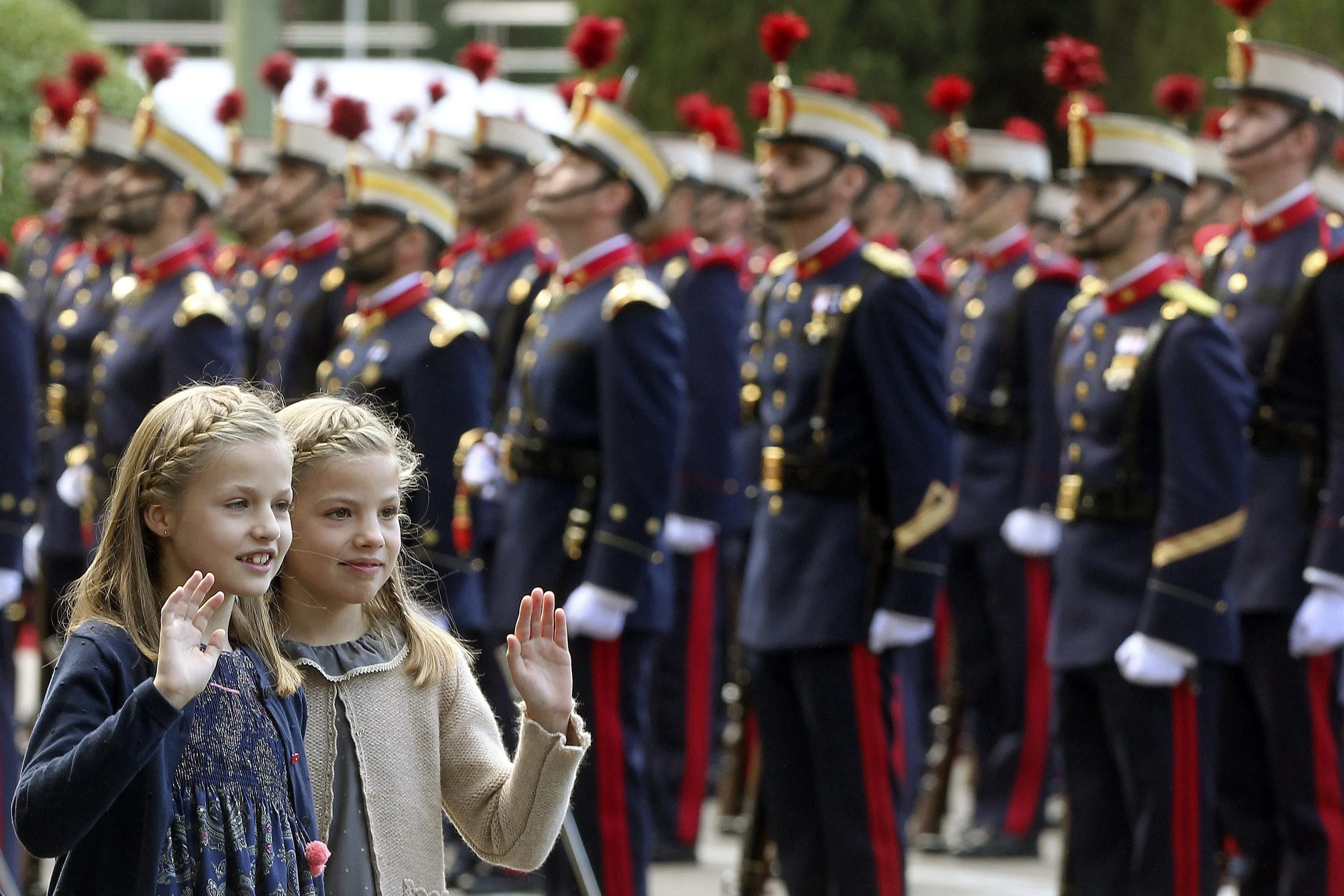 Tijdens de Spaanse nationale feestdag in 2015 zwaait een 10-jarige Leonor samen met haar zusje naar de soldaten die een parade opvoeren.