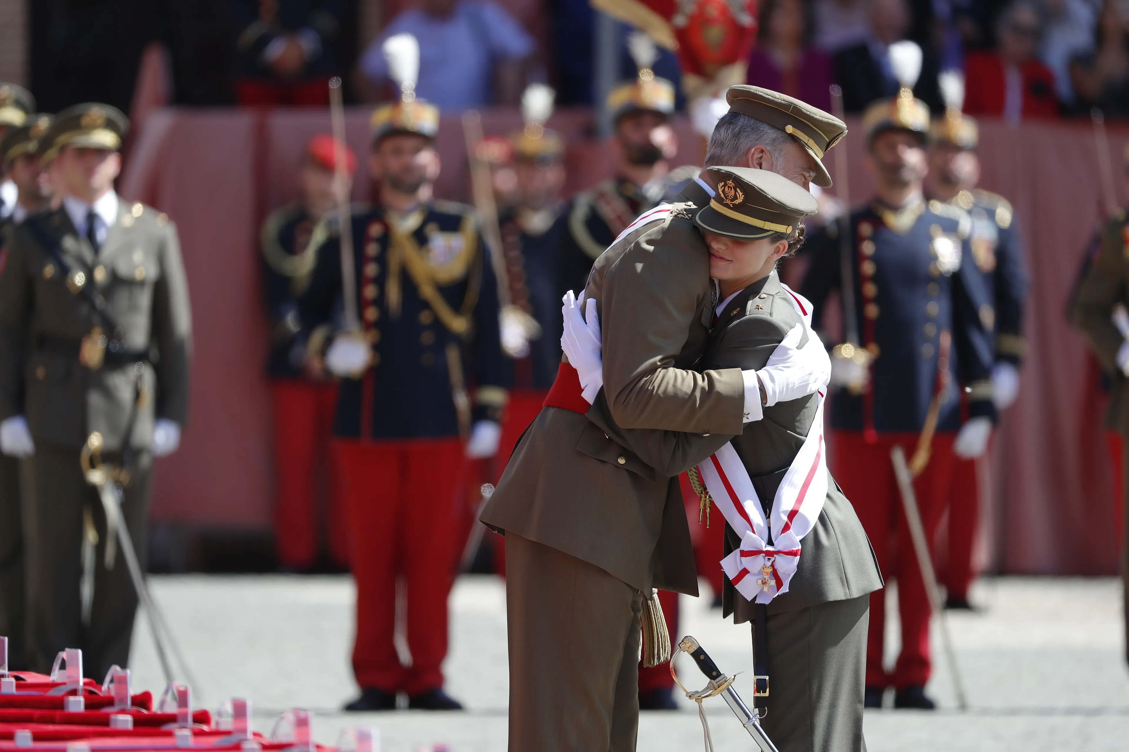 Na de benoeming voegde prinses Leonor zich bij haar moeder koningin Letizia en haar zusje prinses Sofía, van wie ze ook een omhelzing kreeg.