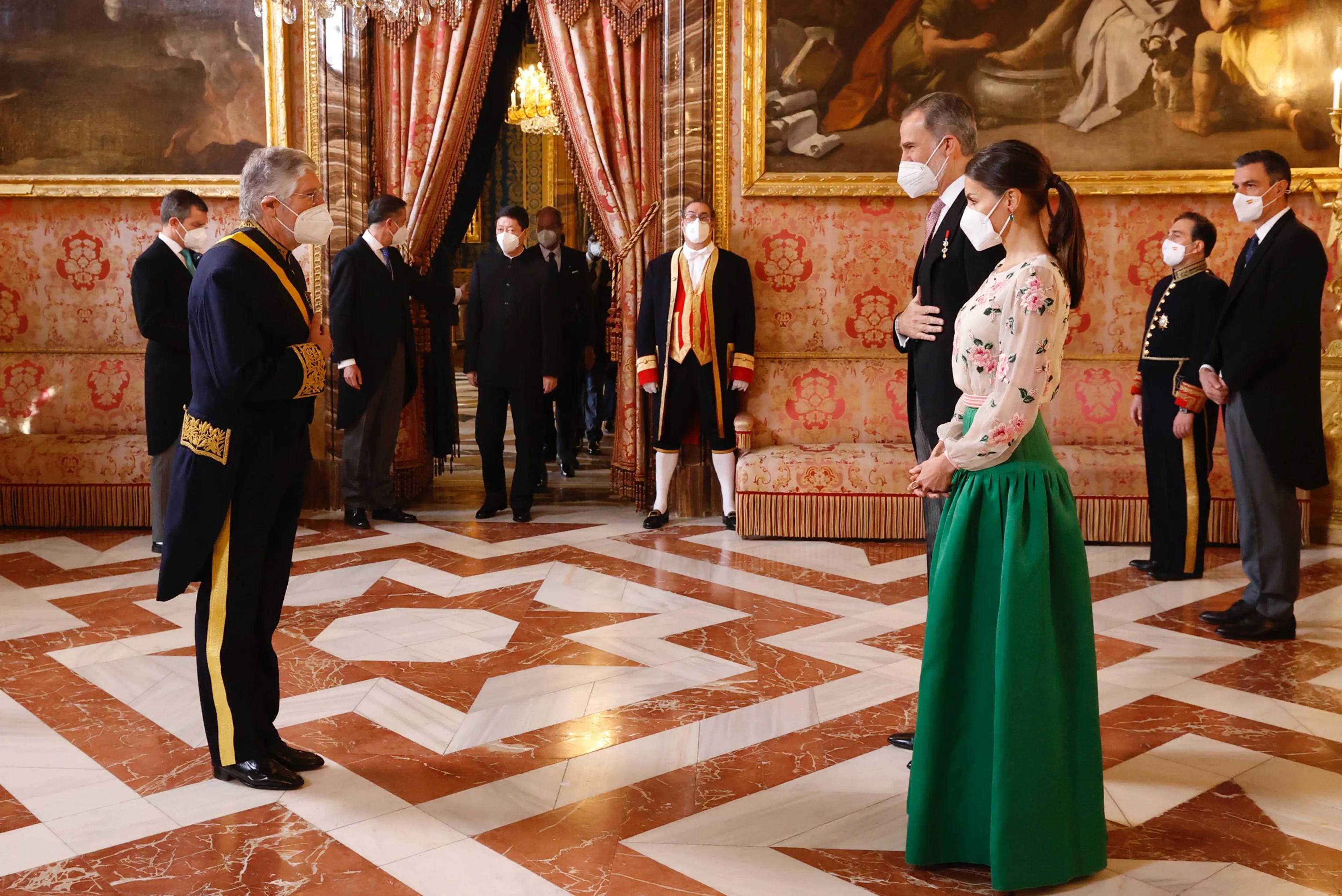 Nu in ons land de Nieuwjaarsontvangsten in het Paleis op de Dam wederom geschrapt zijn, keken we vandaag graag even over de grens. Koningin Letizia verraste ons met een voor haar doen best wel uitbundige outfit. Meestal is de echtgenote van koning Felipe in één kleur en ingetogen gekleed, maar op deze Blue Monday pakte ze uit met een zachtroze blouse met geborduurde bloemen en een groene volumineuze rok.