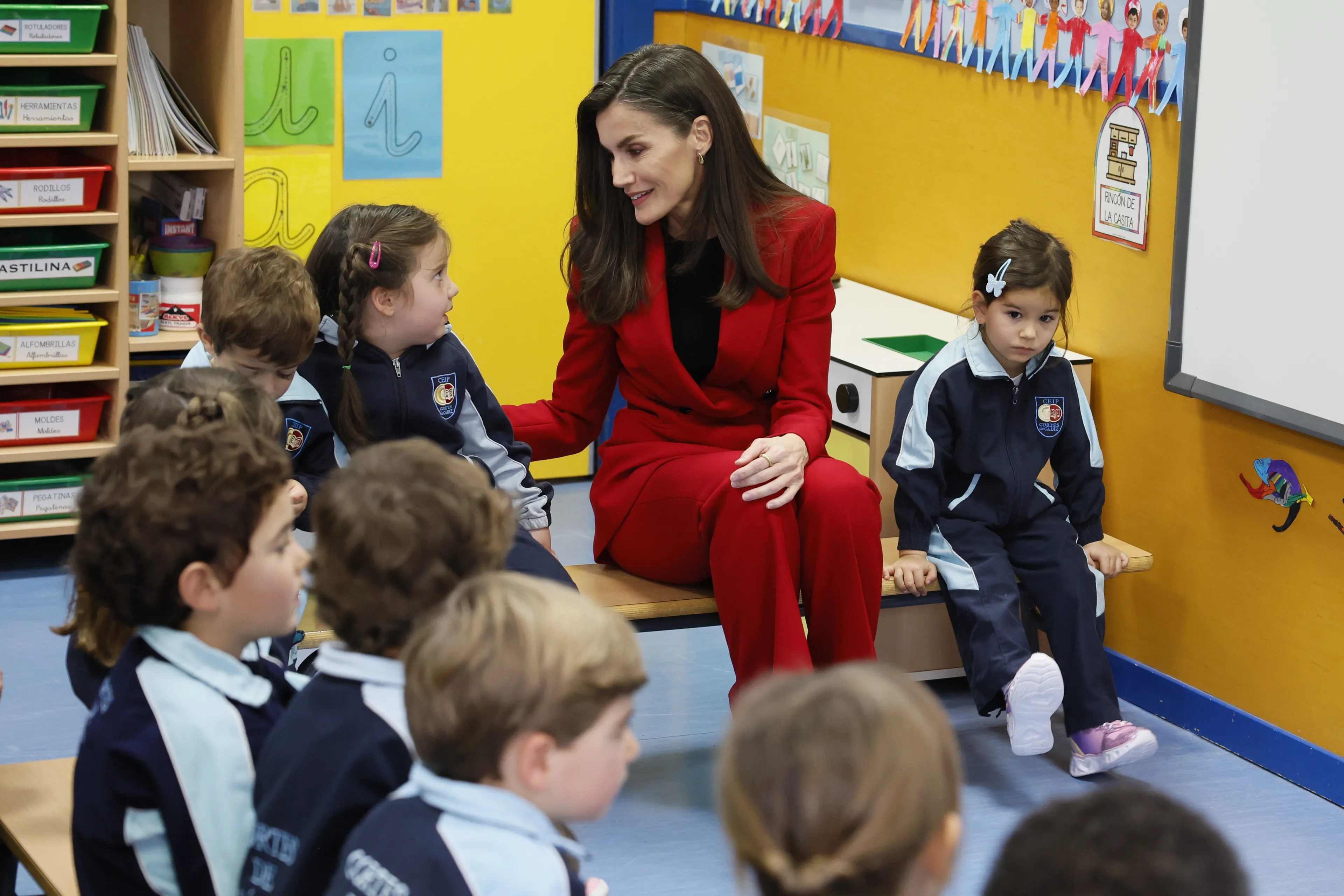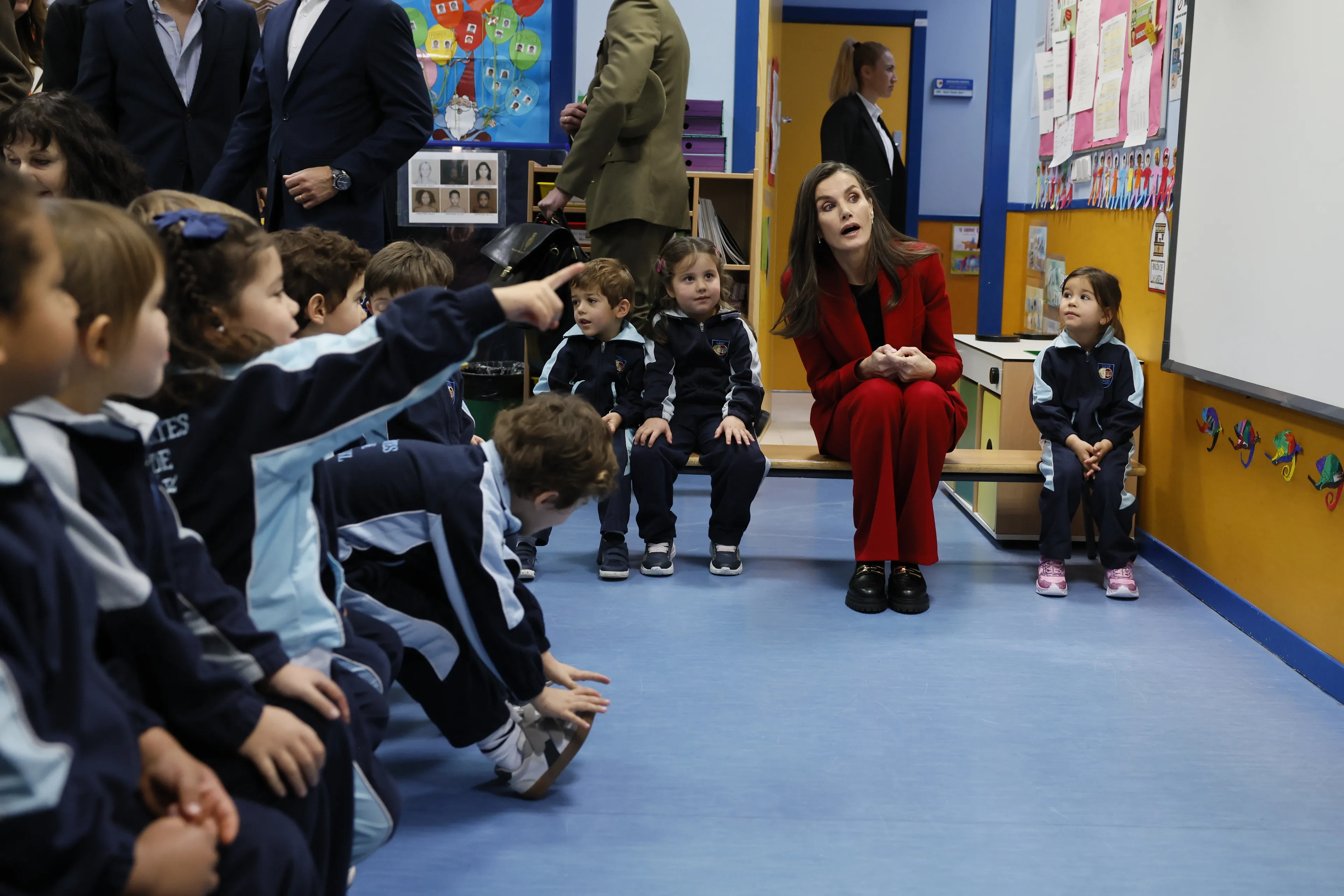 Het is natuurlijk super spannend als de koningin in de klas komt voorlezen. Dat was het ook voor de leerlingen van een openbare basisschool in Madrid. Op de beelden is te zien hoe de hele school uitliep om op de foto te gaan met de koningin, die voor de gelegenheid een felrood broekpak van Boss droeg. Boss is een van de favoriete merken van de koningin. Zo viel zij in ieder geval op tussen de studenten die allemaal hetzelfde uniform aan hadden.