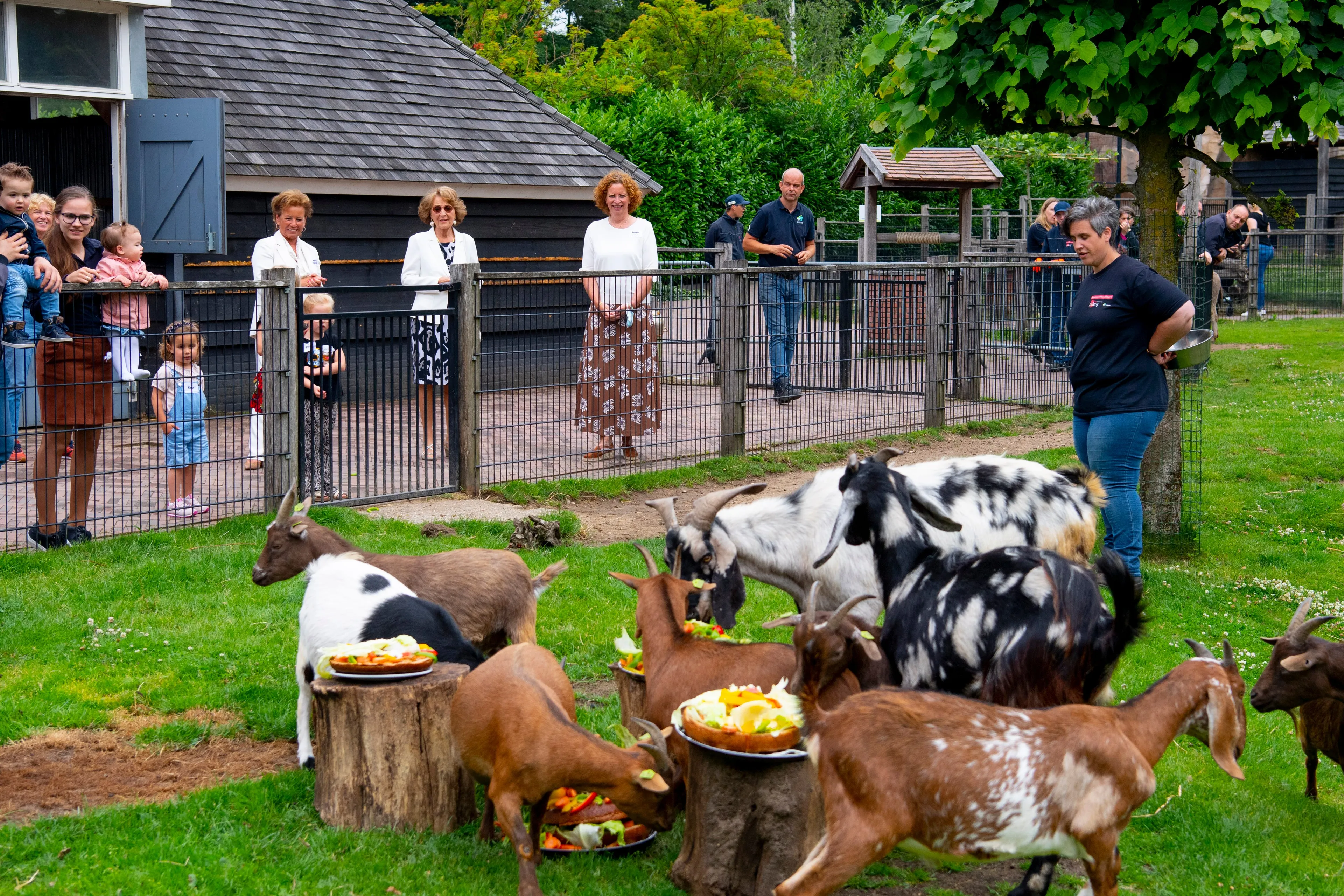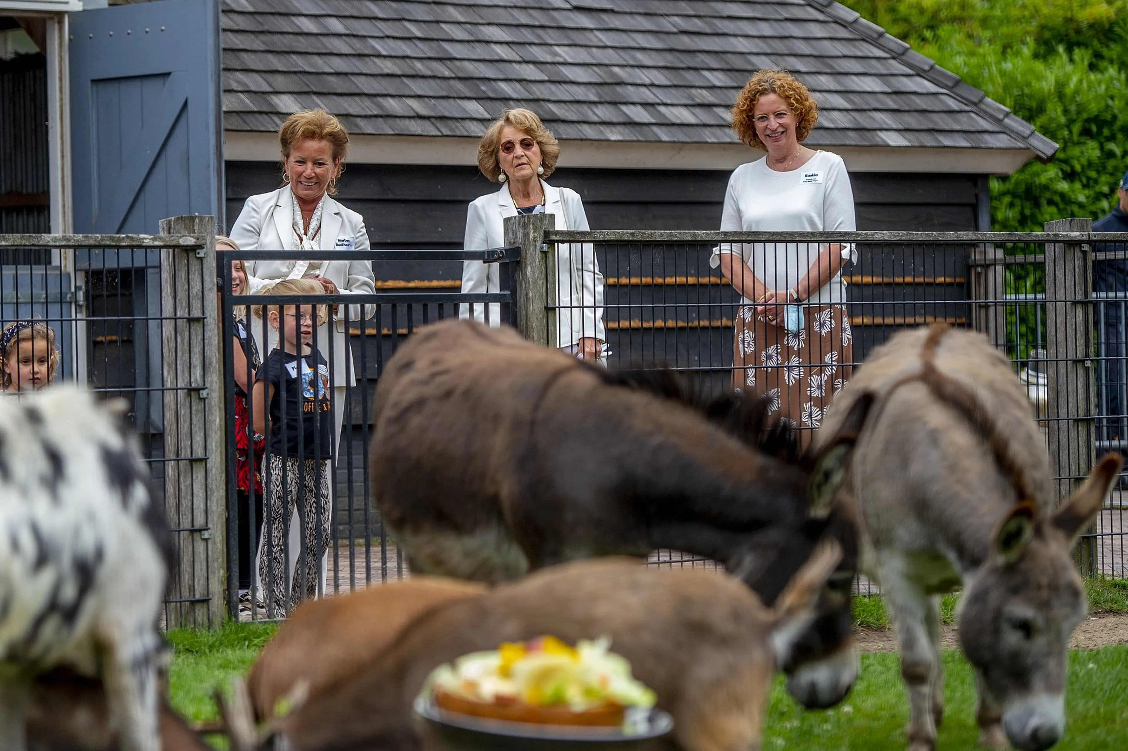Tegelijkertijd werden aan de tafels door de kinderen en hun ouders traktaties gemaakt voor de dieren. Vervolgens liep Margriet met de kinderen mee naar de kinderboerderij naast het huis, om de ezels en geiten - die enige aansporing nodig hadden om te komen eten - te voeren.