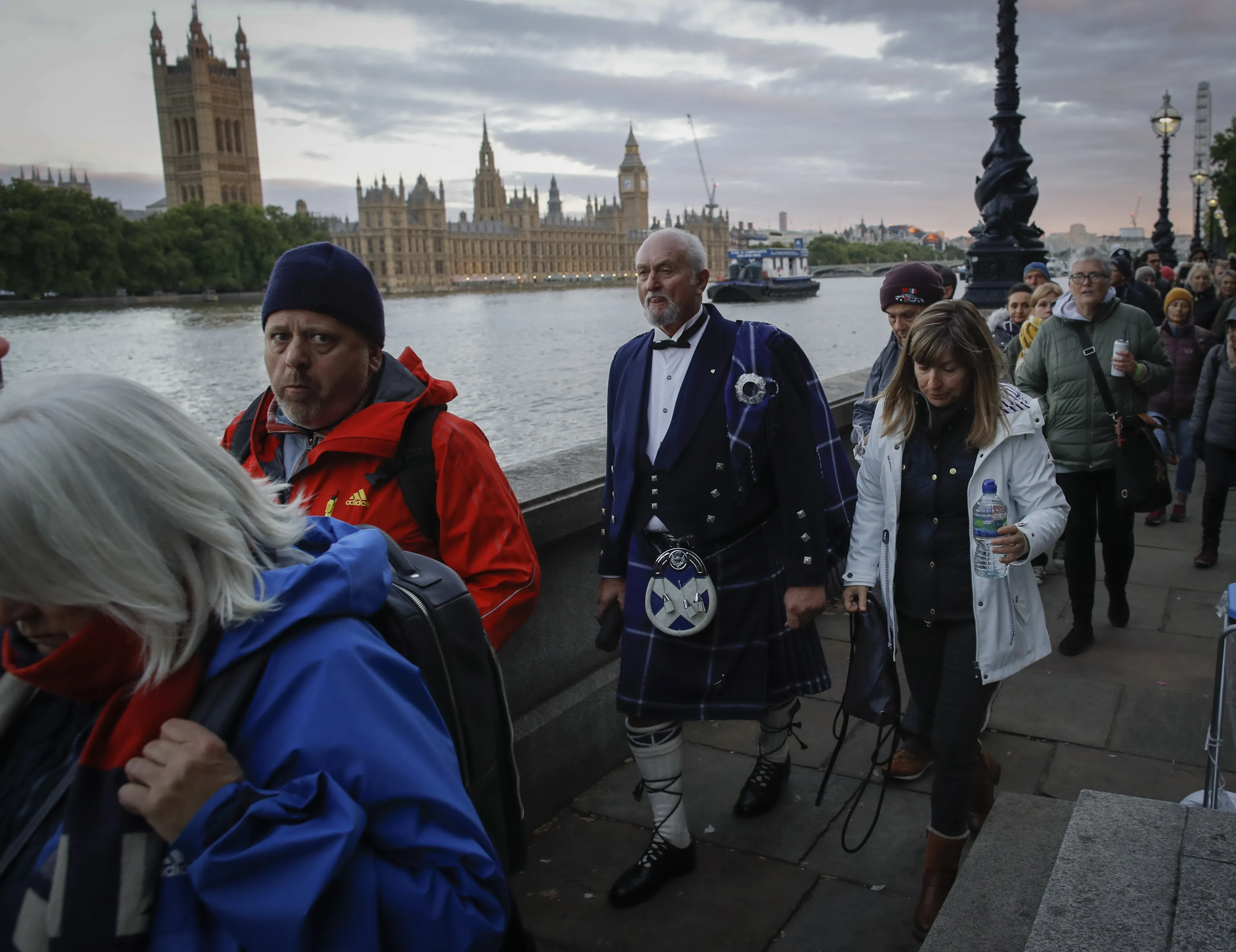 Rond 18.00 uur komt er echter pas beweging in de rij: dan mogen mensen Westminster Hall binnengaan. Bezoekers worden gewaarschuwd voor een wachtrij van zo'n dertig uur. Stilstaan naast de kist is niet toegestaan, de rij blijft in beweging.