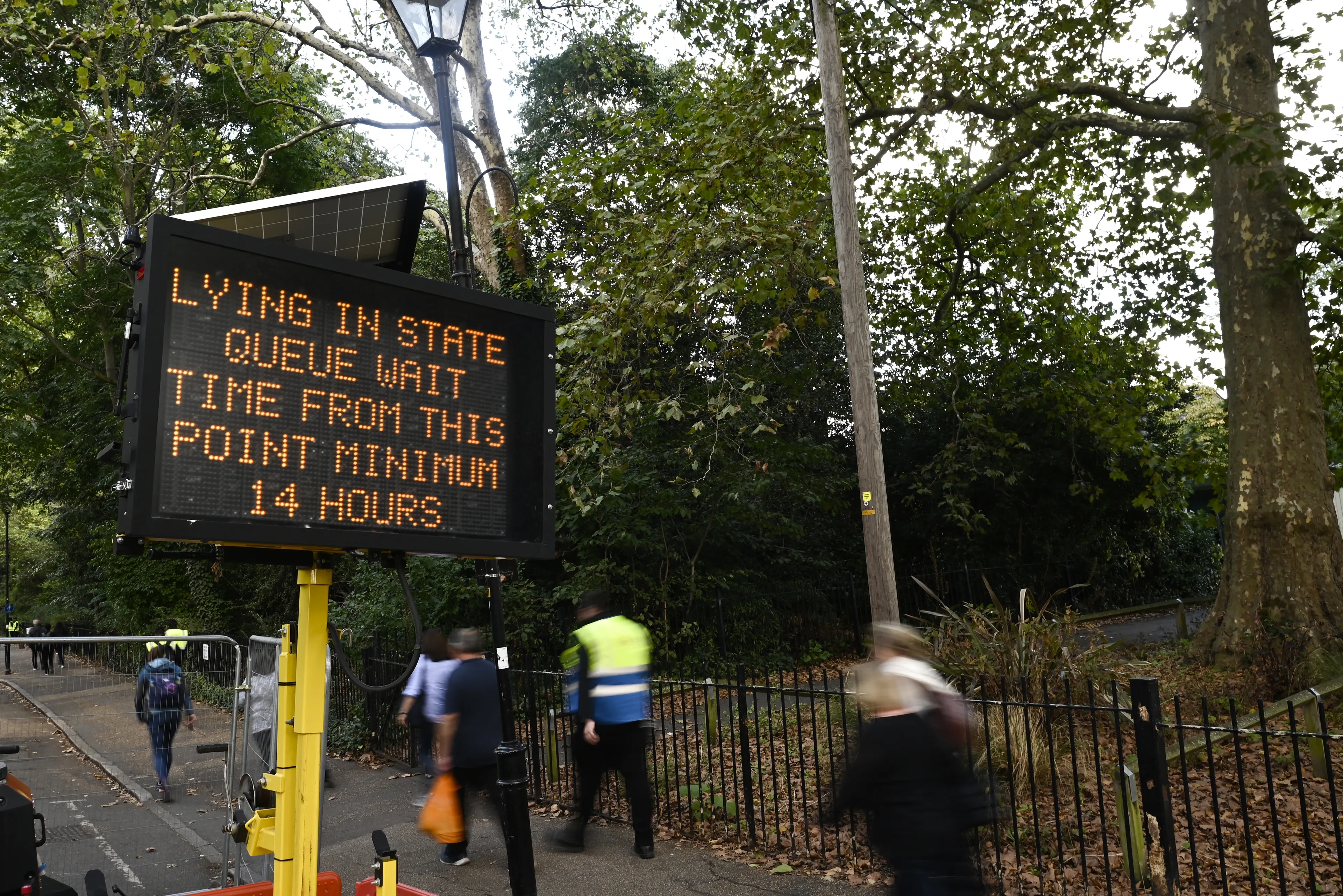 De Britse autoriteiten raden mensen af om zich nog aan te sluiten in de rij om afscheid te nemen van koningin Elizabeth in Londen. De wachttijd is meer dan 12 uur. Later op de dag wordt besloten wanneer de toegang tot de rij definitief sluit..