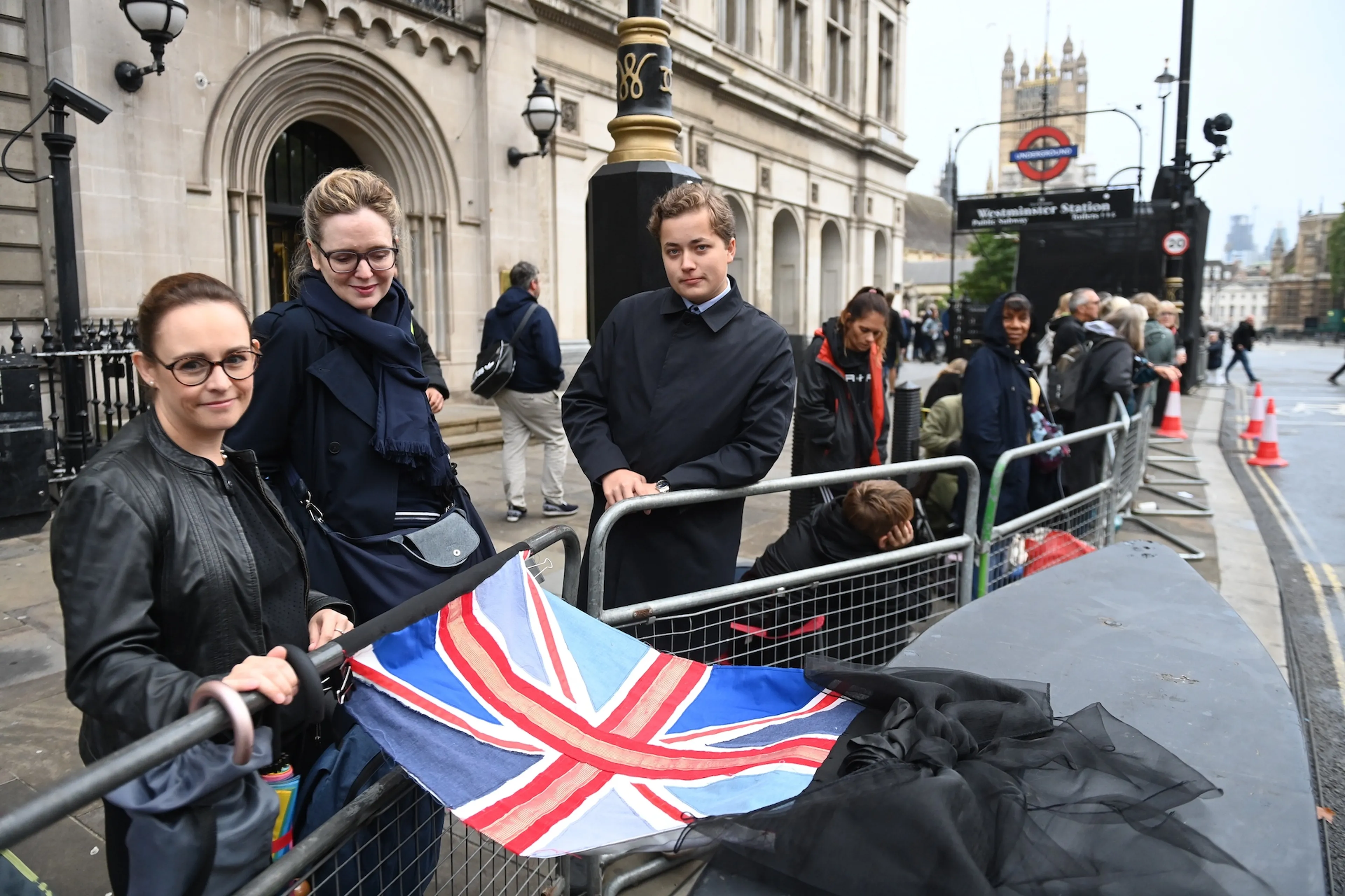 Alle plekken langs de route die de kist van koningin Elizabeth aflegt zijn vol. Er worden geen nieuwe mensen toegelaten op de weg tussen Buckingham Palace en Westminster Hall.