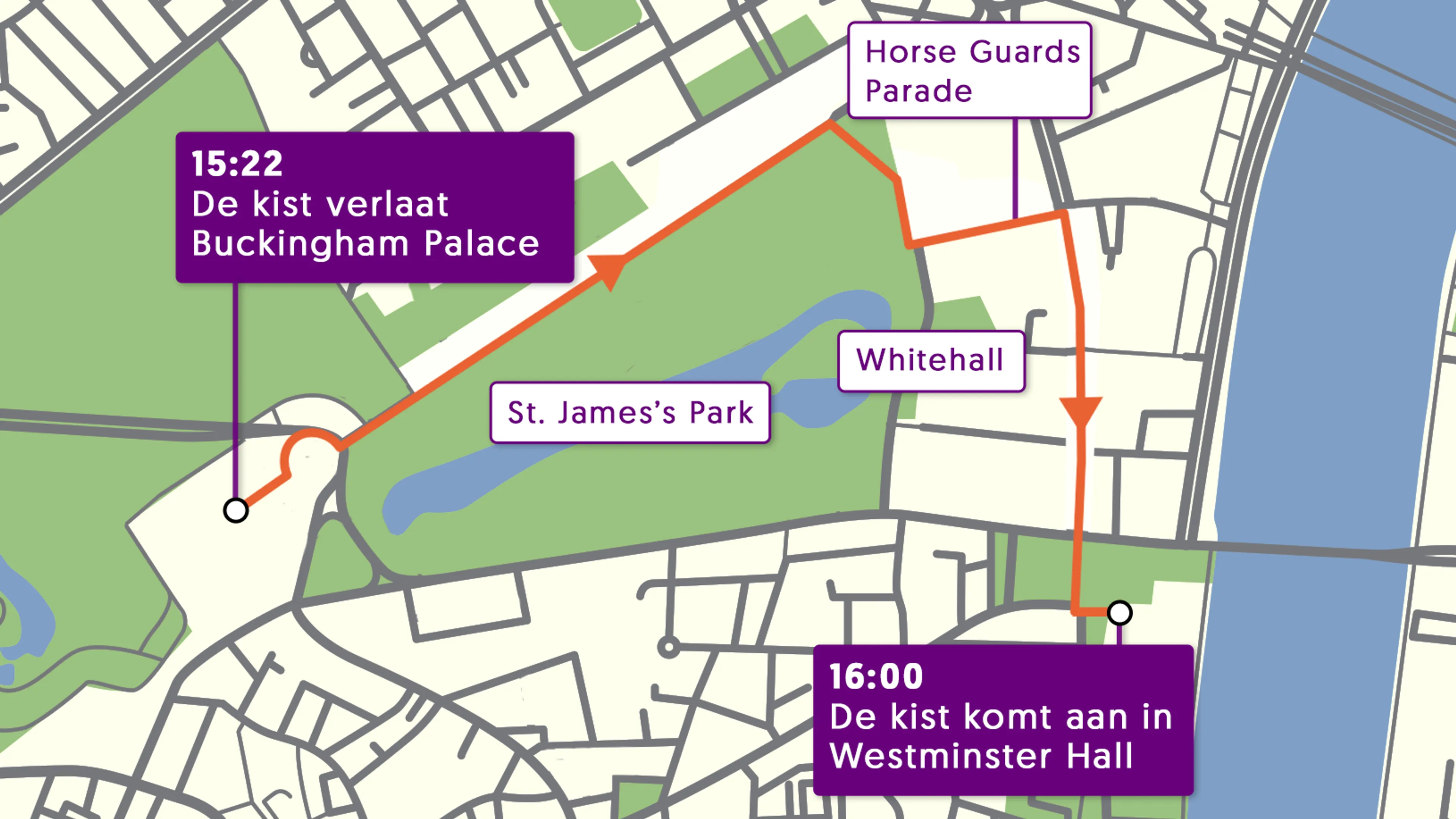 De kist van de koningin ligt bovenop een geweerkoets, die door paarden door de straten van Londen wordt getrokken. De processie begon om 14.22 uur lokale tijd bij Buckingham Palace en zal om 15.00 uur aankomen in Westminster Hall, een historische zaal in het Britse parlementsgebouw. Daar zal de kist liggen tot maandag, de dag van de staatsbegrafenis.