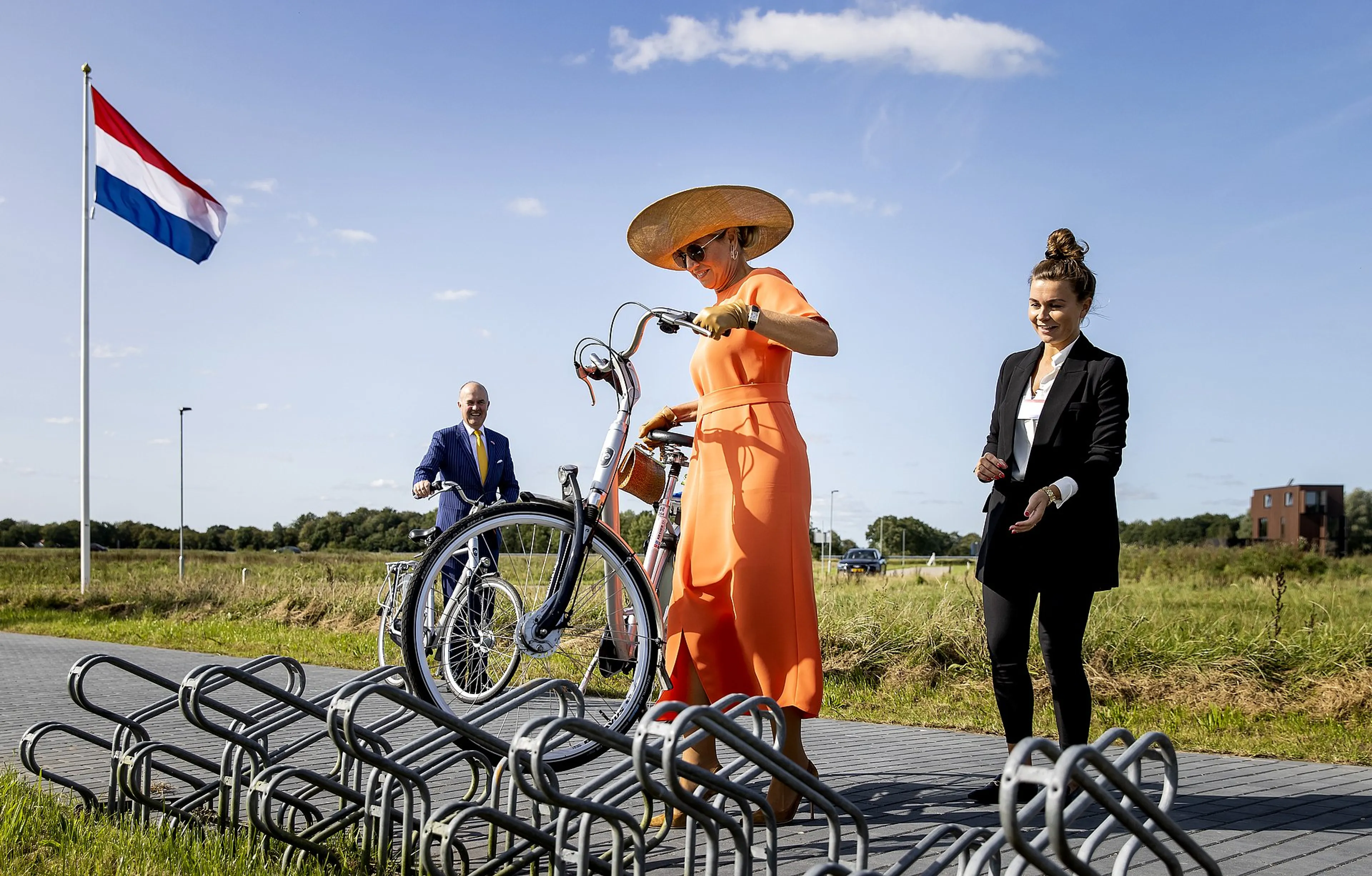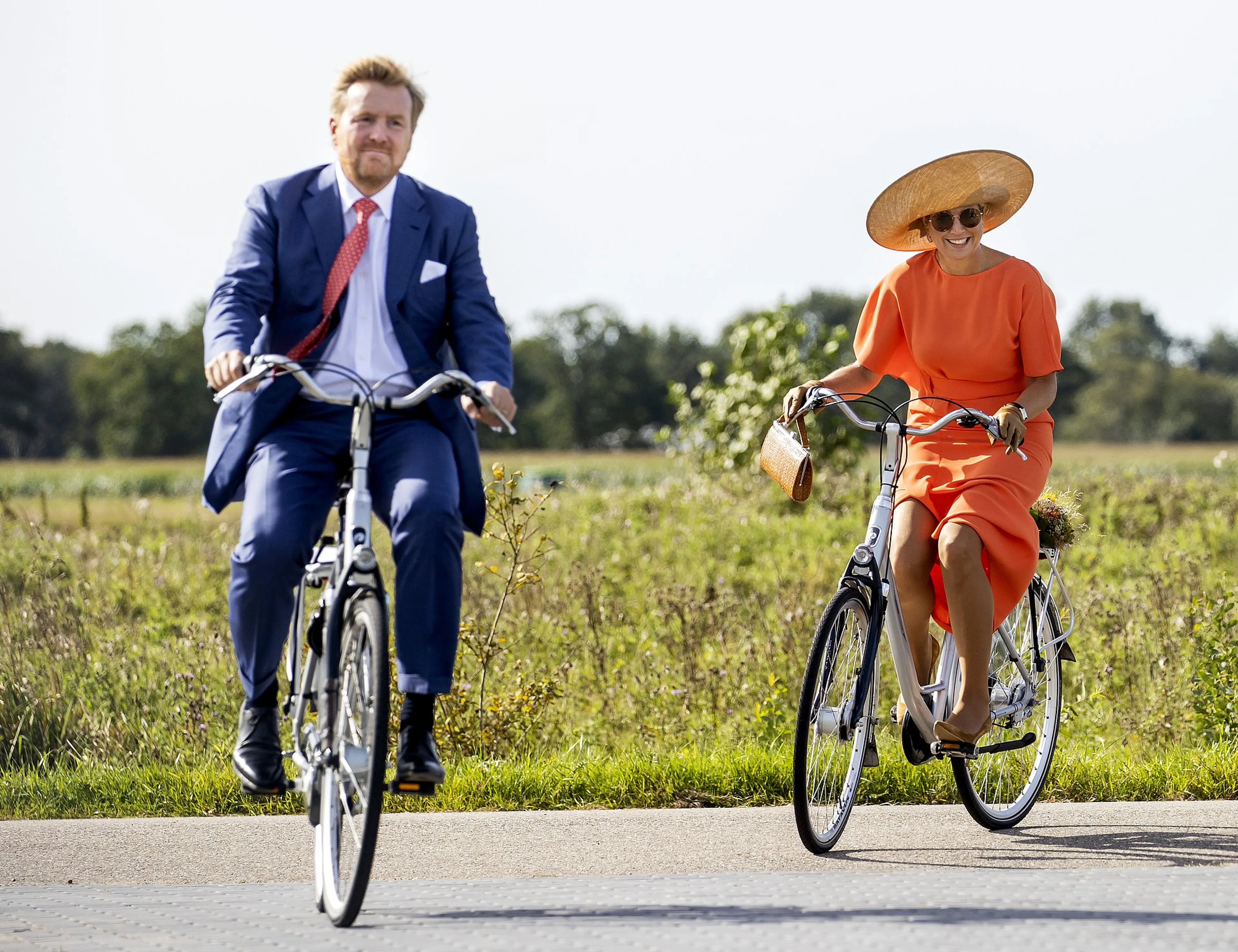 Met de fiets verplaatst het koningpaar zich naar het Biosintrum.