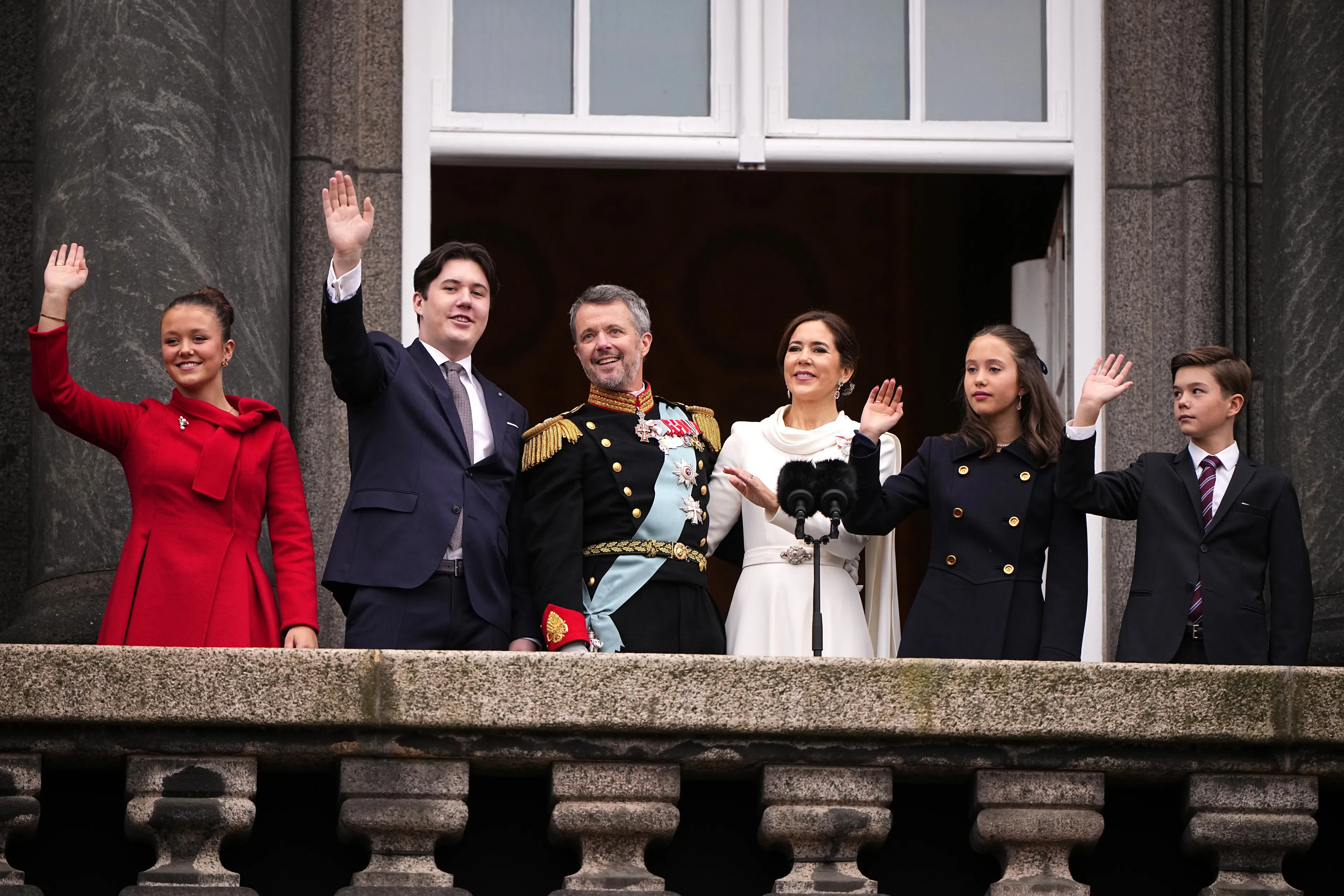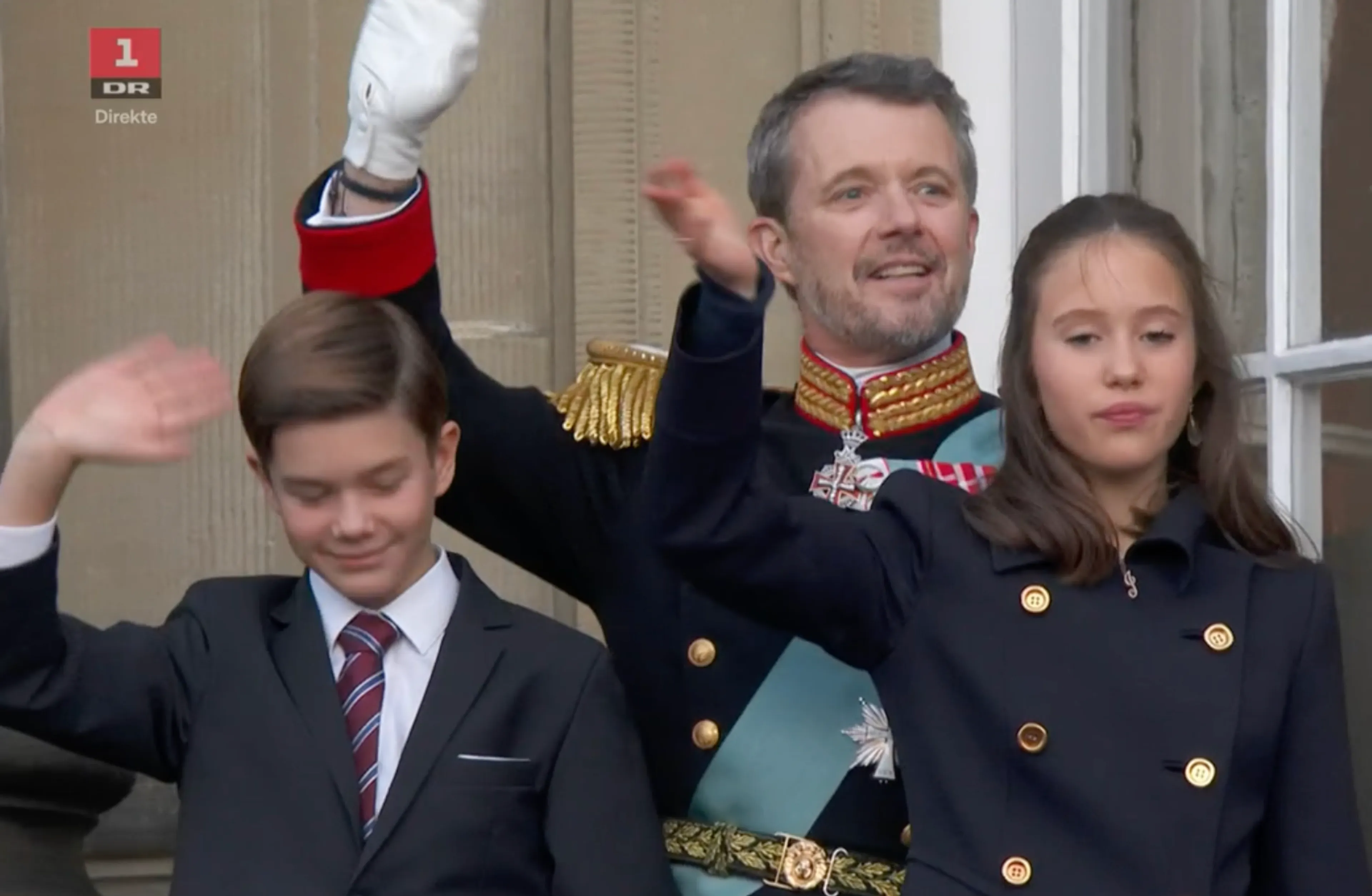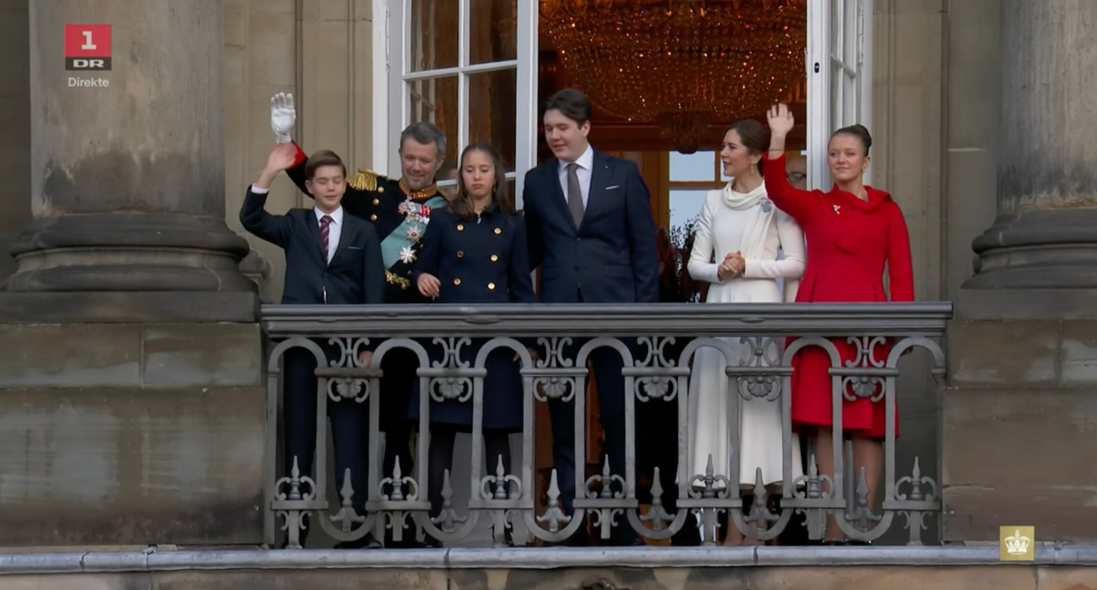 Na de speech van koning Frederik X sluit koningin Mary aan op het balkon. Vervolgens zwaaien ook de kinderen van het koningspaar naar het publiek. Onder luid gejuich en gejoel worden het nieuwe koningspaar en hun gezin ontvangen in Kopenhagen.