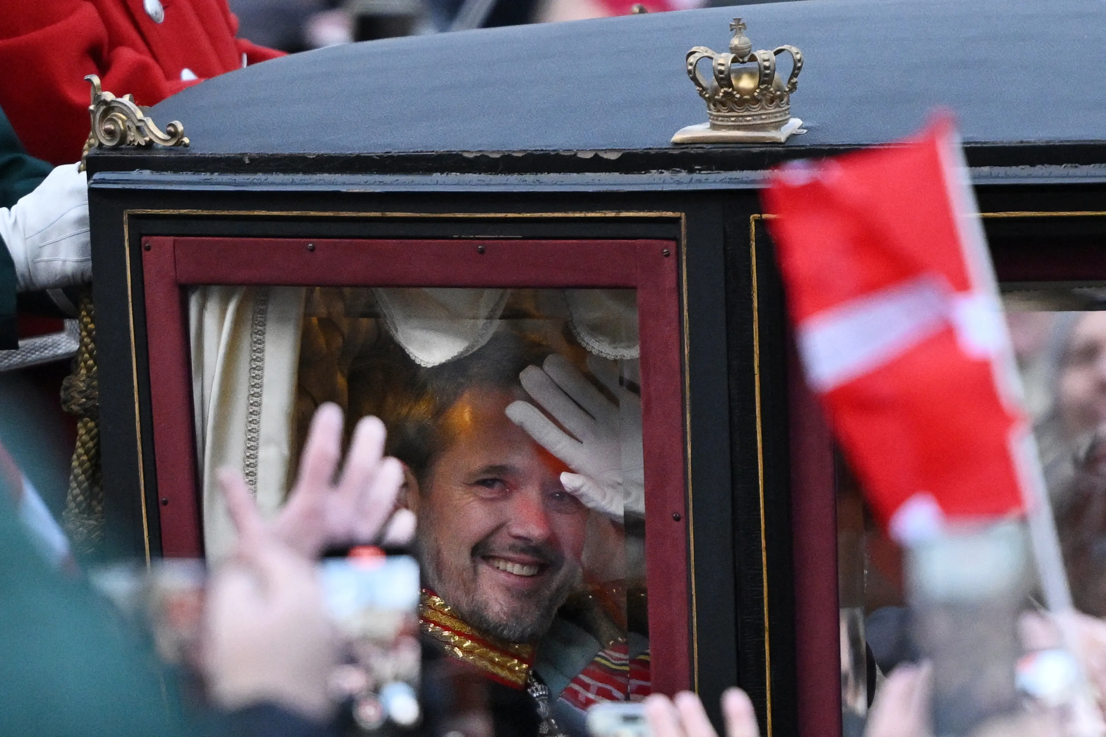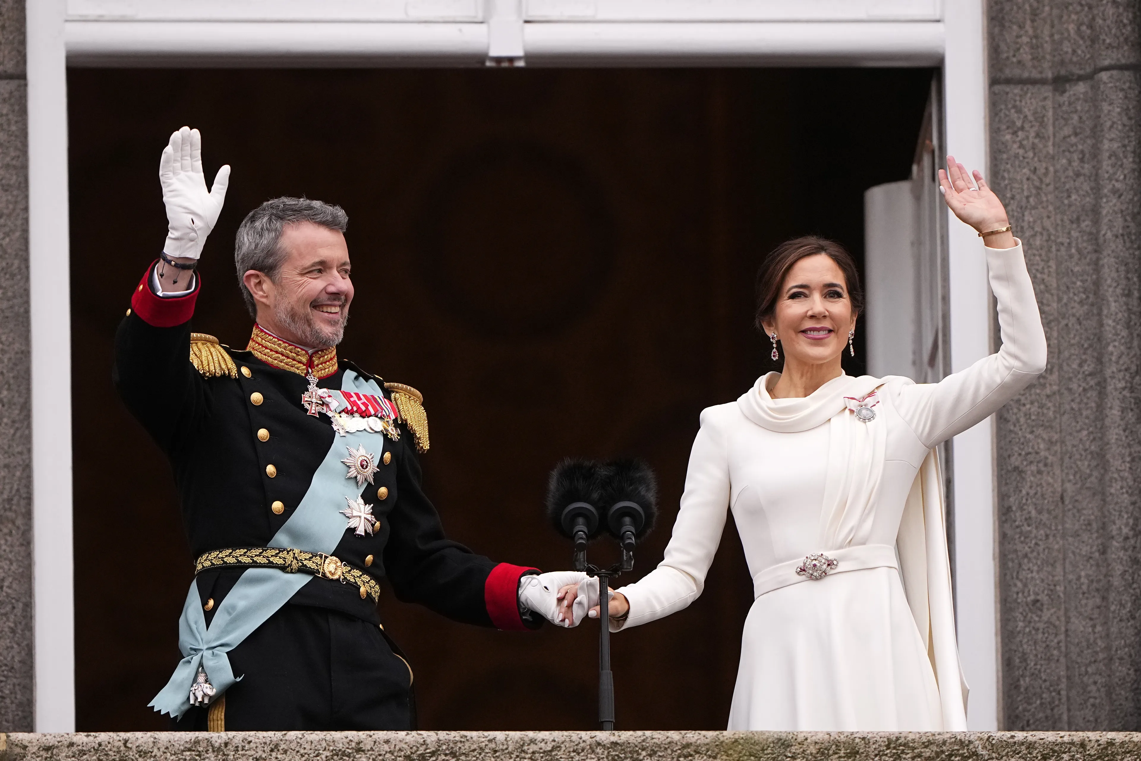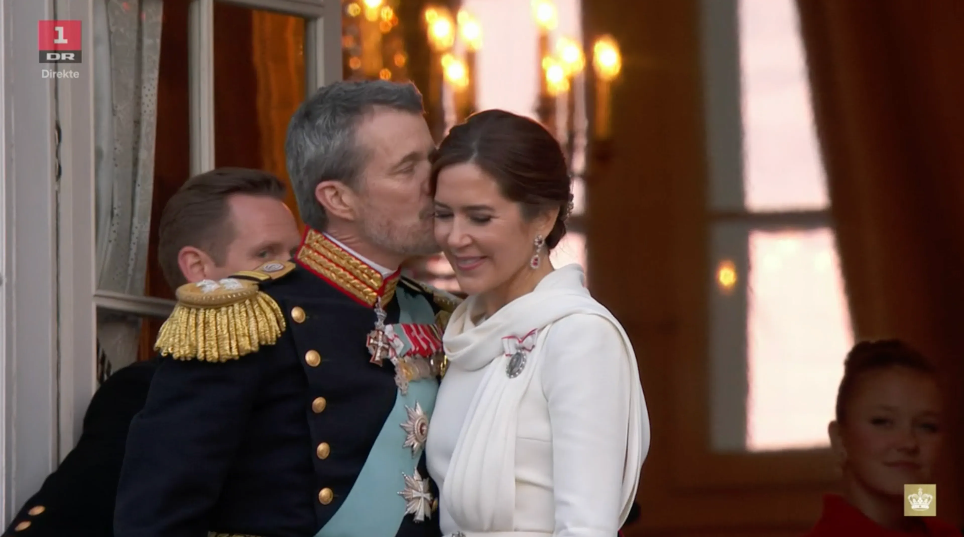 Na de speech van koning Frederik X sluit koningin Mary aan op het balkon. Vervolgens zwaaien ook de kinderen van het koningspaar naar het publiek. Onder luid gejuich en gejoel worden het nieuwe koningspaar en hun gezin ontvangen in Kopenhagen.