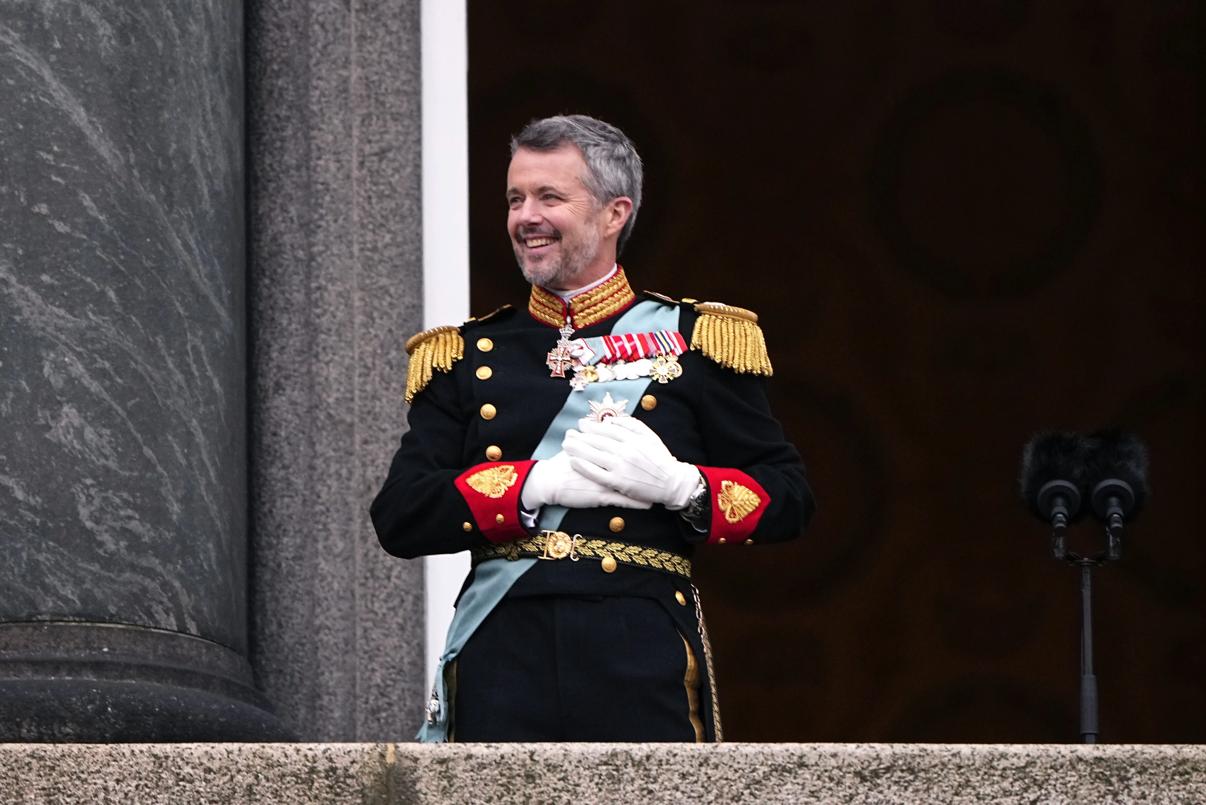 Koning Frederik verschijnt op het balkon van Paleis Christiansborg onder luid gejuich. Hij is duidelijk geëmotioneerd door het enthousiasme van het publiek en pinkt zelfs een traantje weg. De koning geeft een speech en zet daarvoor speciaal zijn bril op. Over de eerder zondag afgetreden Margrethe, zijn moeder, zei Frederik: "Ze zal altijd herinnerd worden als een buitengewone koningin." Over zijn eigen koningschap sprak Frederik de hoop uit dat hij een koning wordt die kan verbinden. "Het is een taak die ik met trots, respect en vreugde op mij heb genomen."