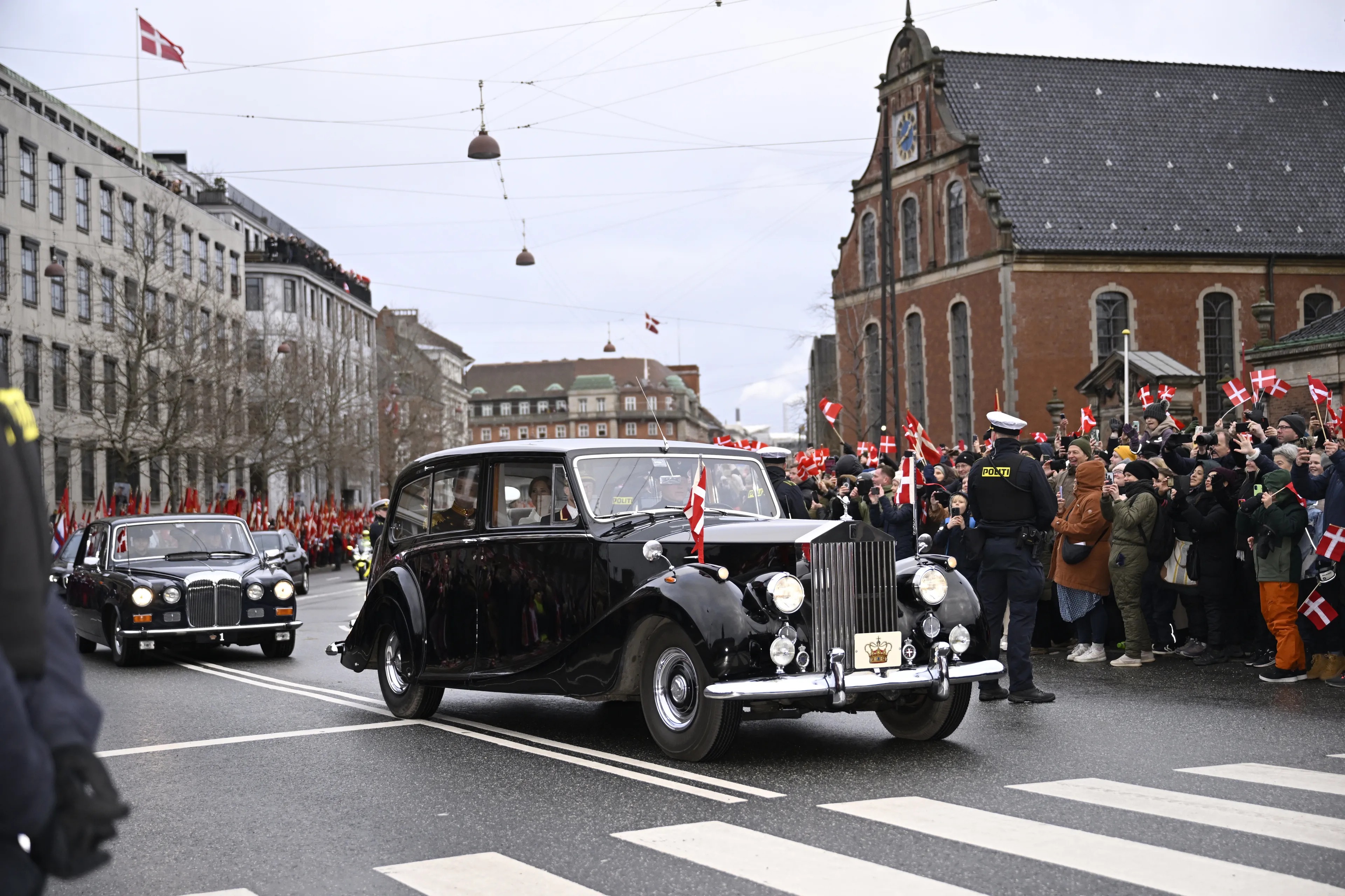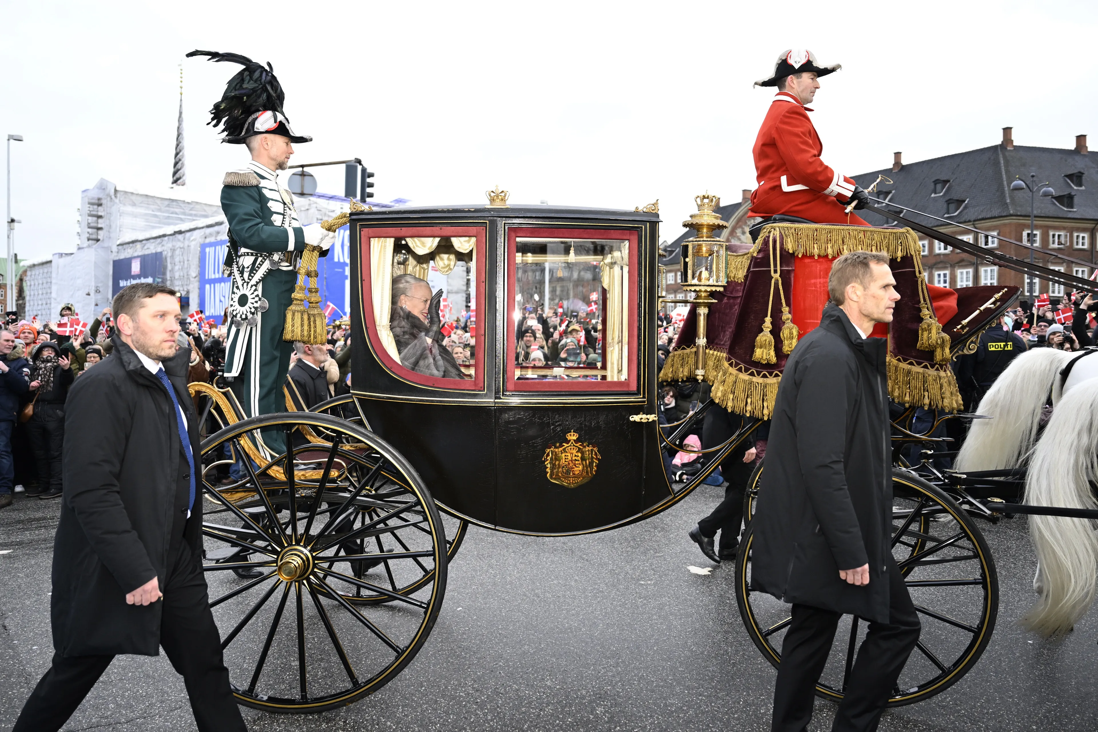 Koningin Margrethe heeft haar laatste koetsrit als koningin erop zitten. De 83-jarige vorst is gearriveerd bij paleis Christiansborg onder luid gejuich van het toegestroomde publiek. Te zien is hoe koningin Margrethe een bekende jas draagt, namelijk een warme jas vervaardigd van bont. Hierna gaat koningin Margrethe naar een vergadering van de Raad van State waar de abdicatieverklaring wordt ondertekend.