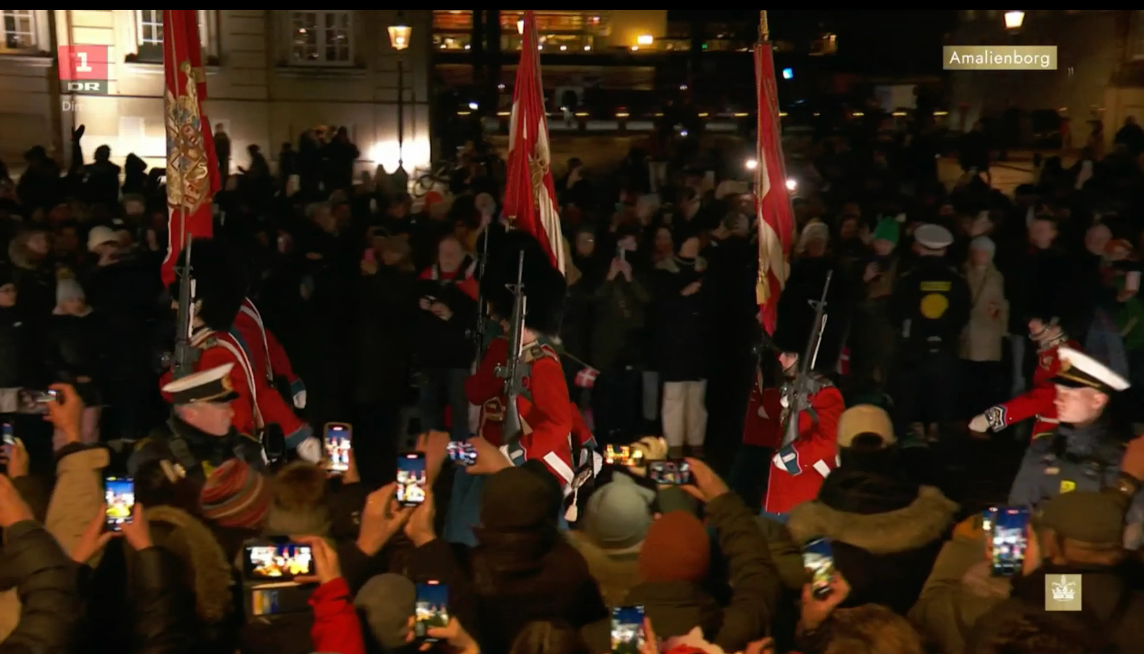 De koninklijke vaandels worden overgedragen van het woonpaleis van koningin Margrethe naar het paleis van Frederik VIII, de plek op Amalienborg waar koning Frederik en koningin Mary wonen. Deze handeling markeert het einde van de troonswisseling in Denemarken.